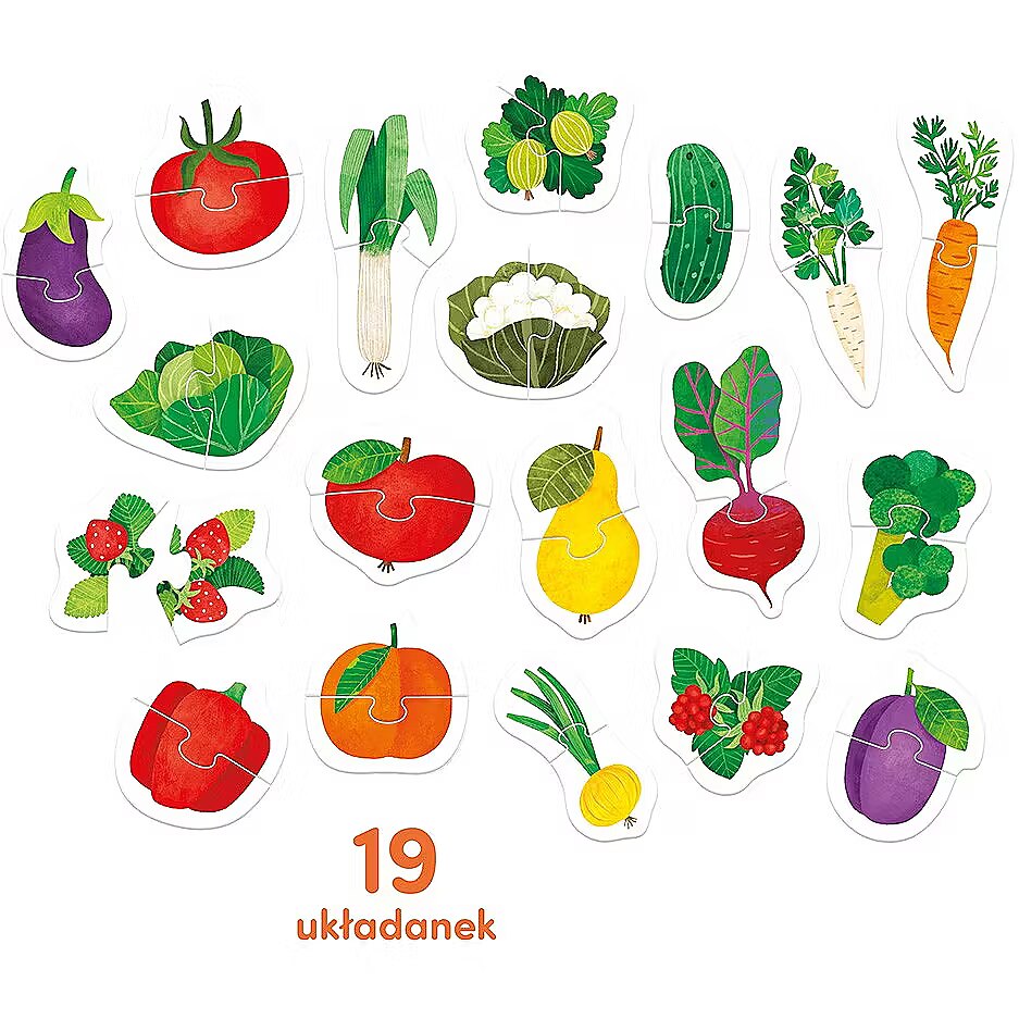 Description - Puzzle Pair Puzzle - Fruits and Vegetables Time for some delicious fun - find and match the halves of vegetables and fruits! The brightly colored puzzles present healthy delicacies from the garden and orchard. Finding and matching the halves is a comprehensively developing game that improves hand-eye coordination and allows you to learn and consolidate new words and knowledge about the world around us in a fun way. A unique feature: puzzles inspire comprehensively developing games. Hey, kids! Do you know what grows in the garden and orchard? The Fruits and Vegetables Pair Puzzle is an educational set that contains 19 colorful, two-piece puzzles! Have fun together in many ways: Put together the puzzle Finding matching halves improves your observation skills. Matching them is a great exercise for fine motor skills. You can start by playing with a smaller number of puzzles and gradually increase their number. Learn new words Use the game to learn new words. Name the fruits and vegetables in the illustrations, their colors and individual elements. Draw your child's attention to the similarities and differences between the pictures. Riddles Ask your child various questions. What is red? What can you make soup from? Which leaves can you eat? Your toddler can answer or show the answers with his or her finger. Switch roles! What is it? Was ist das? You can also use the pictures to learn another language. Cooking together Compare the illustrations with real fruits and vegetables. It's time to get to know them with all your senses: touch, smell and taste. Get inspired and prepare something delicious together. Older children can use the elements to create their own illustrations. The elements will be useful when playing shop and cooking. Delicious fun, start!