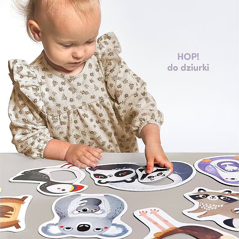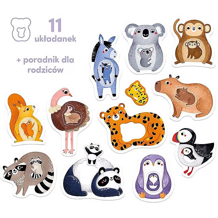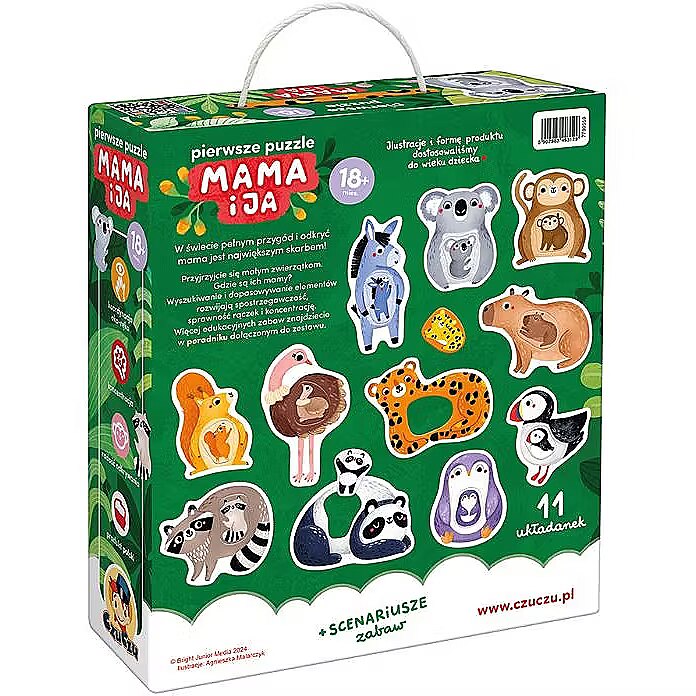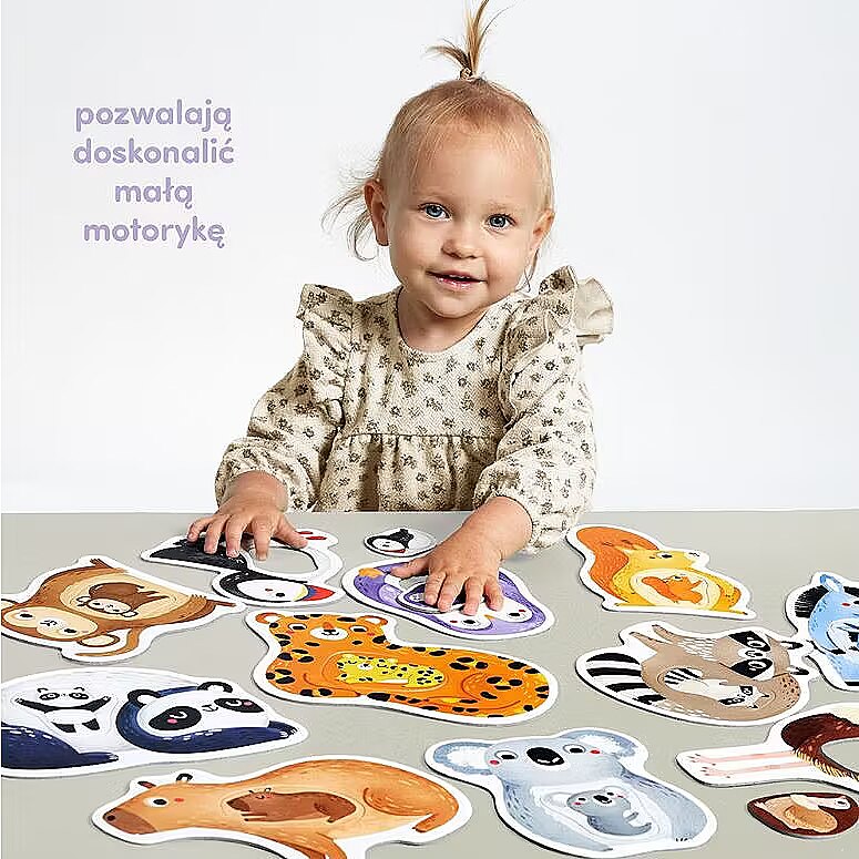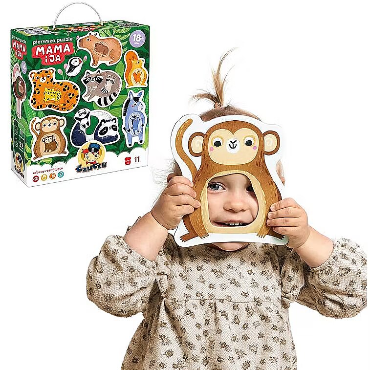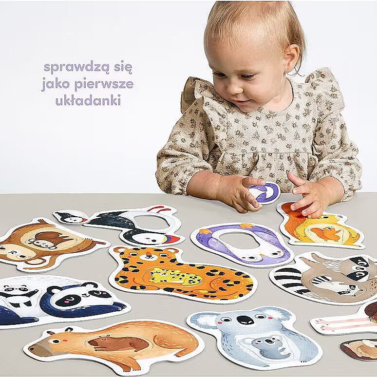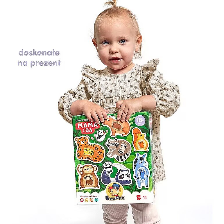 Description - The first Mummy and Me jigsaw puzzle is a unique educational set for the youngest explorers and a sensational idea for first puzzles. It consists of 11 large 2-piece puzzles with a hole. The fun is in matching elements of different shapes to the holes. Animals are one of the most favourite subjects for toddlers. The charming illustrations inspire lots of all-round play. Ideas for these can be found in the guide included in the set, and here are some of the possibilities: Put together a jigsaw puzzle This is a great way to spend time together. And because it requires focus and precision, it is great for developing manual skills, imagination and perceptiveness. Learn new words. What are the names of the animals? And their colours, body parts? Talking about what you see in the pictures is a great way to learn new words and build a shared field of attention! Who is small and who is big? How are toddlers different from their parents, and how are they similar? Draw your child's attention to the differences and similarities between the characters in the illustrations. Make up stories about animals. Draw favourite animals. Find images of them in favourite books and learn something new about them. Let your imagination run wild!