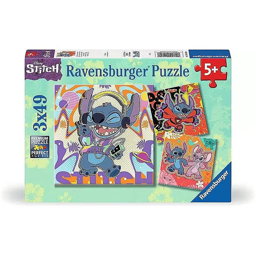 Description - Puzzle 3x49elementów Stitch Puzzle 3x49 elementów Ravensburger to zestaw 3 układanek (po 49 elementów) przedstawiających bohaterów bajki Disneya Stitcha. 3 układanki z motywami z bajki Lilo i Stitch (każda układanka składa się z 49 elementów). Produkt przeznaczony dla dzieci od 5. roku życia. Ravensburger jest największym producentem puzzli na świecie, które wytwarza od ponad 130 lat. Puzzle marki Ravensburger posiadają antyrefleksyjną powłokę - są wykonane z opatentowanego, grubego kartonu z miękką podściółką (obrazek nadrukowany jest na papierze o strukturze włókna lnu, które ogranicza odbijanie światła, ułatwia układanie, a sam obrazek, niezależnie od wielkości puzzli, jest wyraźniejszy). Ponadto dzięki opatentowanej technologii SoftClick każdy pojedynczy element puzzli Ravensburger ma unikalny kształt i pasuje wyłącznie w jedno miejsce. Kształty puzzli są różnorodne dzięki ręcznie wykonanej sztancy. Puzzle Ravensburger są odporne na zginanie.
