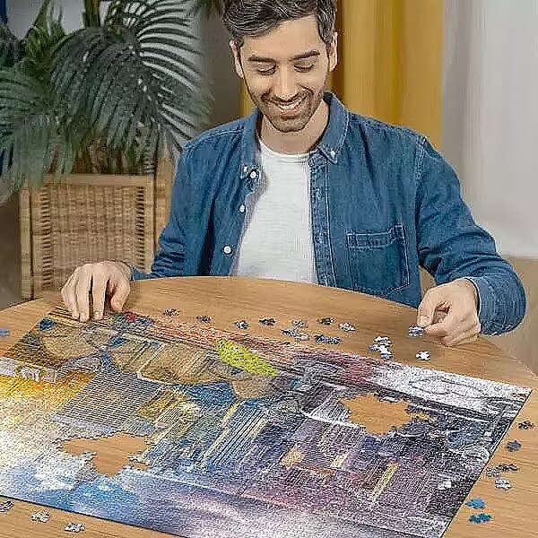 Description - Puzzle 1500 elementów Ravensburger z motywem: Nowy Jork w lecie i zimie Po ułożeniu puzzle mają wymiary 80 x 60 cm. Są przeznaczone dla osób powyżej 14. roku życia. Ravensburger jest największym producentem puzzli na świecie, które wytwarza od ponad 130 lat. Puzzle marki Ravensburger posiadają antyrefleksyjną powłokę - są wykonane z opatentowanego, grubego kartonu z miękką podściółką (obrazek nadrukowany jest na papierze o strukturze włókna lnu, które ogranicza odbijanie światła, ułatwia układanie, a sam obrazek, niezależnie od wielkości puzzli, jest wyraźniejszy). Ponadto dzięki opatentowanej technologii SoftClick każdy pojedynczy element puzzli Ravensburger ma unikalny kształt i pasuje wyłącznie w jedno miejsce. Kształty puzzli są różnorodne dzięki ręcznie wykonanej sztancy. Puzzle Ravensburger są odporne na zginanie.