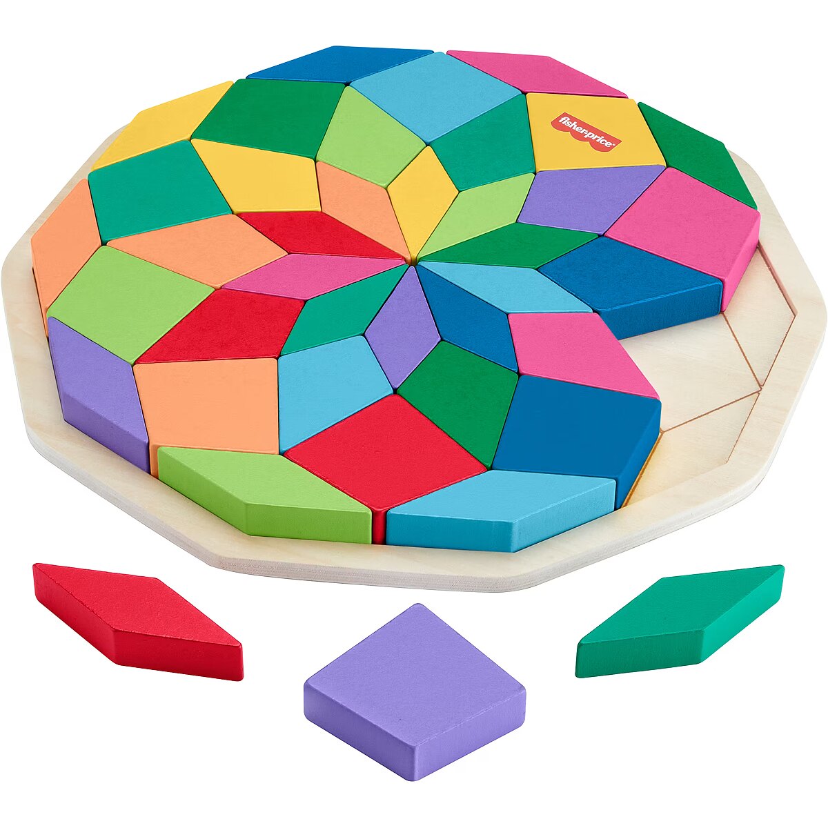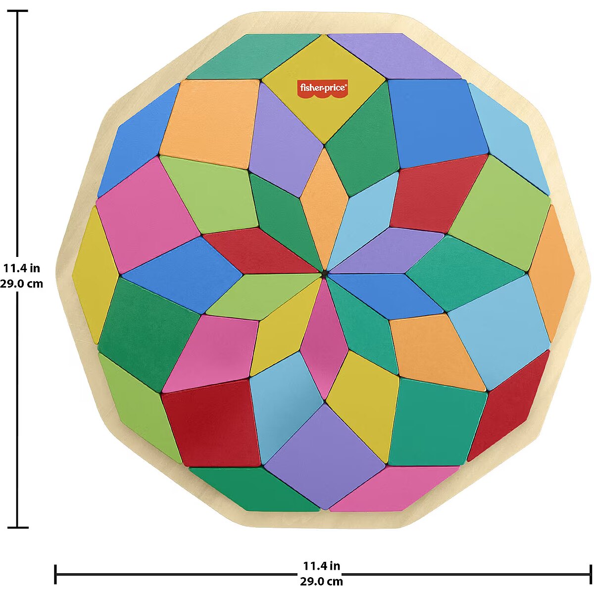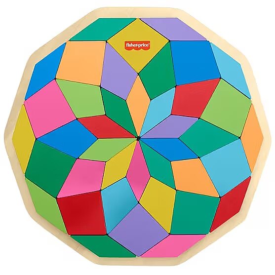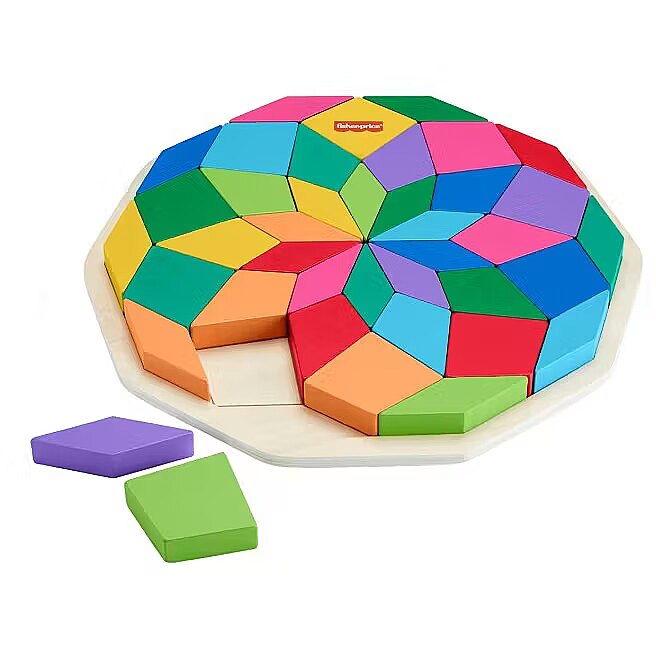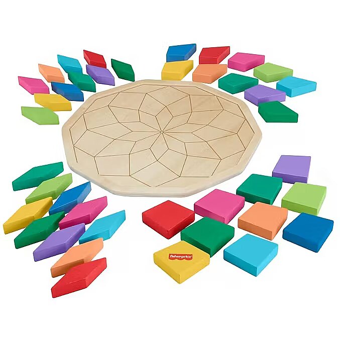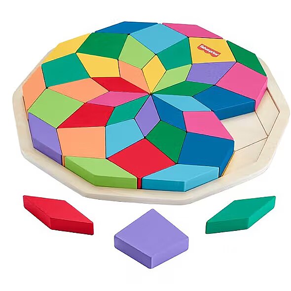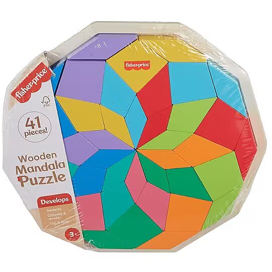 LongDesc - Challenge your child’s problem-solving skills with colourful puzzle play with this Wooden Mandala puzzle from Fisher-Price. This colourful puzzle includes 40 shape pieces and a tray with guidelines to help kids sort the shapes into the correct slots to complete the geometric Mandala design. As kids work to complete the puzzle, they’ll be exercising their hand-eye coordination and attention skills. Made with wood from Forest Stewardship Council-certified sources (FSC-N004566) and decorated with non-toxic, water-based paints. Colours and decorations may vary.