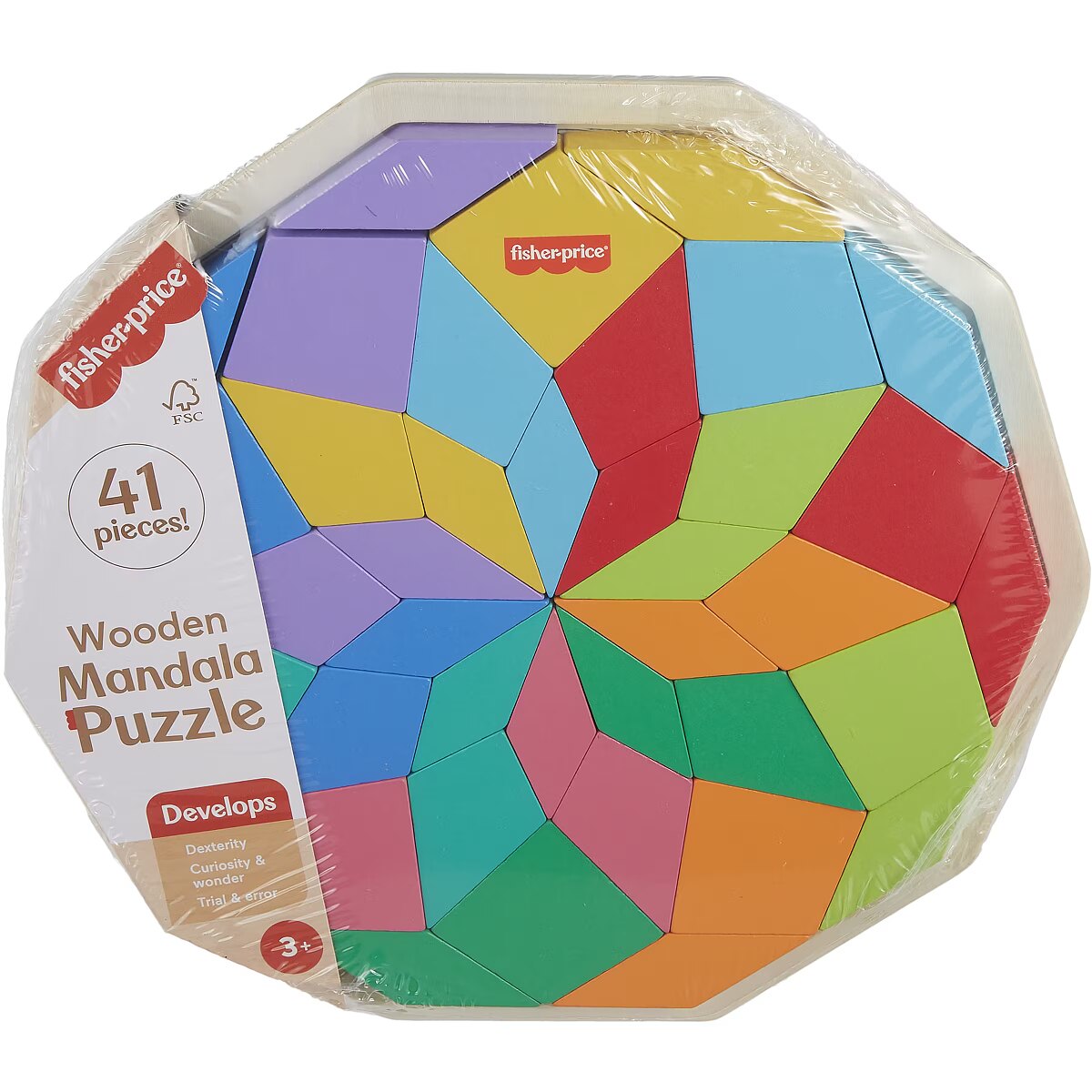 LongSummaryDescription - Fisher-Price Wooden Mandala Geometric Puzzle for Toddlers & Kids, 40 Wood Pieces. Recommended age (min): 3 yr(s), Recommended age (max): 99 yr(s), Minimum number of players: 1, Material: Wood, Product colour: Multicolour