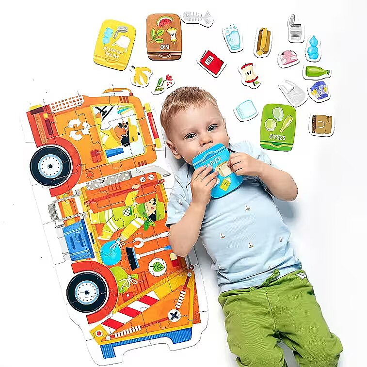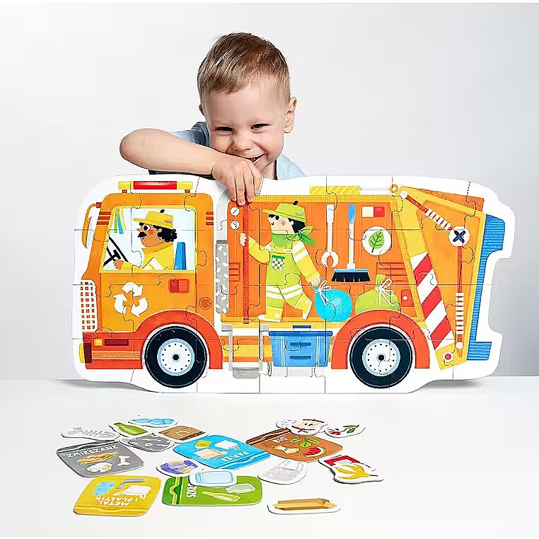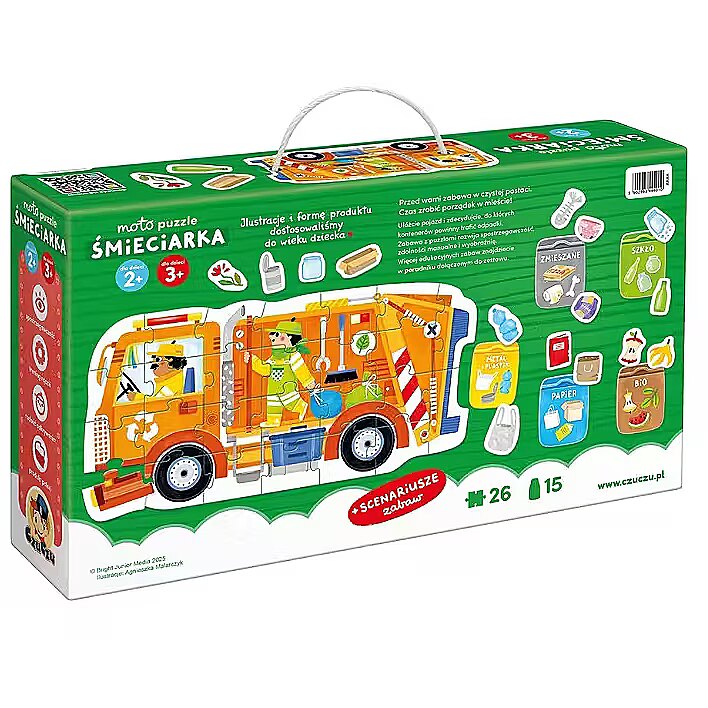 Description - Moto puzzle Śmieciarka to wyjątkowy zestaw edukacyjny dla ciekawych świata odkrywców. W prezentowym pudełku znajdziecie duży puzzlowy wóz składający się z 26 elementów i dodatkowe obrazki do dokładania: 5 kontenerów i 15 śmieci. Wspaniała śmieciarka i ciekawa tematyka inspiruje do mnóstwa kreatywnych zabaw i pozwala na wesoło poznawać zasady segregacji śmieci i ekologii. Do zestawu dołączyliśmy poradnik pełen pomysłów na zabawy, oto niektóre z nich: Ułóżcie puzzle ze śmieciarką Ta przyjemna zabawa fantastycznie rozwija mała motorykę, spostrzegawczość i logiczne myślenie. Poznajcie zasady segregacji śmieci Pierwsza lekcja ekologii na wesoło! Zobaczcie, do czego służą kontenery o różnych kolorach. Zorientujcie się, czym różnią się od siebie różne śmieci, i co gdzie się wyrzuca i dlaczego? Nazywajcie to, co widzicie na ilustracji To doskonały sposób na poszerzanie słownictwa, także w obcym języku. Narysujcie własną śmieciarkę i jeszcze więcej śmieci. Pamiętajcie, by segregować śmieci na co dzień! Zabawa start!