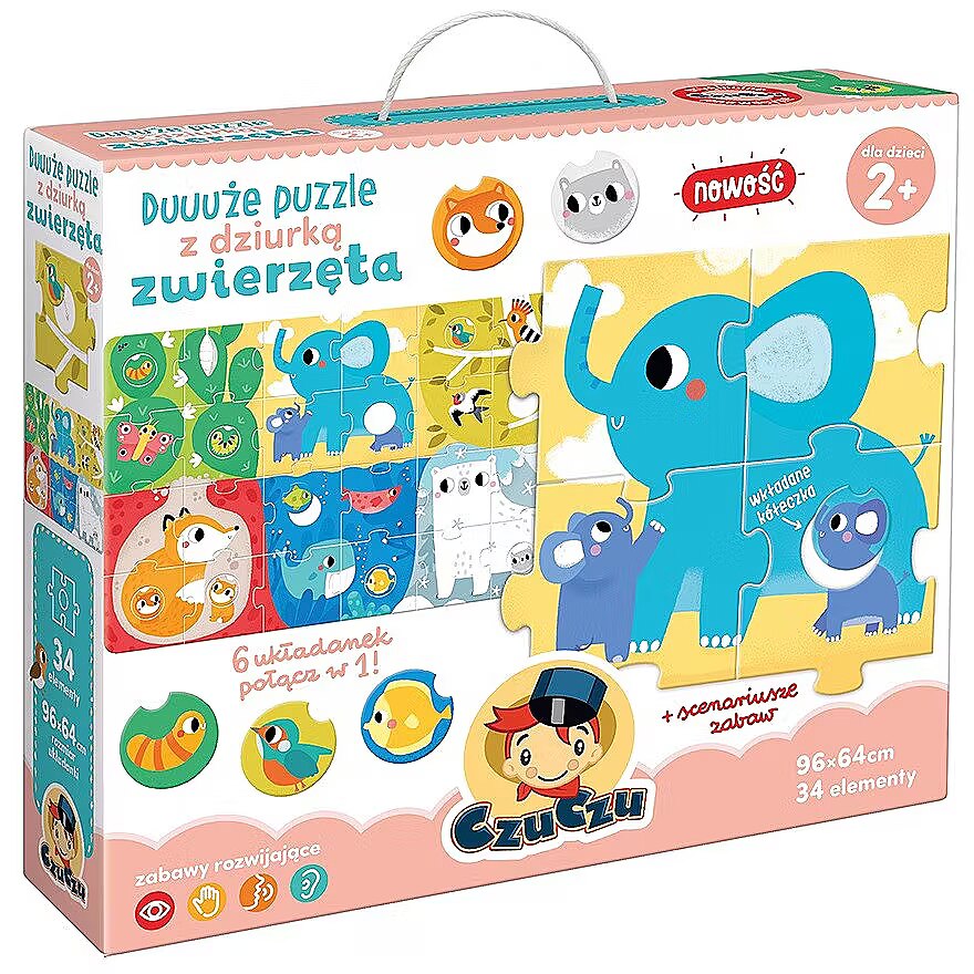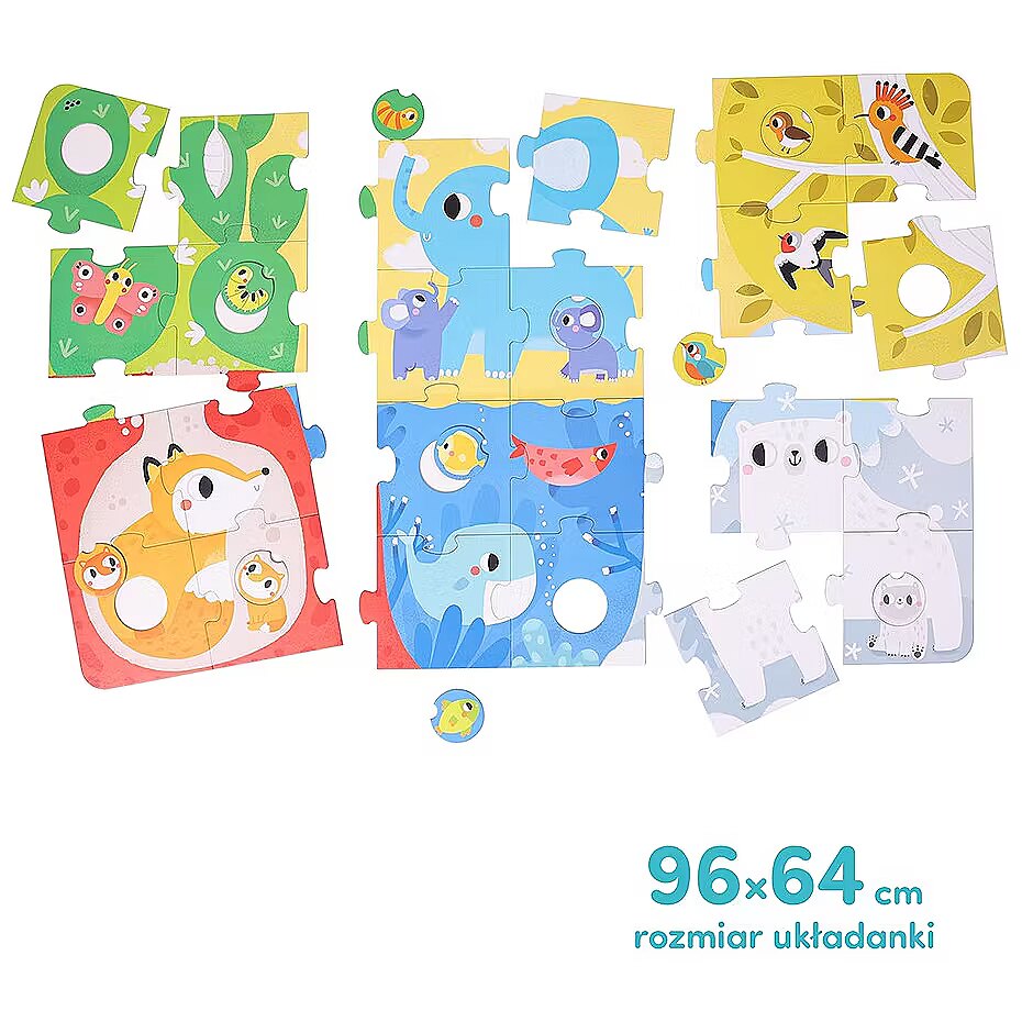 Description - Big hole jigsaw puzzle Animals Meet the inhabitants of different parts of the world! This jigsaw puzzle has everything children love: friendly animals and interchangeable circles. The educational puzzle of impressive size is colourful and beautifully illustrated. Comprising traditional puzzles and wheels that can be rearranged at will, the set allows for plenty of all-round play. Putting the picture together is just one of them! More ideas can be found in the accompanying activity guide. The set is perfect for the home, nursery or kindergarten. Who will you invite to play with you? A unique feature: the wheels can be interchanged at will. The large and durable pieces are tailored to fit little hands.