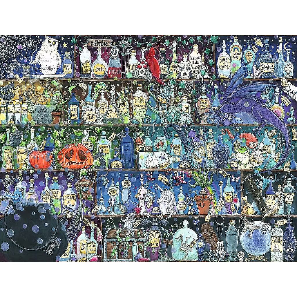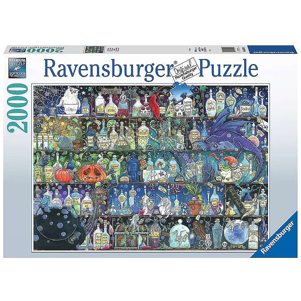 Description - Puzzle 2D 2000 elementów Trucizny i mikstury Puzzle firmy Ravensburger, charakteryzują się wysoką jakością. Przez ponad 100 lat cieszą dzieci i dorosłych na całym świecie. Perfect Age Fit to cecha, która dopasowuje wielkość elementów do możliwości charakterystycznych dla danego wieku rozwojowego, a SoftClick Technology pozwala precyzyjnie złożyć obraz. Idealne kształty, a także szeroka oferta motywów sprawiają, że znajdzie tu coś dla siebie pasjonat układanek w każdym wieku. Puzzle Ravensburger pozwalają nabywać cenne umiejętności, wykorzystując funkcję nauki poprzez zabawę. Układanie puzzli wspomaga koncentrację, uczy spostrzegawczości i cierpliwości. Seria puzzli 2000 elementów Ravensburger przedstawia unikalne wzory, ciekawe do układania. Zawartość i cechy zestawu: Układanka z ilustracją z motywem trucizn i mikstur Ilość elementów: 2000 elementów Wyraźne motywy na puzzlach dzięki zastosowaniu struktury naturalnego lnu Przeznaczone dla dzieci od lat 14
