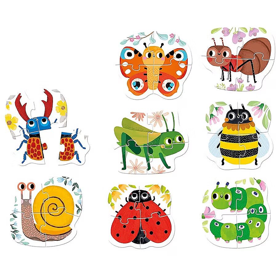 Description - Four-legged Worms Puzzle What's in the grass? Cute little bugs invite you to join the adventure with puzzles! In a handy box lived 8 nice insects and other tiny inhabitants of the meadow and garden. Each consists of 4 large elements. The form of the product and beautiful illustrations make the set perfect as the first few-element puzzles for children who continue their adventure with more and more difficult puzzles. Puzzles inspire to many different games. They are fantastic for home, travel and play together. Perfect the skill of arranging increasingly difficult puzzles with the new series: Step 1: Pair Puzzle Animals in the Countryside Step 2: 4 Piece Puzzles Worms Four Step 3: Progressive Puzzle Construction site vehicles and Animals in the forest. Unique feature: Large and durable pieces are sized to fit little hands. Puzzles encourage play in a variety of ways. Have fun and practice different skills.
