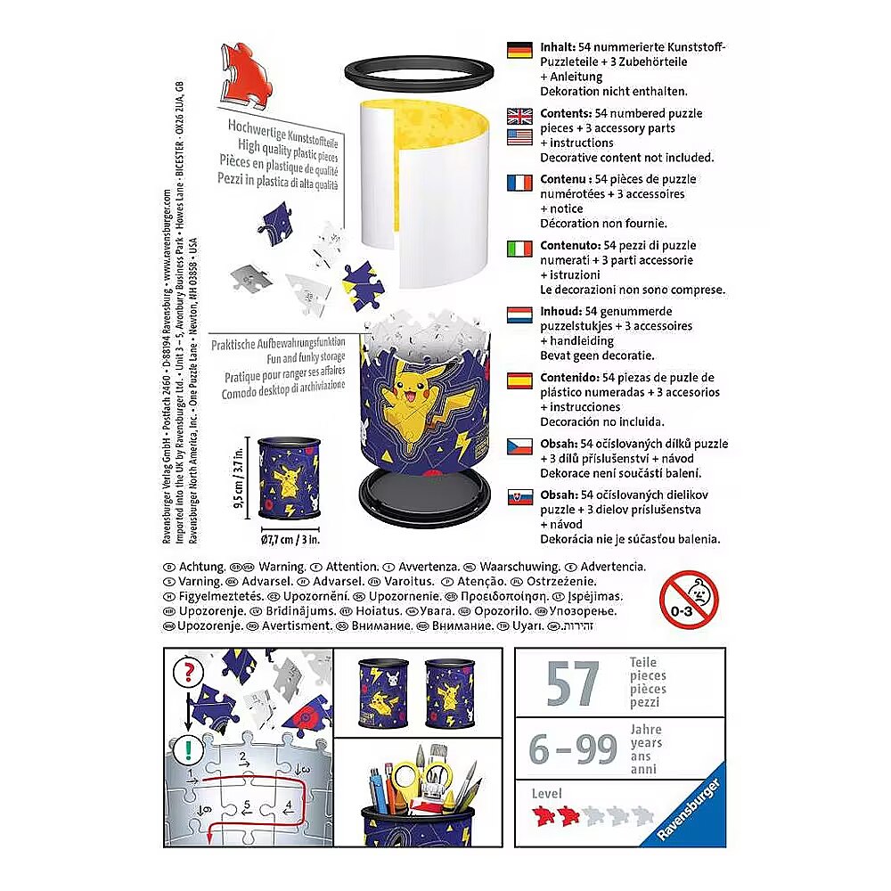 Description - Puzzle 3D Przybornik Pikachu 57 elementów Twórz wyjątkowe konstrukcje 3D z puzzlami 3D od firmy Ravensburger! Odkryj nowy, trójwymiarowy sposób układania puzzli. Elementy tych puzzli zostały wykonane ze sztywnego tworzywa sztucznego, które pozwala na utrzymanie się konstrukcji bez użycia kleju. Ułożone przedmioty nie rozwarstwiają się, a puzzle mocno trzymają się siebie. Materiał użyty do produkcji klocków jest łatwy w czyszczeniu, wystarczy użyć wilgotnej szmatki. Przybornik z motywem Pikachu to konstrukcja dla fanów kultowej gry z puzzli 3D, która łączy przyjemne z pożytecznym - rozwija wyobraźnię przestrzenną, a po złożeniu służy jako ozdobny przybornik. 57 elementów puzzli Przeznaczony dla dzieci od 6-go roku życia Pojemnik po zbudowaniu ma 9.5 cm