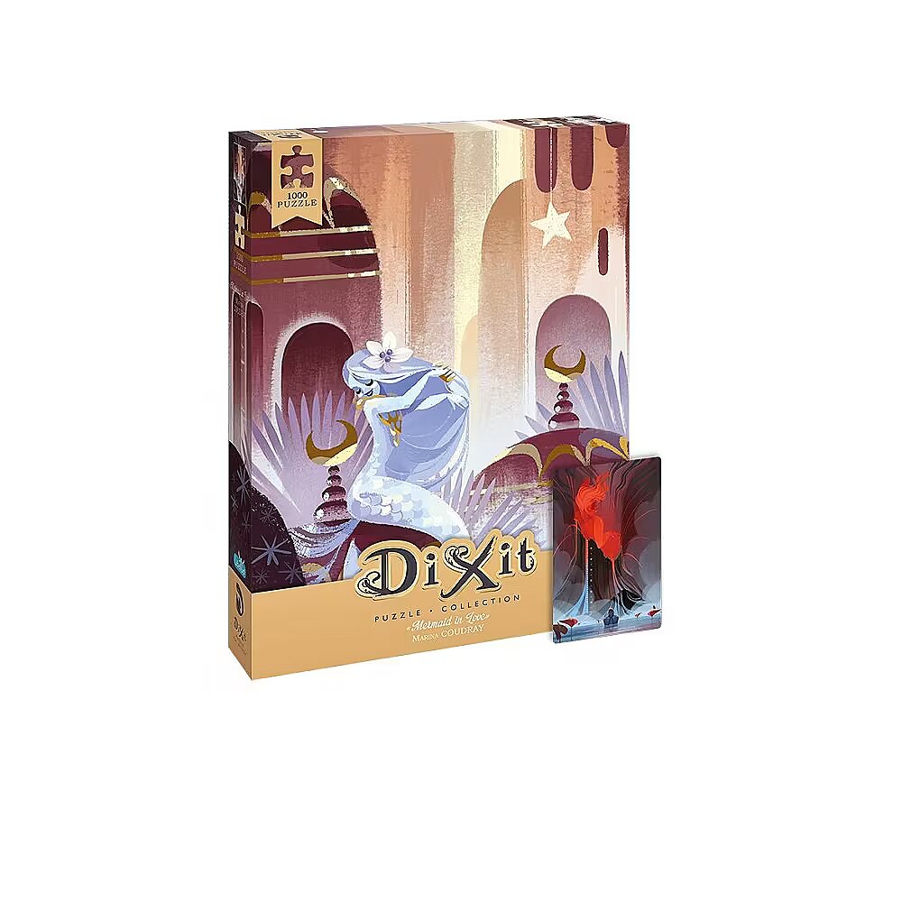 Description - Dixit: Puzzle - The Little Mermaid in Love (1000 pieces) The most beautiful illustrations from the game Dixit to put together yourself! Beautiful Dixit illustrations now available as puzzles! Step into a dreamlike world and rediscover the most popular images that capture the imagination of players all over the world. Dixit: Puzzles - Mermaid in Love is a high-quality jigsaw puzzle composed of 1,000 pieces that, when assembled, produce an image measuring 48x68 cm. The author of the illustrations is Marina Coudray, a French illustrator who created the graphics for the Dixit 7: Visions supplement. In the box, in addition to the puzzles, you will find a unique Dixit playing card, not available in any other set. What is Dixit? It is a narrative card game in which you invent and guess associations to ambiguous, richly illustrated cards. In each round, one person becomes the Storyteller - they choose any card from their hand and give a password that they think reflects the picture. This can be a single word, a whole sentence, a quote or a passage from a song or film. The players then choose one card from their hands to match the Fable's words, and then all the pictures are shuffled. The players' task is to guess which picture came first.