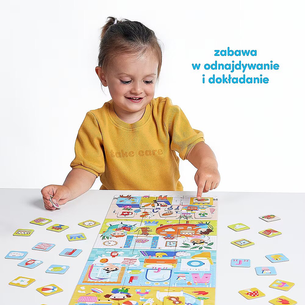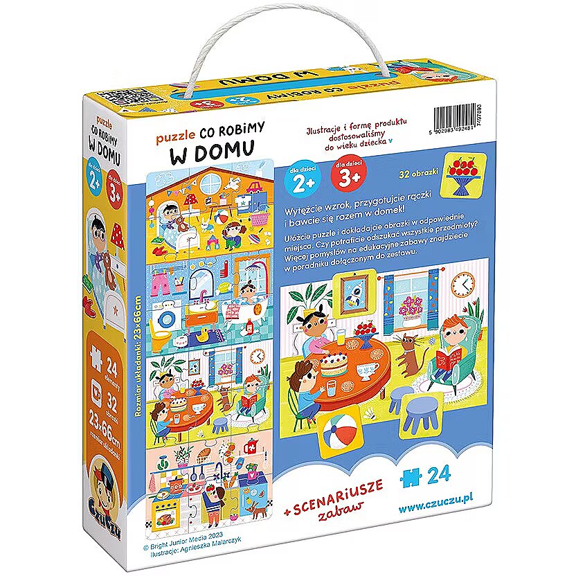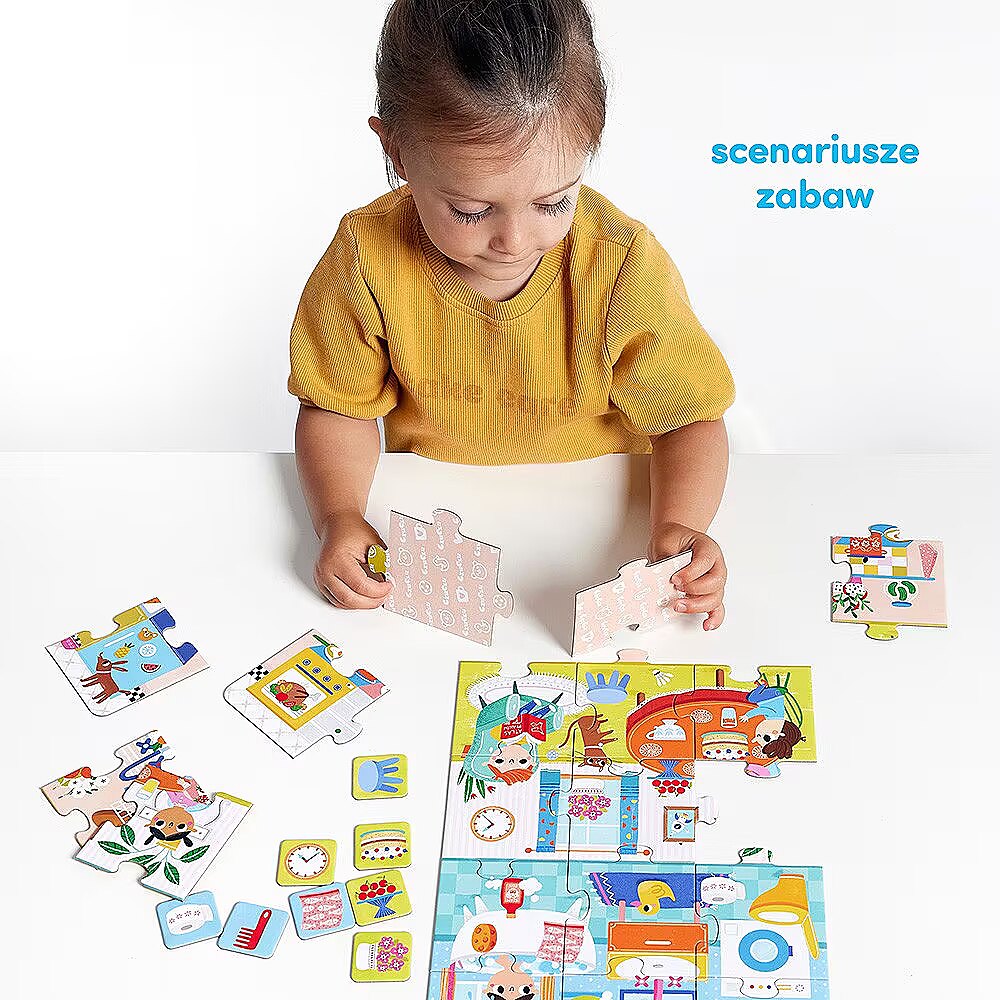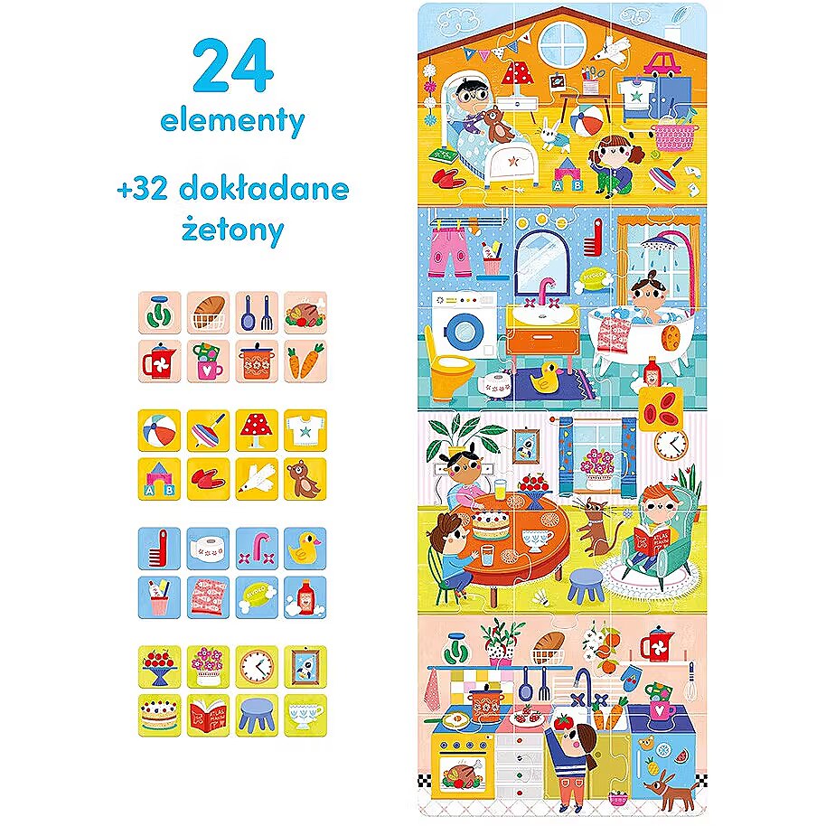 Description - Puzzle What we do at home Get your eyes sharp, get your hands ready and play house together! The fabulously colourful and large jigsaw puzzle consists of 24 pieces and depicts 4 domestic rooms: children's room, bathroom, living room and kitchen. 32 selected objects from each room are featured on the exact tiles. This allows for lots of fascinating and all-round developing games, and you will find ideas for these in the guide included with the puzzle and the pieces. The educational set is a perfect gift idea for the bright toddler and preschooler. A unique feature: it allows you to play in many ways. Puzzle What We Do at Home is a unique educational set for the youngest explorers. It consists of large 24-piece jigsaw puzzles and 32 exact pictures, plus a guide full of play ideas that can be easily adapted to children's abilities. Pay close attention to what you can see and hear in your immediate surroundings! The theme of home is well known and enjoyed by young children. Playing with this set allows two-year-olds and preschoolers to develop key skills and hone new competences in a fun-filled way. Play: Put together a jigsaw puzzle - This is a great way to spend time and a skill that requires focus and precision, improving manual skills, imagination and perceptiveness. A toddler can start by putting together individual rooms each consisting of 6 puzzles. Help your child if he needs it and be patient. Practice makes perfect! Add up the pieces - Who has a sharp eye? Who is the fastest? Who knows all the objects that are in the pictures? How about... Try it on for time! Learn new words - Name rooms, objects, colours. Or maybe something makes a certain sound - what sound? It's great exercise for your mouth, tongue and head! Tell stories about the inhabitants of the house Find objects from the pictures in your house! Draw your house - real or imaginary Build a base from chairs, quilts and blankets Let your imagination run wild and play house with us!