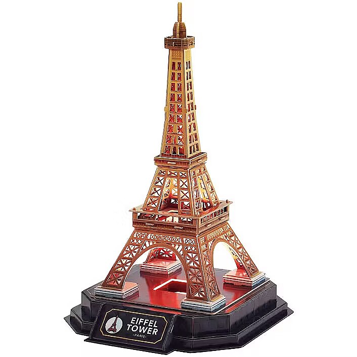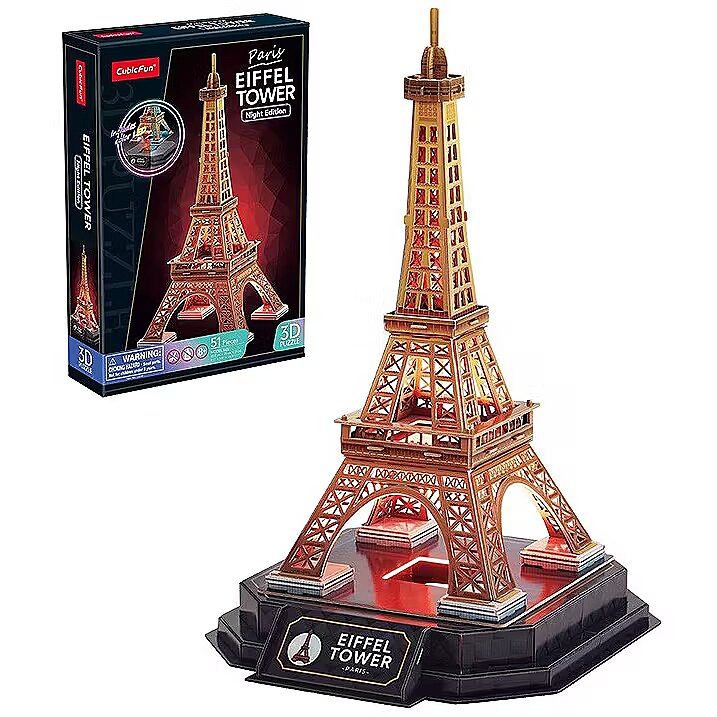 Description - 3D Eiffel Tower puzzle (night version) Putting together Cubic Fun puzzles is exciting fun for children and architecture collectors from all over the world. The Eiffel Tower LED set package contains 51 puzzle pieces made of a special foam-like material. The puzzles are numbered, cut and placed on sheets. Just press the element out of the sheet without using force and assemble it according to the attached instructions, without using glue or special tools. The finished structure is placed on a base with LED diodes inside. A 3D puzzle building illuminated in this way looks phenomenal when the light is off.