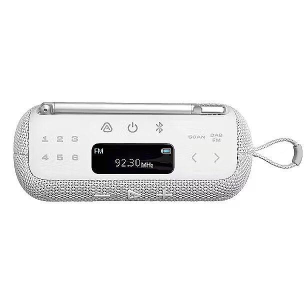 Technical specifications: Radio bands: DAB, DAB+, FM Preset stations: 6 RMS power: 7 W Frequency range: 70 – 20 000 Hz Signal-to-noise ratio (SNR): 80 dB Speakers: 1 built-in speaker Display: LCD with backlight Controls: Buttons for volume adjustment Bluetooth version: 5.3 Connectivity: USB Type-C charging port Battery: Li-ion, 5 V, up to 12 h playback, charging time 3.5 h Protection: Waterproof and dustproof (IP68) Additional features: Bass reflex, LED indicators