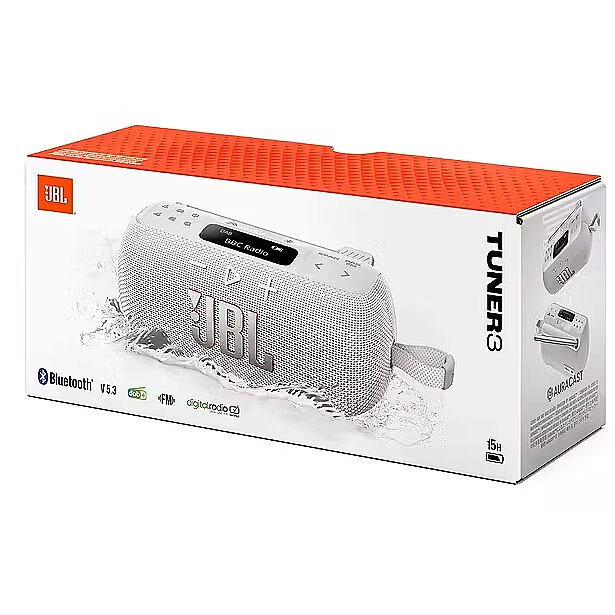 LongDesc - Crystal clear JBL Pro SoundWhether you're listening to music, talk, news, or sports, crystal clear JBL Pro Sound elevates your FM + DAB radio experience. With a more powerful driver, it's louder and delivers even punchier bass than you might expect.Up to 15 hours of playtimeDon't sweat the small stuff—like charging your battery. JBL Tuner 3 gives you up to 12 hours of playtime on a single charge and an extra 3 hours with Playtime Boost.Waterproof and dustproofThe JBL Tuner’s IP68 waterproof and dustproof rating ensures this portable speaker can handle almost any environment, from a poolside party to a seaside picnic.Tune into the fun and dive into an engaging new radio experience. Our powerful, portable JBL Tuner 3 radio keeps us locked into our favorite DAB/DAB+/FM radio stations and Bluetooth streaming, delivering bold, crystal clear JBL Pro Sound in the kitchen, by the pool, at the campsite, or wherever the mood takes us. We know it's going to elevate your listening. Get ready to crank up the volume. We've boosted the driver power, so the handy JBL Tuner 3 is loud enough to fill any space with pristine, true-to-life sound. It's our most powerful radio yet. Preset your six favorite stations so they're always at your fingertips. We also like to just explore the airwaves to see what surprises turn up on the big, clear LCD display. Either way, you get up to 15 hours of listening with Playtime Boost before you need a charge. Carry it anywhere, indoors or out, using the sturdy loop. Whether you're listening at the bathroom sink or on a white sand beach, the waterproof and dustproof design can handle just about anything. Find your own new station with the JBL Tuner 3.