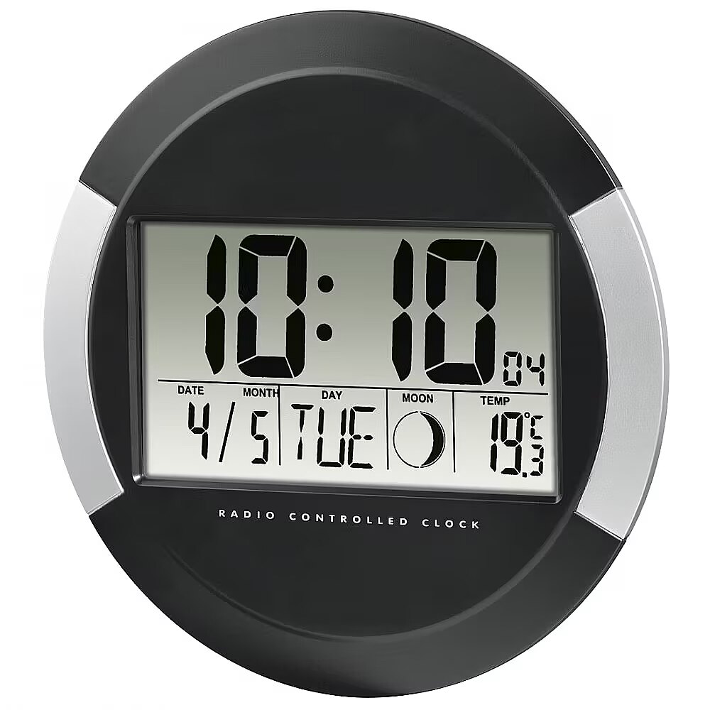 Description - DCF radio clock which automatically adjusts to the world's most accurate clock The time zone can be set manually if the DCF time differs from that of the time zone Can also be used as a table clock thanks to the fold-out base Shows the current phases of the moon - from new moon to waning moon Radio clock that digitally indicates the time, date and indoor temperature Displays the hour, minutes and seconds Can be wall-mounted Clock/calendar function: Shows the time in twelve-hour or twenty-four hour clock Calendar display (day, month, weekday) Weekday display (6 languages: English, German, French, Italian, Spanish, Dutch)