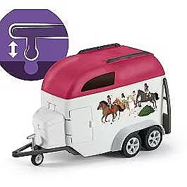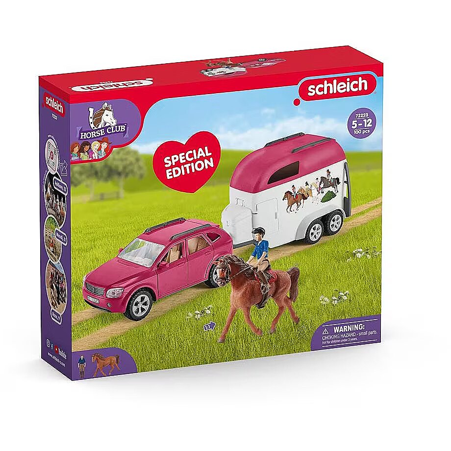 Technical_details - Start the engine for new adventures: The SUV with trailer from Schleich invites you to unforgettable experiences! Children will love creating and exploring their own riding stories with this set. Whether it's an exciting riding tournament in picturesque mountain landscapes, a camping trip in idyllic nature, a visit to grandma's cozy ranch or even a ride on the moon - the possibilities are limitless! As part of the Horse Club series, this set is characterized by its lifelike figures and vehicles. Every detail is carefully designed to inspire children's imaginative play. And as the tires roll along imaginary roads, little explorers playfully develop valuable skills and a deeper understanding of the world around them. Designed for children aged 5 to 12, this set promises not only an entertaining but also an educational play experience that combines adventure with educational values." Item no.: 100043255 Kind of toy vehicle EAN 4059433775364 Manufacturer no. 72223 Horse Club series Contents/equipment 1 SUV, 1 horse trailer, 1 man, 1 Holsteiner mare, 1 saddle, 1 bridle with reins, 1 helmet Age recommendation from 5 years to 12 years Target group kindergarten children, school children, young people Material: Plastic Warnings Warning: Not suitable for children under 36 months! Caution: Danger of suffocation due to small parts that can be swallowed! Dimensions width: 285 mm x height: 265 mm x depth/length: 673 mm