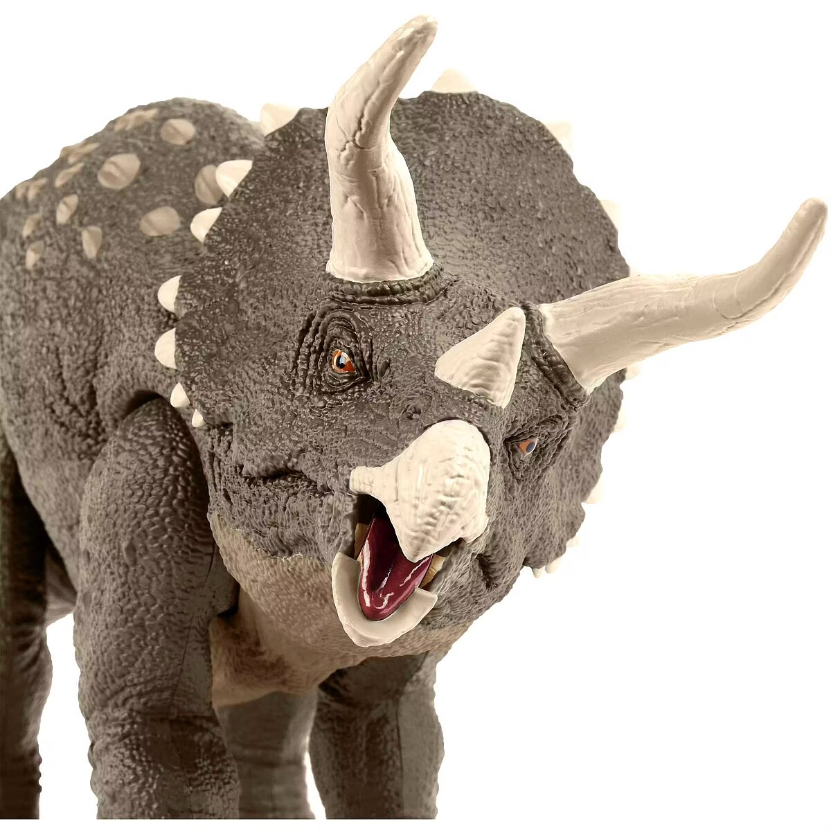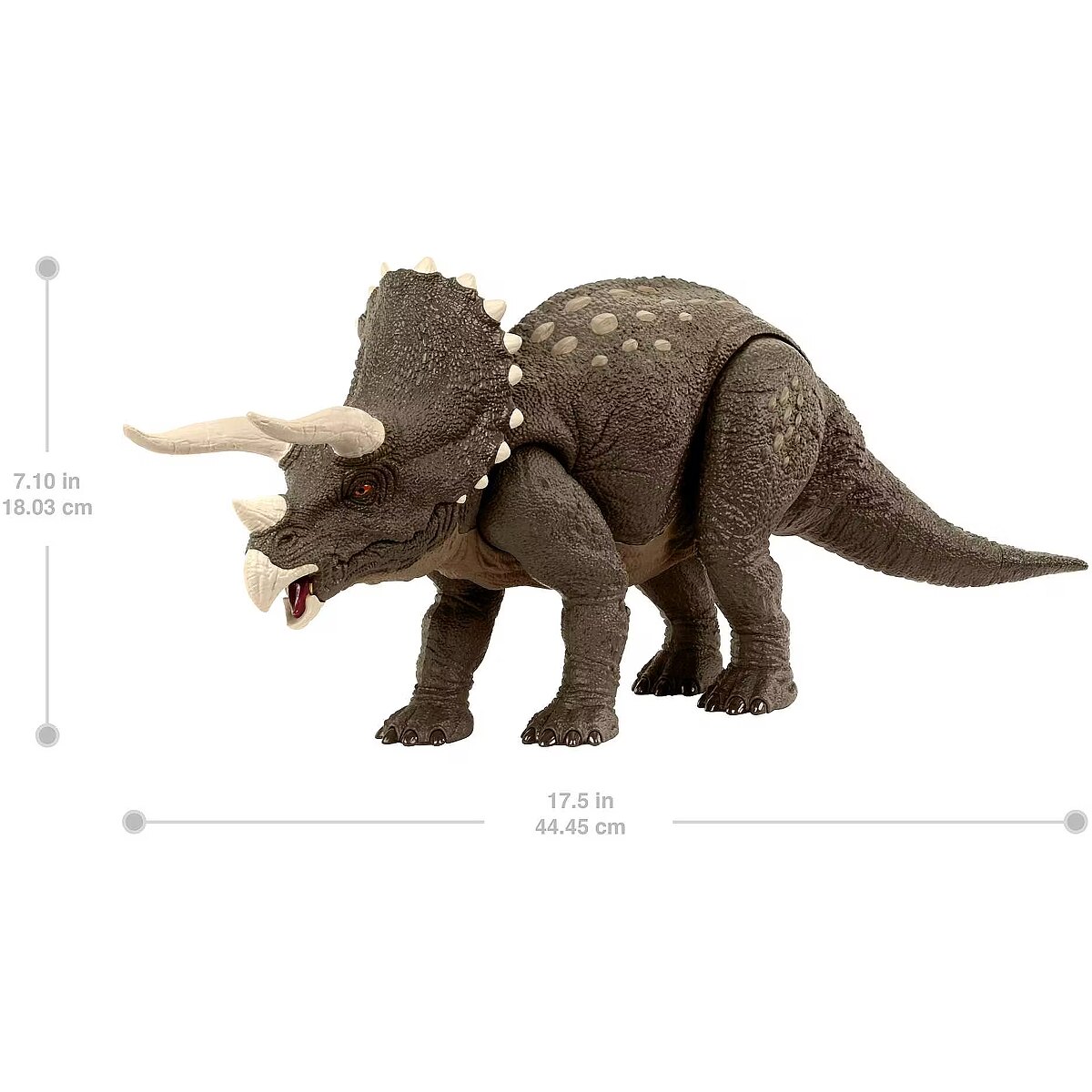 Description - Jurassic World Eco Triceratops Environmental Defender Figurine This large Jurassic World Triceratops figure is made of 60% ISCC certified plastic (mass balance approach). Measuring 43 cm long, the Environmental Defender Triceratops figure features an impressive collar and horns typical of the species, as well as movable legs, tail and jaw. This figure with a look adapted to the desert environment is a great addition to any dinosaur collection. BRING your dinosaur to life with augmented reality. Simply scan the tracking code in the free Jurassic World Facts App with a compatible smartphone/tablet (Android or iOS, not included) to discover augmented reality features and games. For dinosaur fans from 4 years of age. Colors and decorative elements may vary. Eco toy! This Jurassic World Triceratops figure is made of 60% ISCC certified plastic (mass balance approach). Choose it to contribute to the responsible sourcing of bio-based materials. Desert Defender! Impressive horns and collar distinguish the Triceratops with a unique desert appearance, measuring 43 cm in length and 17.5 cm in height. It is ready for dynamic play thanks to its movable legs, tail, head and jaw. Thoughtful packaging! Concern for the environment is expressed even through the packaging, which is made of FSC-certified recycled cardboard and uses printing with vegetable oil ink. Interactive attractions! Simply scan the tracking code in the free Jurassic World Facts App with a compatible smartphone/tablet (not included) to discover AUGMENTED REALITY features and games. Virtual fun! Lots of adventures await you in amazing games: discover X-ray and thermal modes, chase and catch dinosaurs in different environments, and rescue and release them in their natural surroundings.