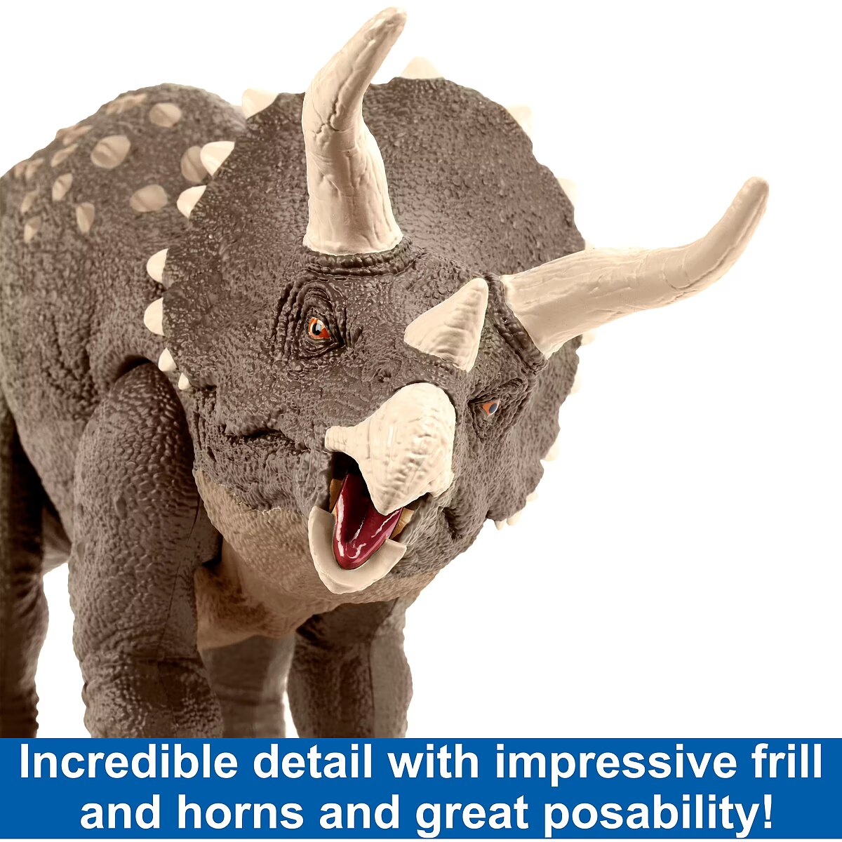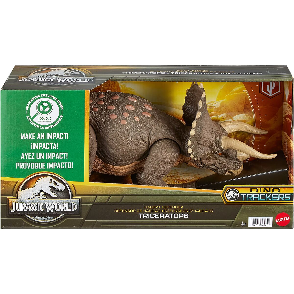 LongDesc - This Jurassic World Triceratops toy is large in size but made with 60% ISCC-certified plastics (mass balance approach). At 17 inches long, the Habitat Defender Triceratops has the impressive frill and horns that identify the species and posable legs, tail, head and jaw. Designed with a special desert habitat design, this figure can help build out any dinosaur collection. Bring the dinosaur 'TO LIFE' using Augmented Reality! Scan the hidden Tracking Code in the free Jurassic World Facts App with a compatible smart device (Android or iOS, not included) to unlock AR experiences and games! For dinosaur fans 4 years and up. Colours and decorations may vary.