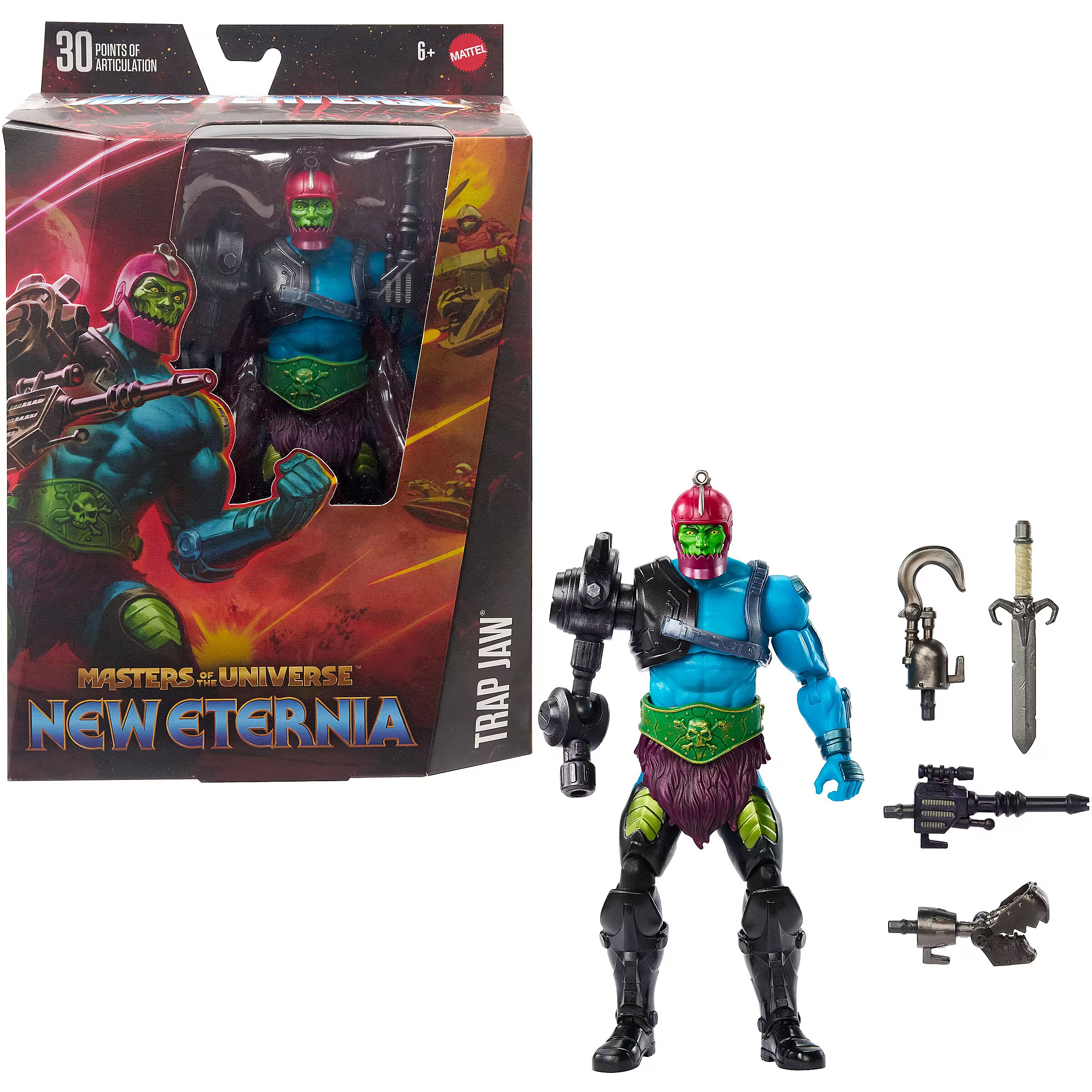 LongDesc - This Masterverse action figure of Trap Jaw is evil and armed for combat, based on Masters of the Universe: New Eternia, with multiple weapon accessories, including his iconic robotic arm. With the high level of detail collectors have come to expect, this 7-inch scale figure has 30 points of articulation and the cybernetic arm has four different attachments hook, jaw claw, sword and blaster. His namesake jaw is articulated and removable. He comes beautifully packaged in a window box suitable for display. This Trap Jaw figure makes a great gift to start or build a MOTU collection. Colours and decorations may vary.