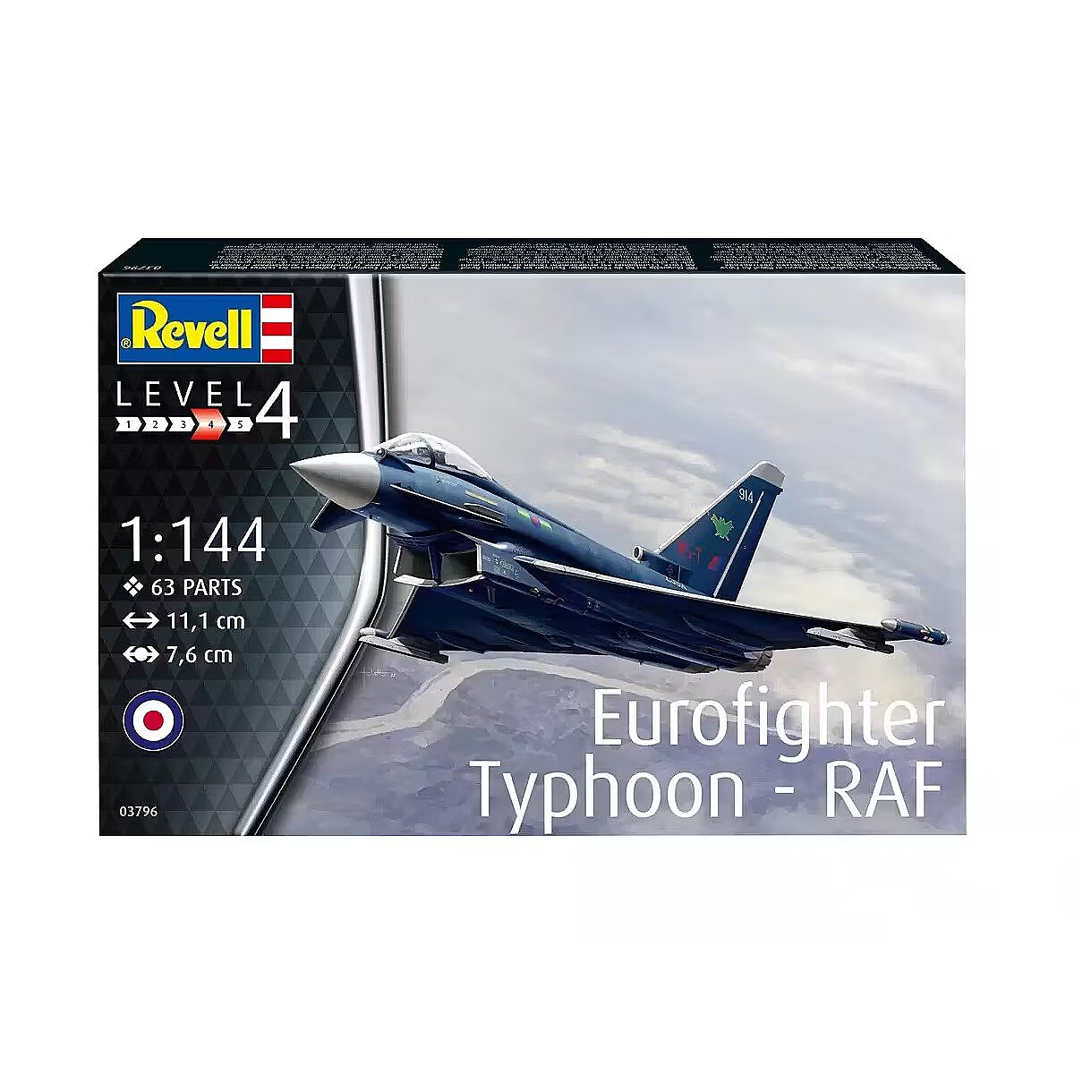 Description - Plastic model Eurofighter Typhoon RAF aircraft 1/144 The RAF Eurofighter Typhoon - dominates the skies as the latest generation of multi-role fighter aircraft with a maximum speed of Mach 2.0+. Whether for long- and short-range air combat or air-to-ground operations, its versatility and performance are second to none. This model offers not only rewarding building and collecting, but also an insight into the advanced technology and history of one of the world's leading fighters. Recommended paint colours: 32105, 32108, 32109, 32145, 32147, 32148, 32156, 32176, 32189, 32190, 32191, 32199, 32302, 32330, 32364. Revell plastic model for assembly (REV-03796) does not include paint and glue.
