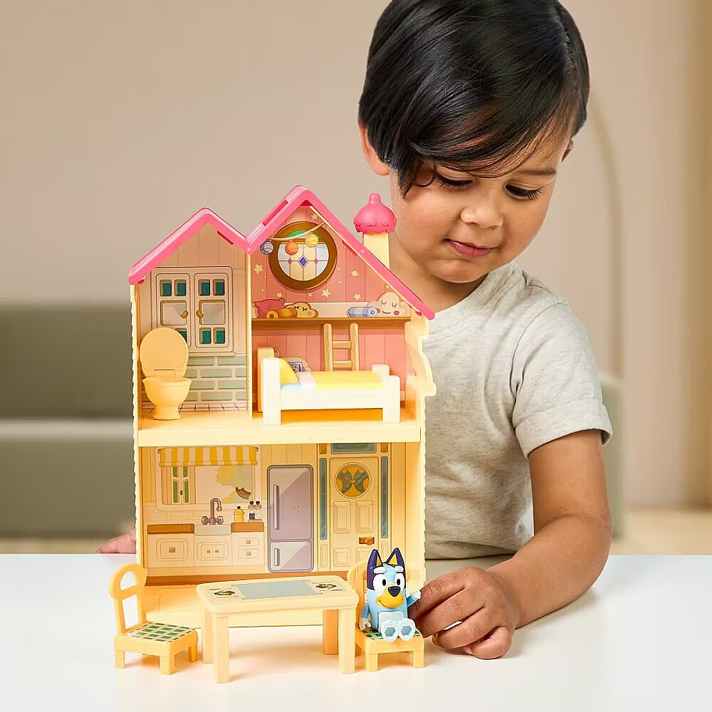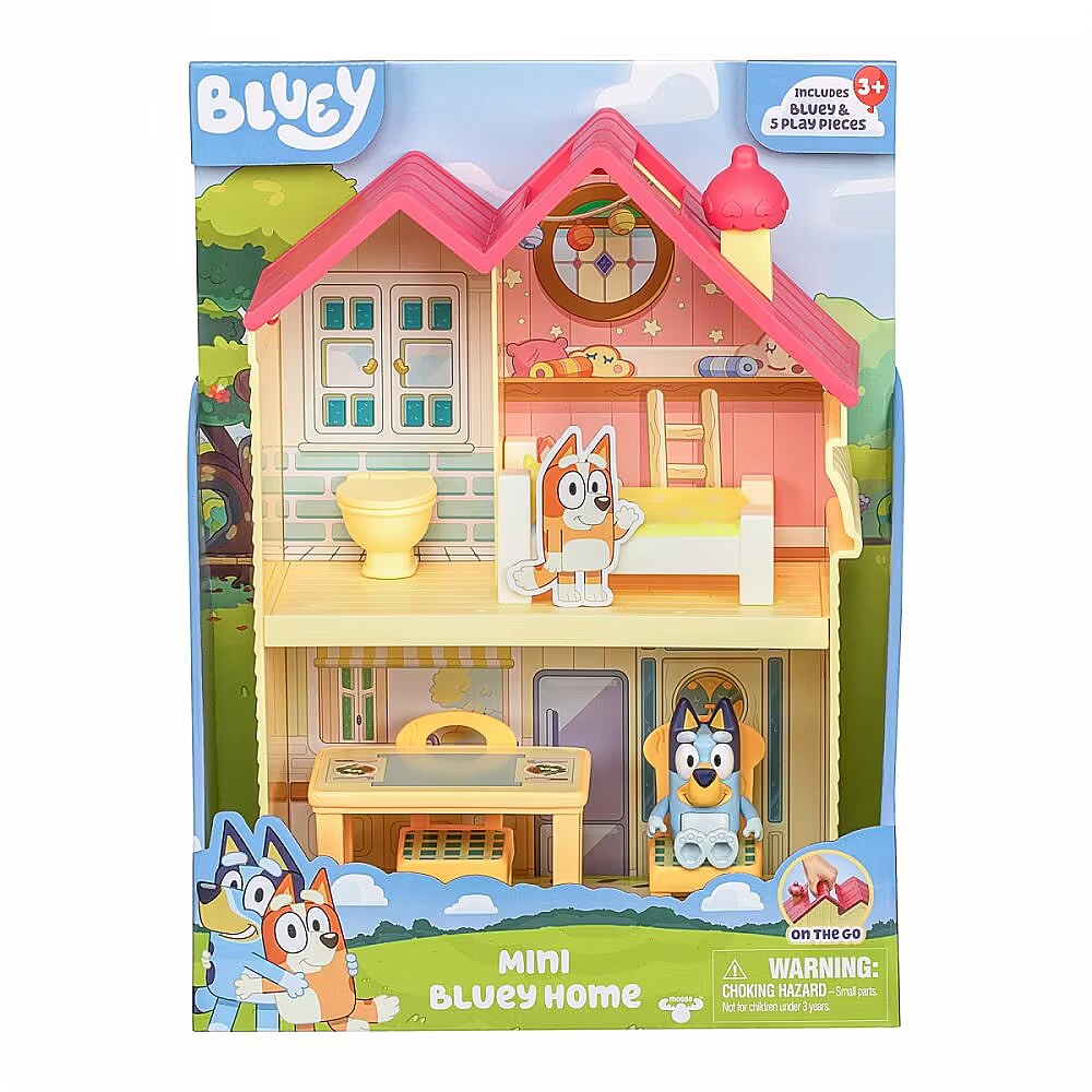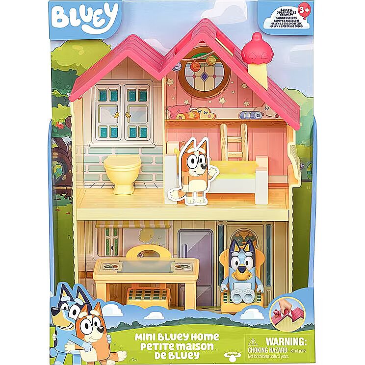 Description - BLUEY MINI FAMILY HOUSE Recreate your favourite scenes from the show and play house with Bluey. Nap in the bedroom? Snack in the kitchen? Or maybe take a quick pee in the bathroom? Three play areas where Bluey can spend her free time.