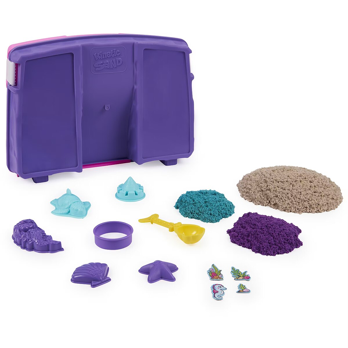 LongDesc - Turn your mermaid dreams into reality with the Kinetic Sand Mermaid Palace Playset. This playset comes with a total of 2.06lbs of Kinetic Sand, including exclusive shimmer teal sand, beach sand, and neon purple sand. Use the included 7 mermaid-themed tools to create the ultimate mermaid world. Use the scoop to shape, molds to build, and scene pop-out to bring your creations to life. Kinetic Sand is the original magical, moldable and mesmerizing play sand. Better than arts and crafts modeling clay, this sensory sand never dries out, so you can play with Kinetic Sand for hours of tactile independent play. It’s a welcome addition to sensory bins and toys collection. Let it flow through your hands – it’s so satisfying, you won’t be able to put it down. Kinetic Sand is made with natural sand, magically sticks together and cleans up easily. Kinetic Sand develops creative and sensory skills and allows kids to create anything they can imagine. Kinetic Sand kids toys for 3 year old boys and girls are a fun gift for kids. Kinetic Sand Mermaid Palace Playset includes a reusable sandbox storage to keep your sand contained for easy storage and clean up. Create the ultimate mermaid world with the Kinetic Sand Mermaid Palace Playset.Includes: 1.5 lbs of Kinetic Sand beach sand, 4oz of shimmer Kinetic Sand, 5oz of Kinetic Sand, 1 reusable folding sandbox, 1 shell scoop, 6 molds, 1x scene punch-out