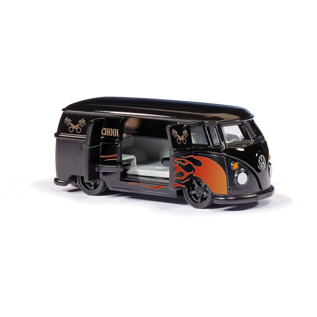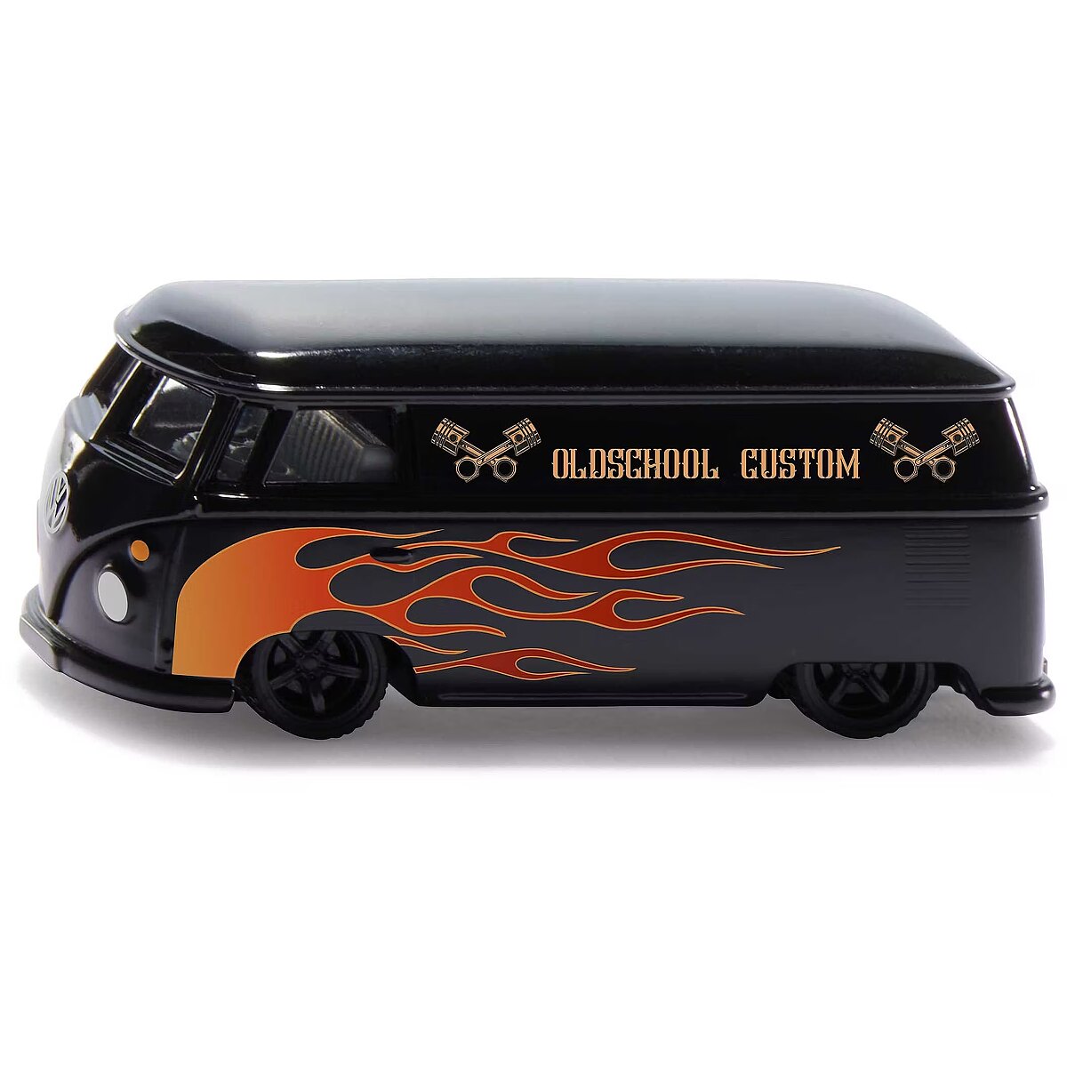 LongDesc - Our heart beats “Bulli”! The lovable “Bulli” minibus with its characteristic flat front enjoys maximum cult status, and thus even puts many sleek classic sports cars into the shade. The first VW Bus T1 was launched in Wolfsburg in 1950, and today collectors and enthusiasts pay record six-figure amounts for the original mid-range transporter. Today the “Bulli” is celebrated worldwide by dyed-in-the-wool fans and admirers, and it also inspires above all as a custom model in repeatedly new individualised design variants. Such as, for example, currently in a jet-black, dynamic old-school interpretation with elaborately printed flames in homage to the legendary art of customised bodywork. The siku T1 Transporter Custom is an astonishingly heavy model, because a large part of this model car is made from metal – plastic is used only occasionally and with purpose, such as for the vehicle interior and on the roof. The Bulli’s chassis was set lower in order to create a more sporting driving sensation, and the look has become extra-cool, thanks to the striking rims with broad tyres. The double doors on the passenger side can be opened, and reveal a view of the vehicle interior. But let’s talk about the special paintwork again in detail: The lower section of the cult transporter is painted in matt black, and from the mid-line upwards the minibus is painted in black gloss – don’t you think that’s really cool? The black rims look really savage, and they match the old-school look, which is consummated by the blazing flames which run in red/orange/yellow along both sides of the bus. Together with the “Oldschool Custom” logo print, this T1 is simply legendary! Planning an extended excursion or a big adventure? No problem: The trailer coupling, integrated as standard, is compatible with many siku trailer models. And now it’s off to the next adventure!