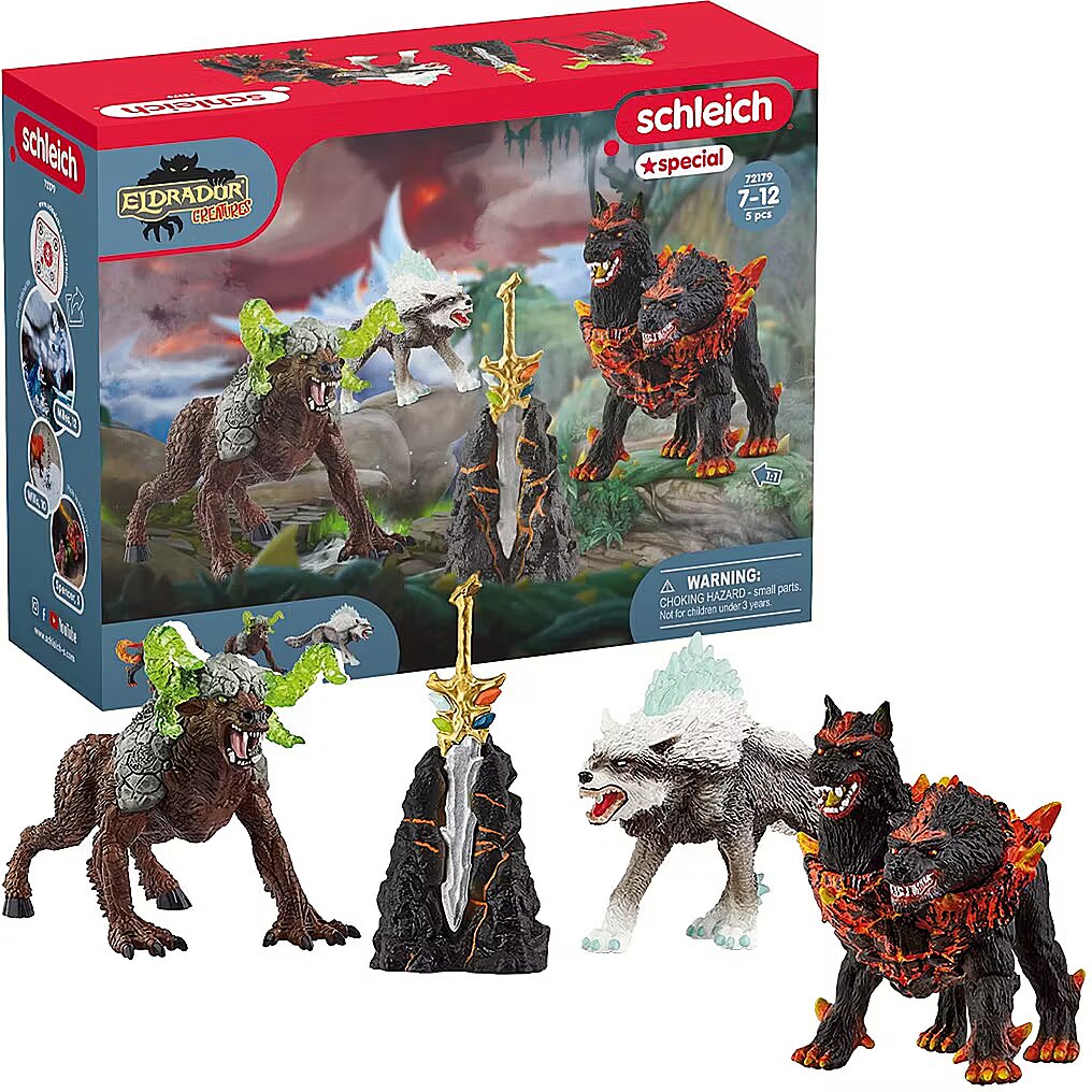 Technical_details - Face the battle for ultimate power with the Eldrador Starter Set from Schleich. From the merciless worlds of jungle, lava, ice, stone and shadow emerge three legendary creatures: the fiery hellhound, the frosty snow wolf and the indomitable rock beast, equipped with the legendary super weapon. These characters are ready for an adventure that turns a child's imagination into reality. It is now up to you whether the balance of power is maintained or whether ongoing wars destroy the old order. With every decision you make, the fate of Eldrador rises and falls. Ready for fierce duels and powerful alliances? Dare to adventure! Item no.: 100045782 Kind of game piece EAN 4059433573090 Manufacturer no. 72179 Eldrador series Contents/equipment 1 hellhound, 1 snow wolf, 1 rock beast, 1 super weapon in stone Age recommendation from 7 years to 12 years Target group: school children, young people Material: Plastic Warnings Warning: Not suitable for children under 36 months! Caution: Danger of suffocation due to small parts that can be swallowed!