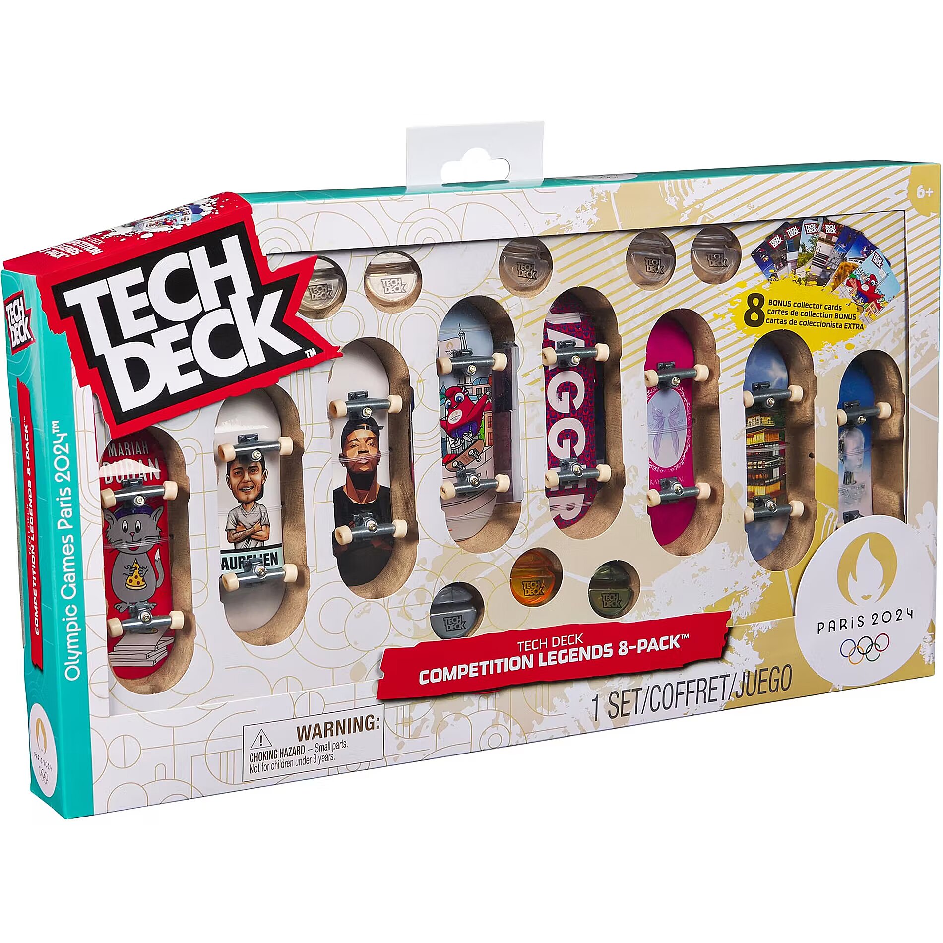 Technical_details - Tech Deck celebrates the 2024 Olympics with a matching fingerboard set: eight decks with iconic designs of the boards of top Olympic athletes are included, that of: Shane Oneill, Ryassa Leal, Yuto Harigome, Maria Duran, Jagger Eaton, Aurelien Giraud , Felipe Gustavo - and the Olympic mascot. The Competition Legends 8-Pack is more than just a collection of cool fingerboards. It's a tribute to the skate culture that Spin Master has accompanied for 25 years with original designs from the big skate brands. In addition to 8 practical board holders, the Olympic set also includes eight trading cards of the stars. All young Olympic fingerboarders can train their skills here so that from July 2024 they can perform the Olympic jumps of their skate idols with their fingerboard at home. Item no.: 100038389 Kind of toy vehicle EAN 0681147023109 Manufacturer no. 6070368 Tech Deck series Contents/equipment 8 Olympic Tech Deck fingerboards, 8 fingerboard holders, 8 trading cards of the Olympic stars Age recommendation from 6 years Target group school children Warnings Warning: Not suitable for children under 36 months! Caution: Danger of suffocation due to small parts that can be swallowed!
