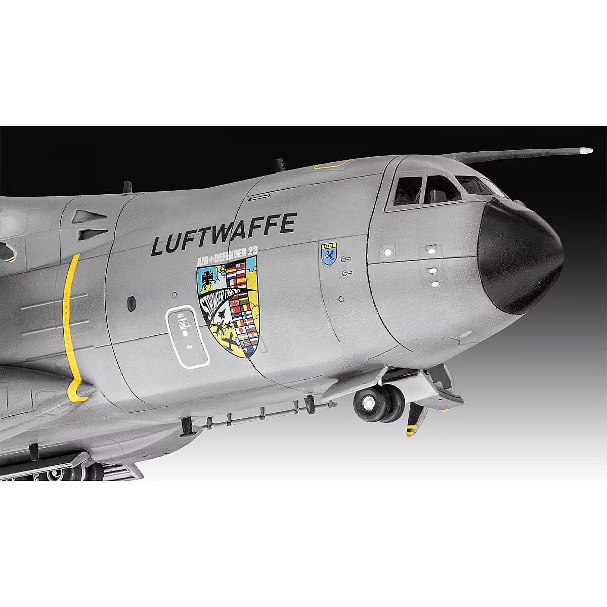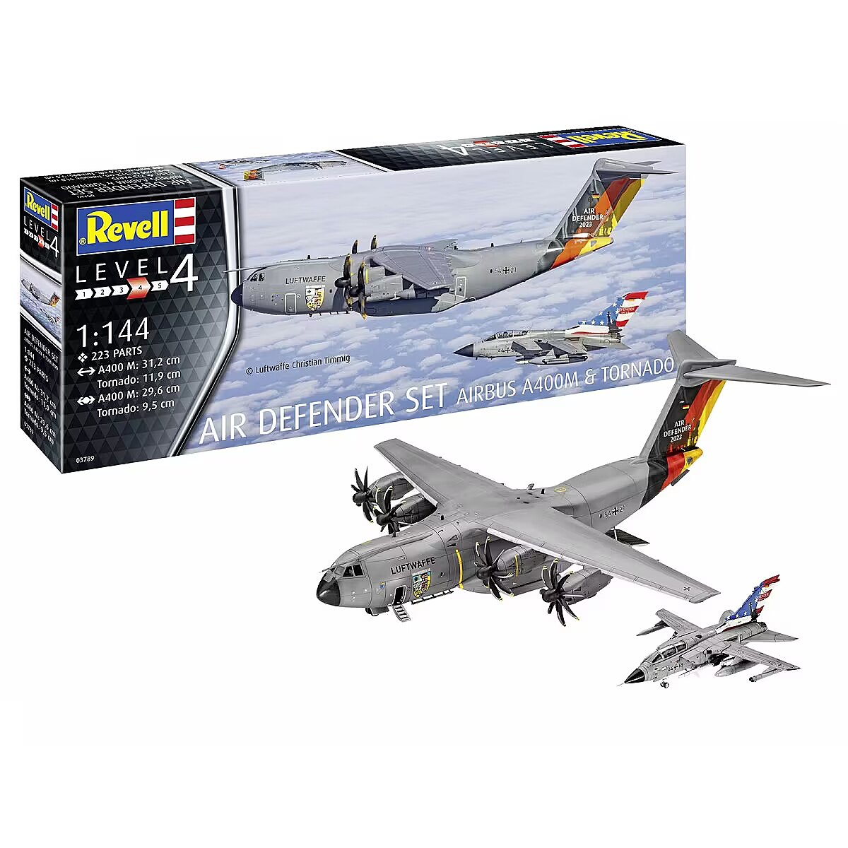 Description - Air Defender Set (Airbus A400M & Tornado) A400M and Tornado - In June 2023. 25 NATO member states gathered over Europe for the largest air operations exercise since NATO's inception, initiated by the Bundeswehr. More than 10,000 troops and 250 aircraft, including 23 different types, took part in this historic manoeuvre. The Air Defender model kit pays tribute to the A400M and Tornado aircraft that played a key role in this exercise and invites modellers to become part of this fascinating story. REVELL 03789 plastic model kit does not contain paint.