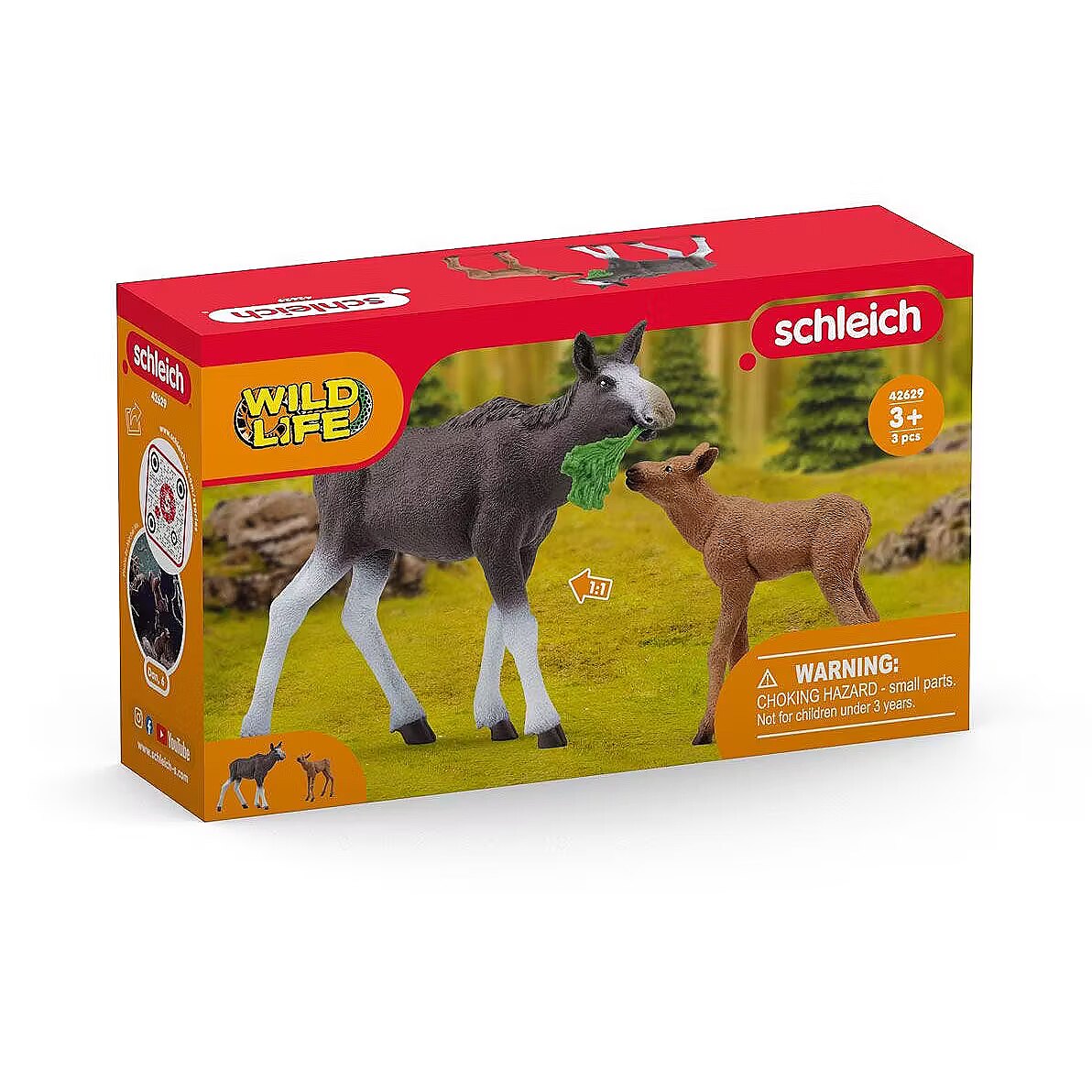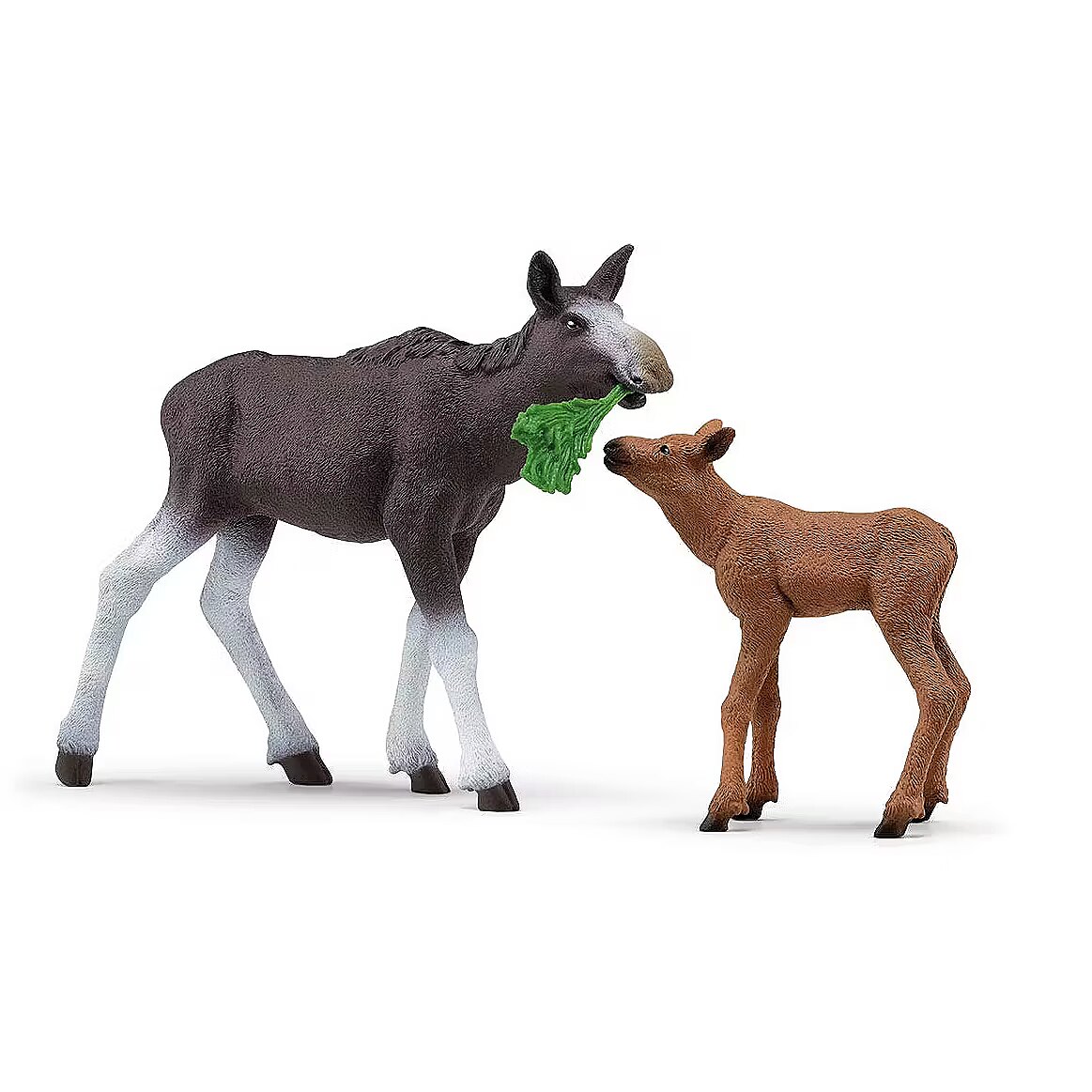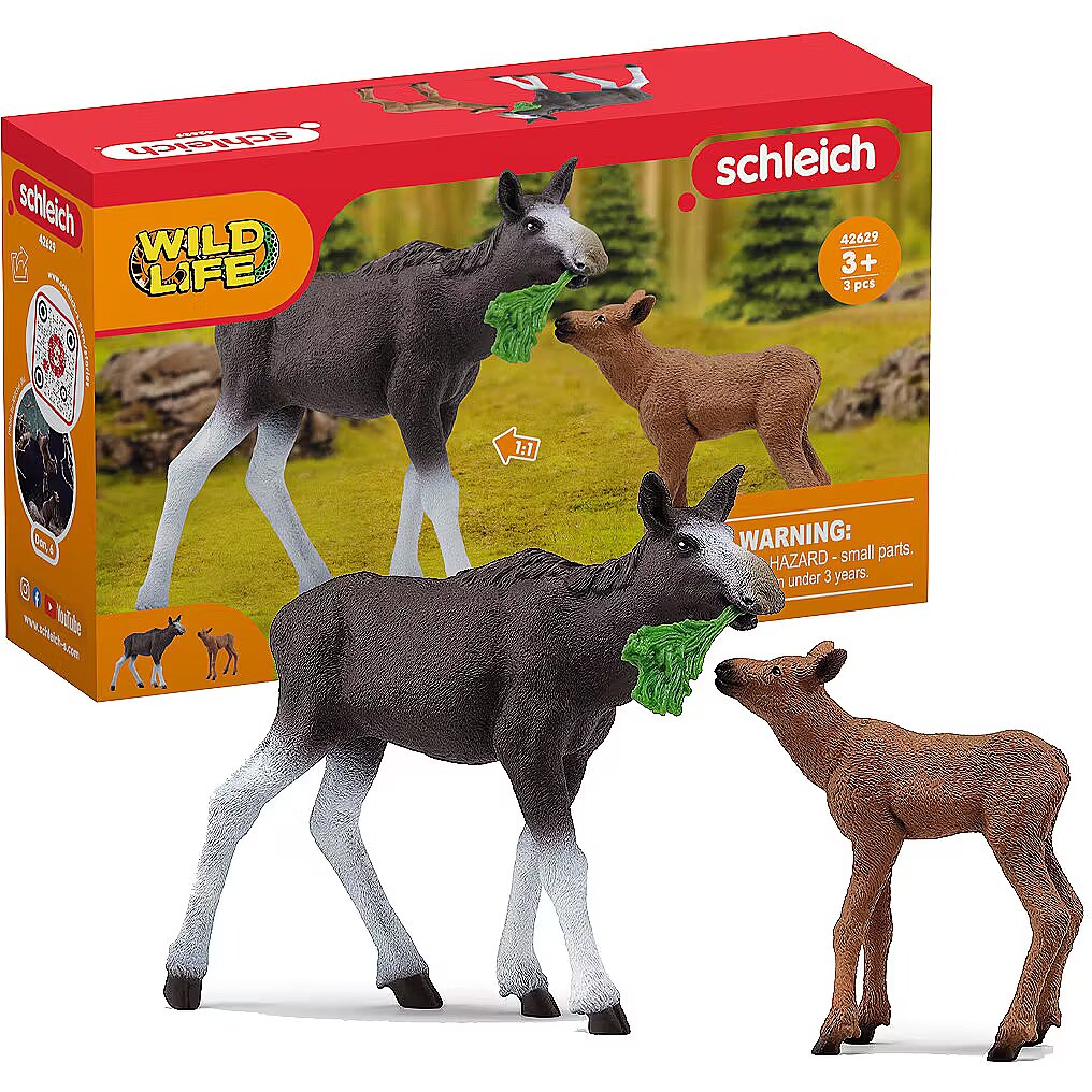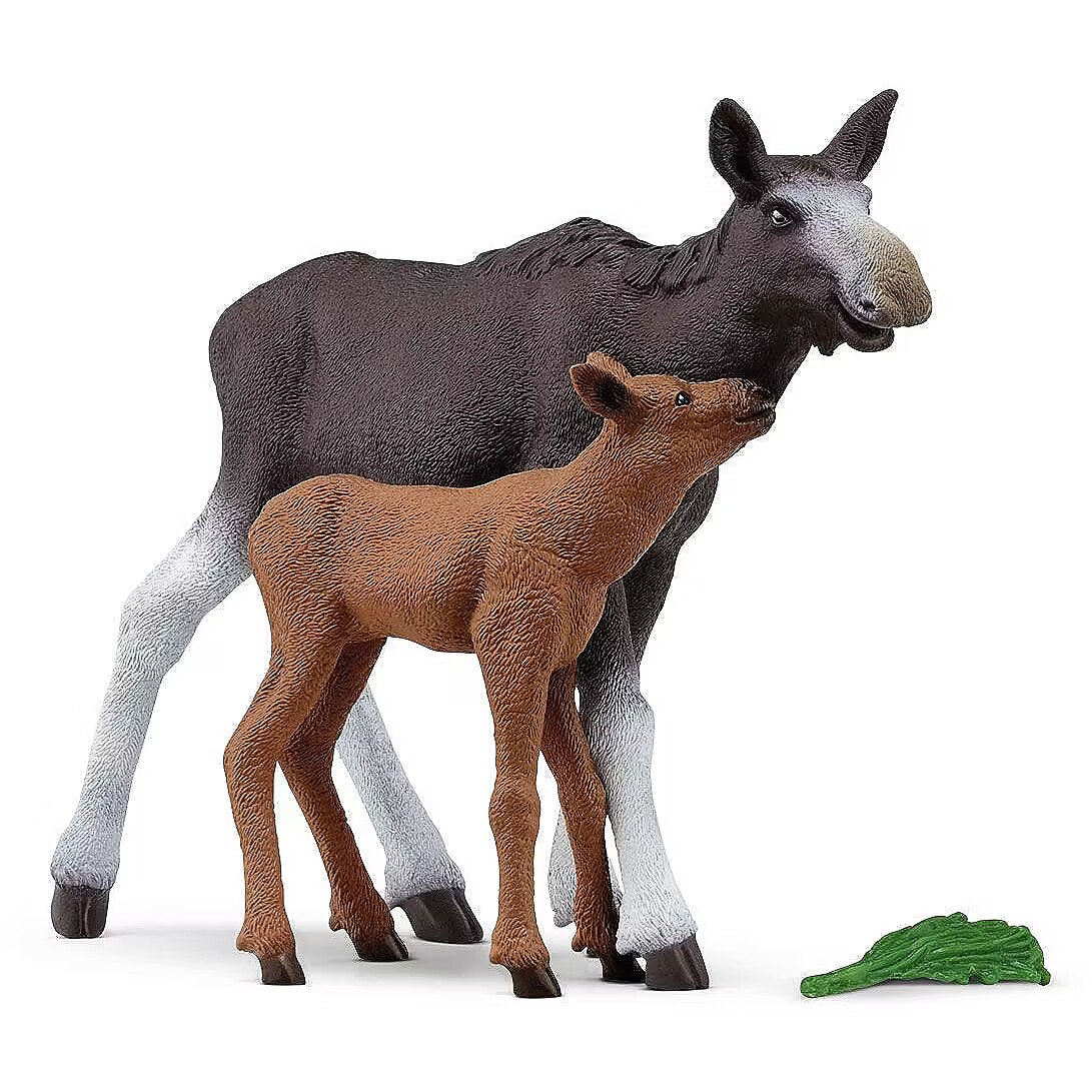 LongDesc - A proud mama moose brings a leafy snack to her calf. If only all kids ate their vegetables so willingly! The moose calf playset from schleich® Wild Life is a majestic addition to your child's wild animal toy collection.The stately moose cow cares lovingly for her little calf. She suckles it several times a day. To keep her strength up, the mom needs to eat plenty of fresh grass. In search of a lush meadow, she stretches her long muzzle into the air and sniffs. When she gets the scent of some juicy grass, she strides off with big steps ahead through the forest with her calf following behind.