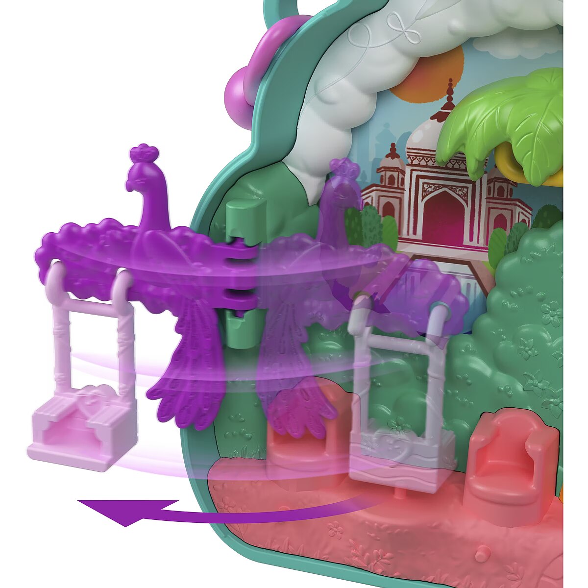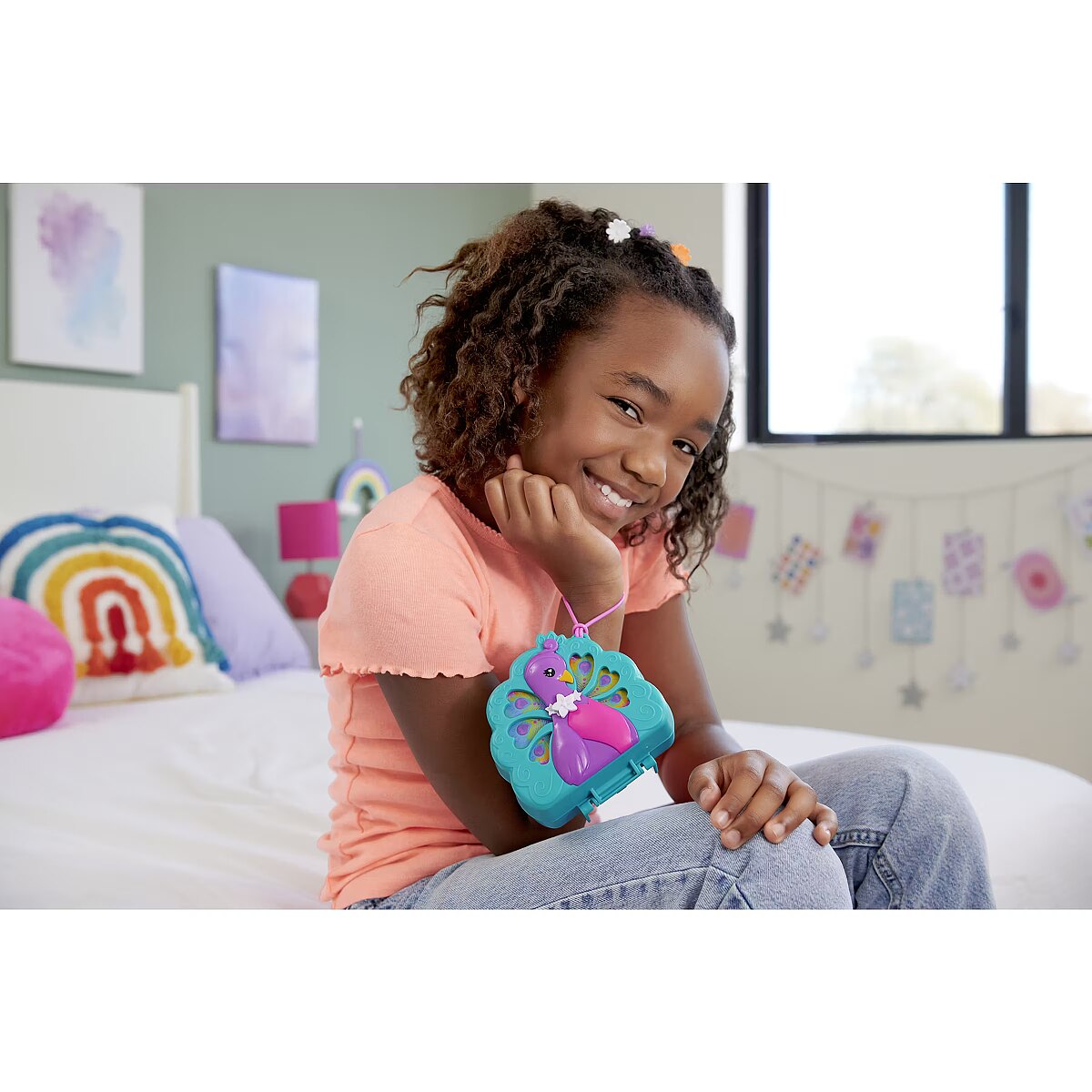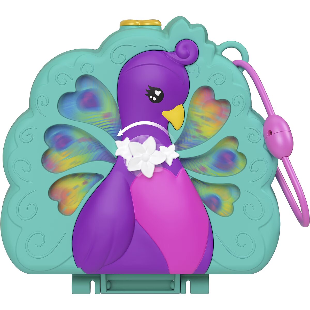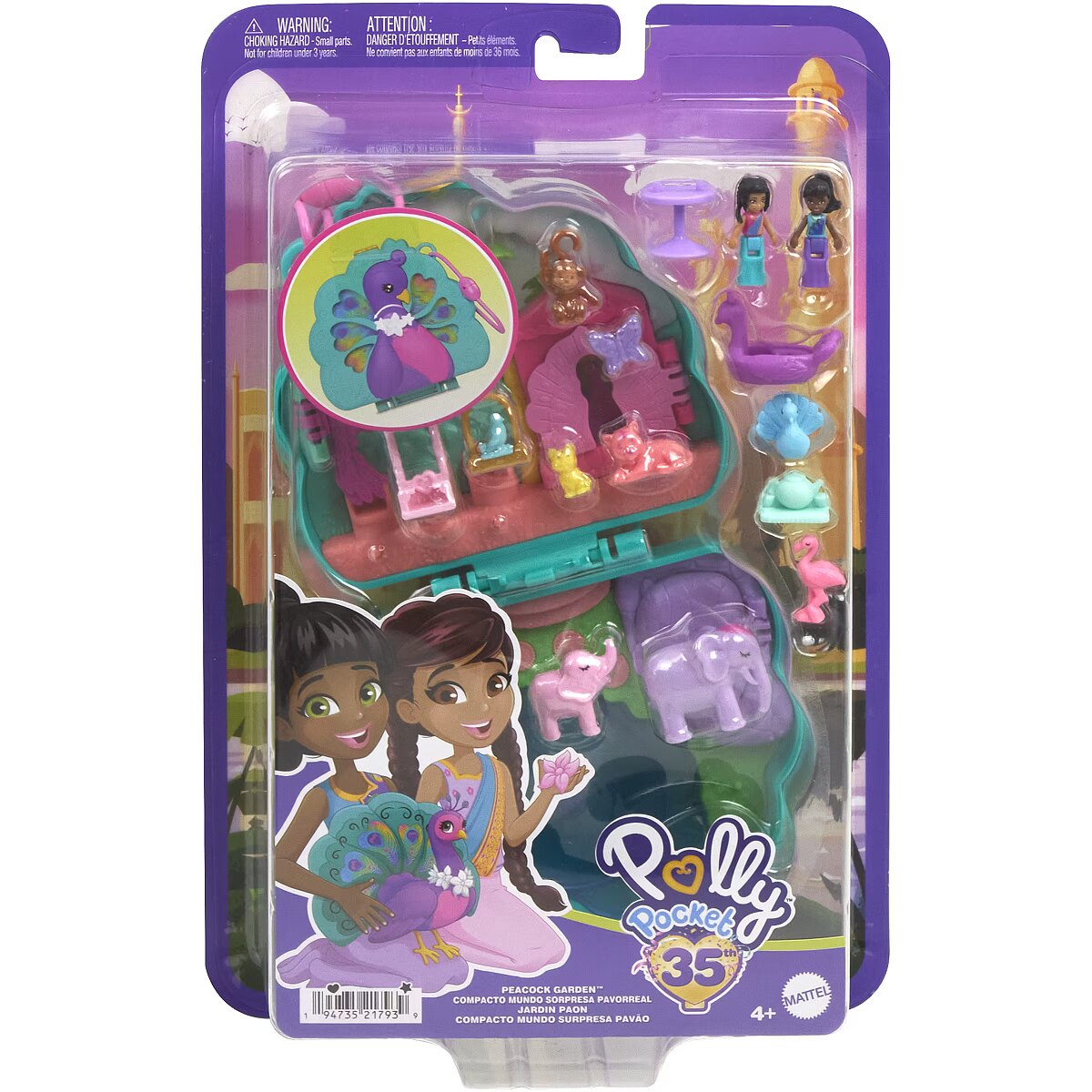 Description - Polly Pocket Peacock Garden Compact This adorable Polly Pocket Peacock Garden Compact has a vibrant peacock exterior with fun fidget feathers! The compact opens to an animal oasis with two micro dolls and 12 accessories, including multiple pet friends. Dolls love to make a splash with pet elephants in the pool! Then, go for a ride in the peacock boat or swing. As the day winds down, check out the sunset from the gazebo or have a peacock tea party in the garden there's so much to do! When it's time to run, pack it up for on-the-go fun! Ideal for ages four years old and up, especially those who love animal adventures! Colors and decorations may vary. Welcome to paradise! This Polly Pocket Peacock Garden Compact comes with two micro dolls and 12 accessories, including multiple pets. The exterior features a colorful peacock with fun fidget feathers. Open the compact to discover an animal oasis! Get ready for ultimate storytelling fun with features like a peacock swing that moves back and forth, gazebo with a door that opens, and a pool with a boat. Clip pet monkey to the palm tree while having a tea party with flamingo friend in the garden the sunset is beautiful! Take the compact anywhere for on-the-go fun. Makes a great gift for ages four years old and up, especially those who love travel adventures!