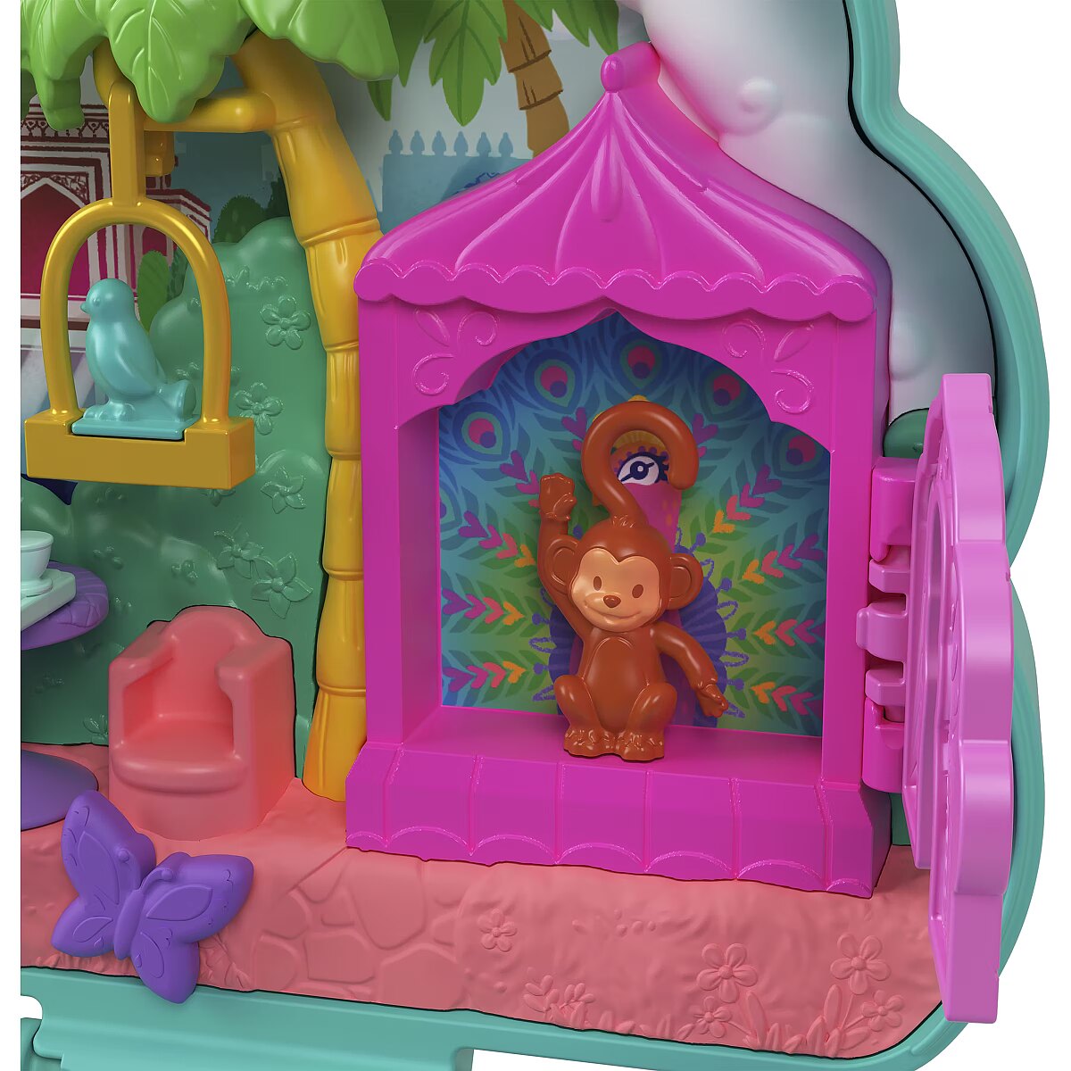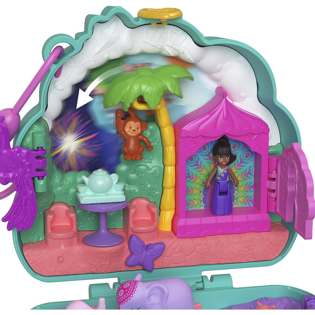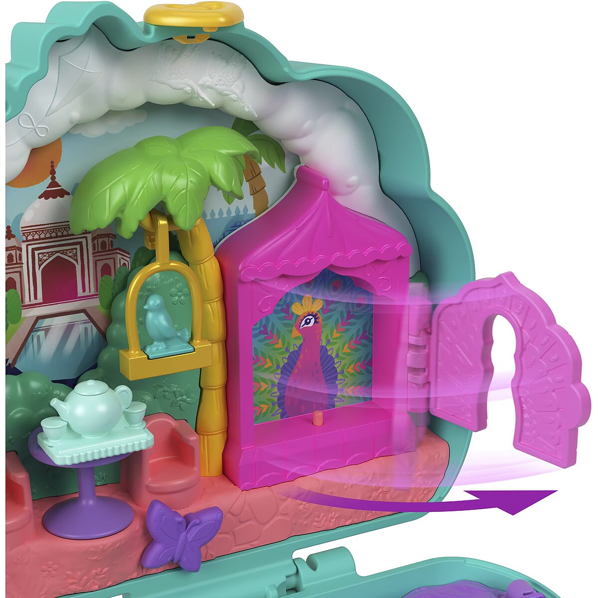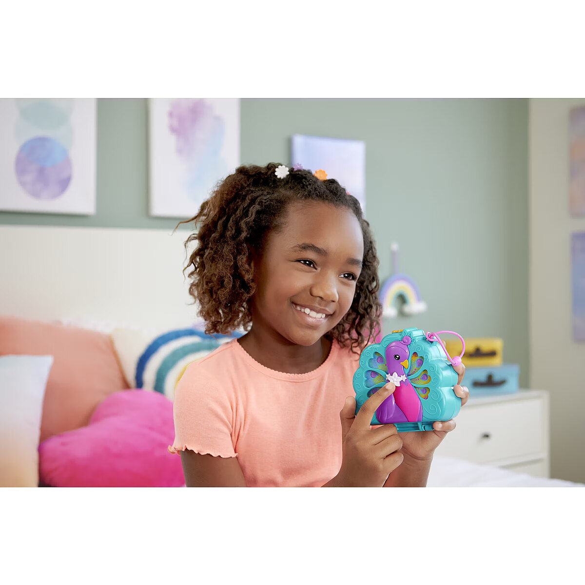 Description - Polly Pocket Peacock Garden Compact This adorable Polly Pocket Peacock Garden Compact has a vibrant peacock exterior with fun fidget feathers! The compact opens to an animal oasis with two micro dolls and 12 accessories, including multiple pet friends. Dolls love to make a splash with pet elephants in the pool! Then, go for a ride in the peacock boat or swing. As the day winds down, check out the sunset from the gazebo or have a peacock tea party in the garden there's so much to do! When it's time to run, pack it up for on-the-go fun! Ideal for ages four years old and up, especially those who love animal adventures! Colors and decorations may vary. Welcome to paradise! This Polly Pocket Peacock Garden Compact comes with two micro dolls and 12 accessories, including multiple pets. The exterior features a colorful peacock with fun fidget feathers. Open the compact to discover an animal oasis! Get ready for ultimate storytelling fun with features like a peacock swing that moves back and forth, gazebo with a door that opens, and a pool with a boat. Clip pet monkey to the palm tree while having a tea party with flamingo friend in the garden the sunset is beautiful! Take the compact anywhere for on-the-go fun. Makes a great gift for ages four years old and up, especially those who love travel adventures!