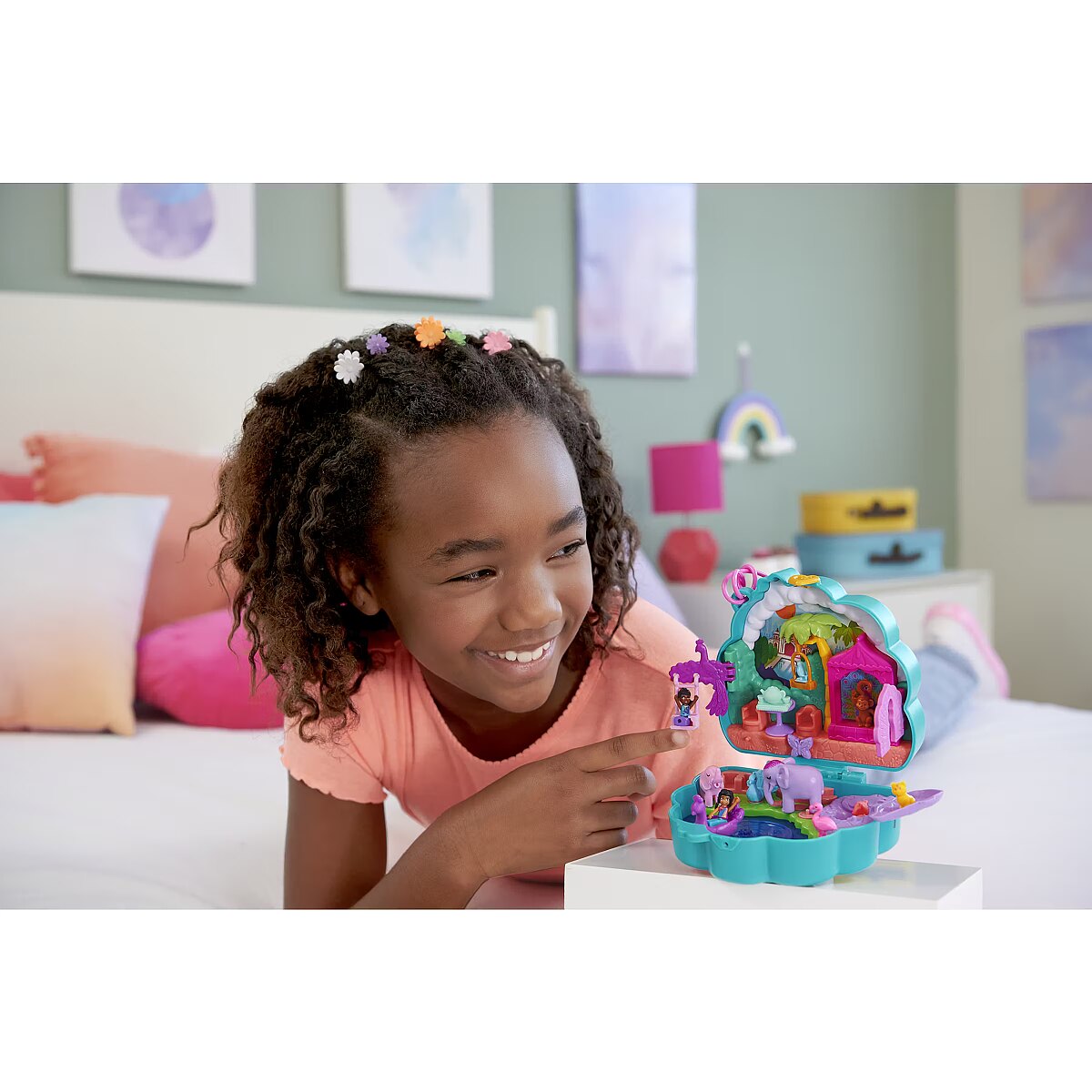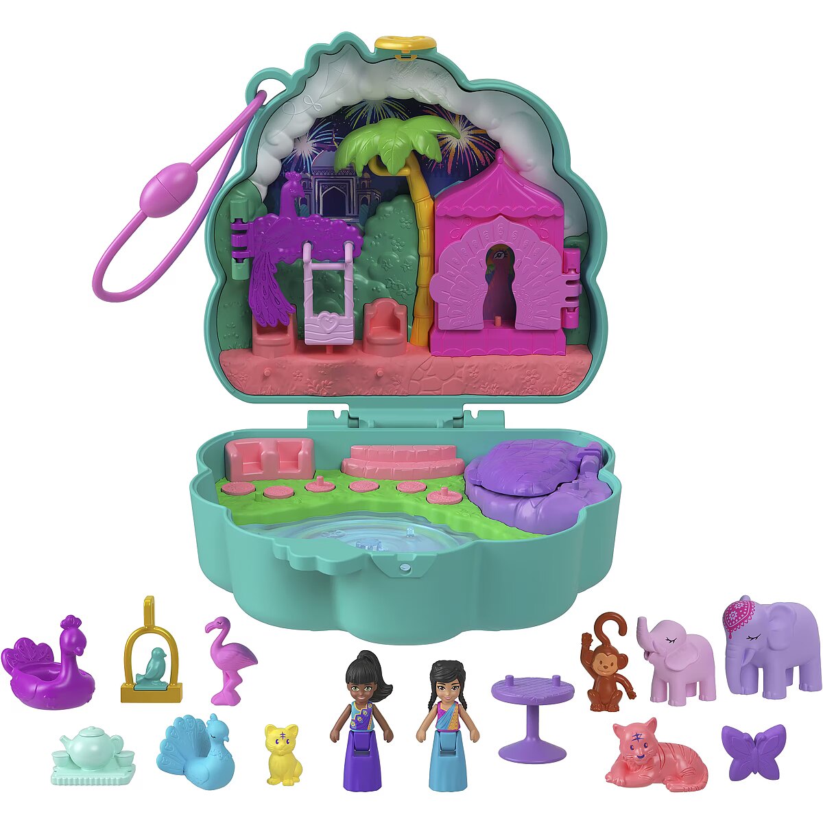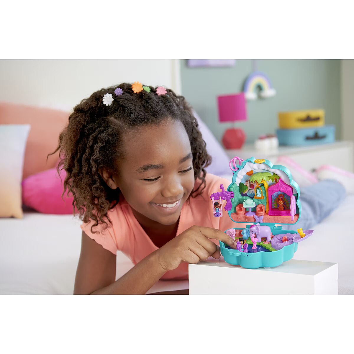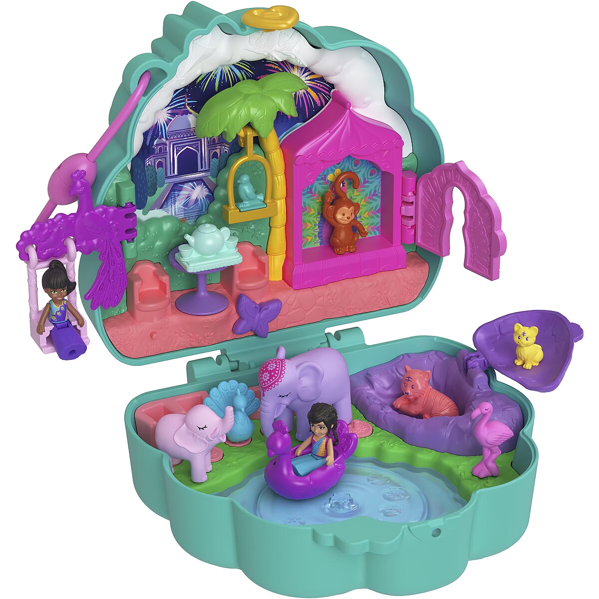 Description - Polly Pocket Peacock Garden Compact This adorable Polly Pocket Peacock Garden Compact has a vibrant peacock exterior with fun fidget feathers! The compact opens to an animal oasis with two micro dolls and 12 accessories, including multiple pet friends. Dolls love to make a splash with pet elephants in the pool! Then, go for a ride in the peacock boat or swing. As the day winds down, check out the sunset from the gazebo or have a peacock tea party in the garden there's so much to do! When it's time to run, pack it up for on-the-go fun! Ideal for ages four years old and up, especially those who love animal adventures! Colors and decorations may vary. Welcome to paradise! This Polly Pocket Peacock Garden Compact comes with two micro dolls and 12 accessories, including multiple pets. The exterior features a colorful peacock with fun fidget feathers. Open the compact to discover an animal oasis! Get ready for ultimate storytelling fun with features like a peacock swing that moves back and forth, gazebo with a door that opens, and a pool with a boat. Clip pet monkey to the palm tree while having a tea party with flamingo friend in the garden the sunset is beautiful! Take the compact anywhere for on-the-go fun. Makes a great gift for ages four years old and up, especially those who love travel adventures!