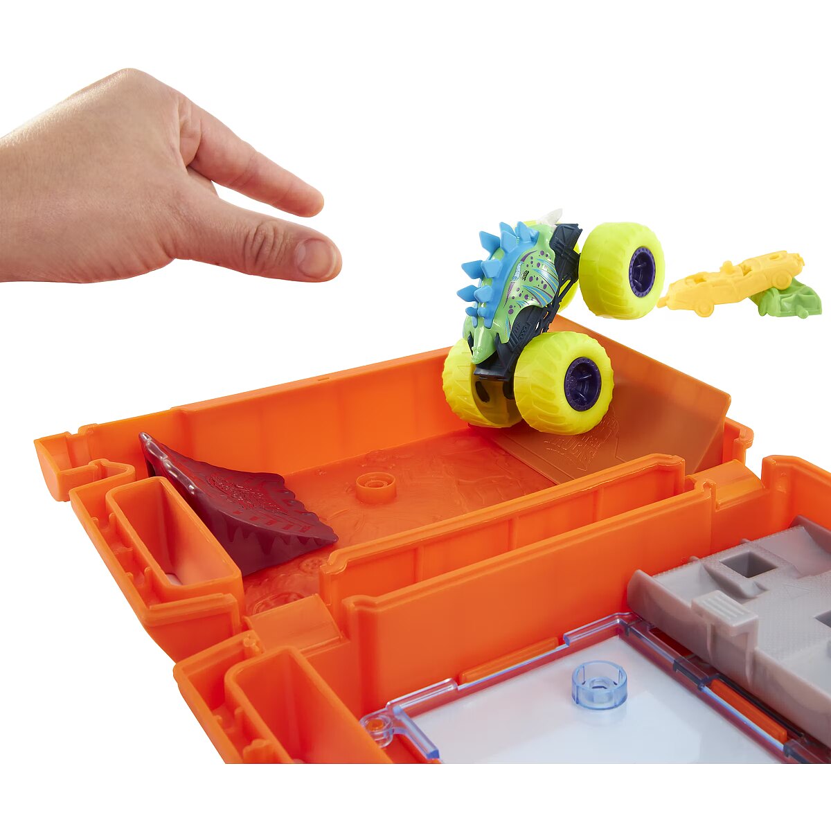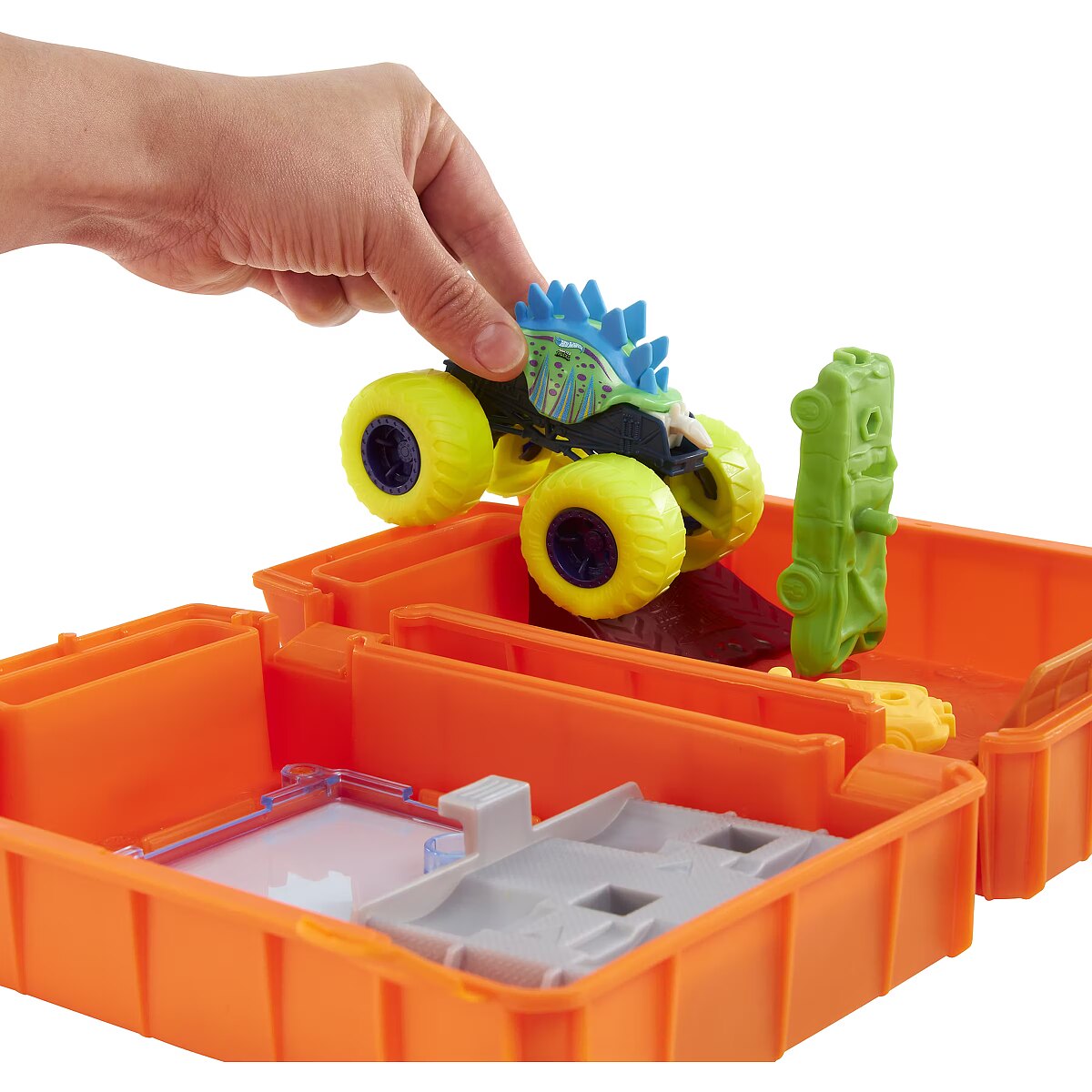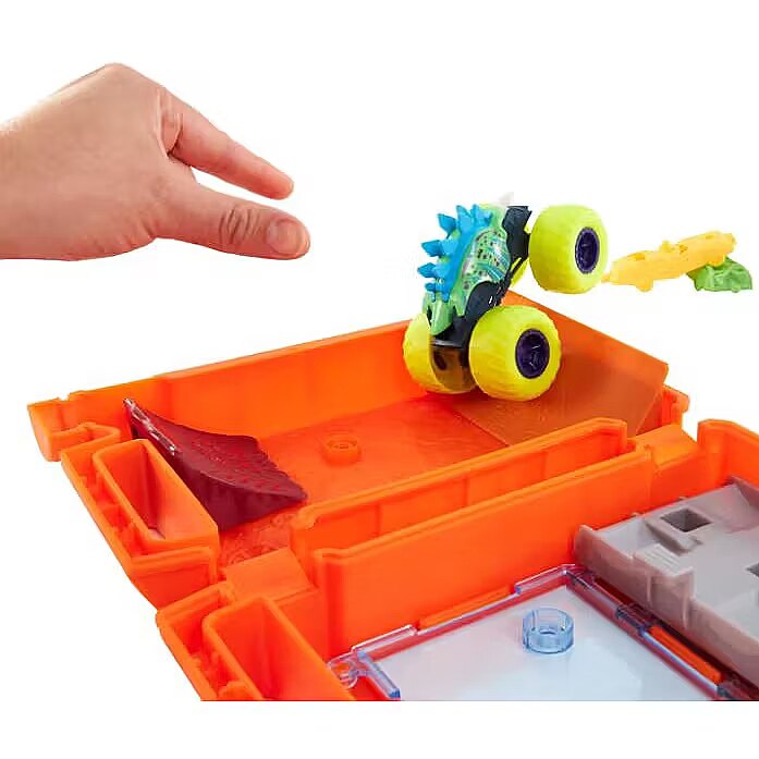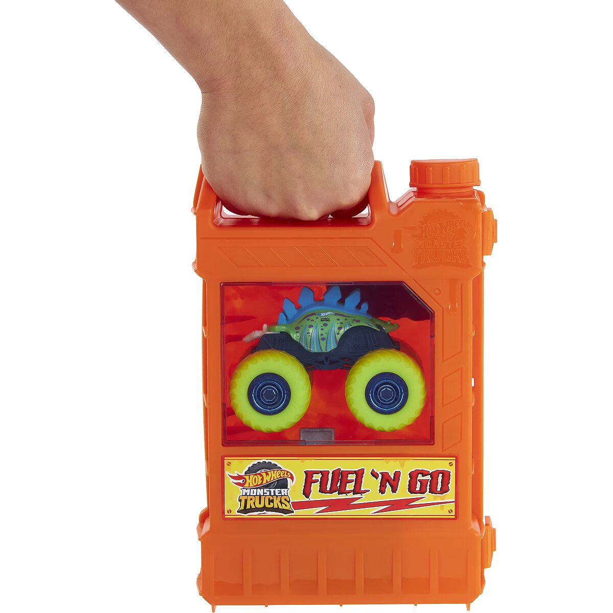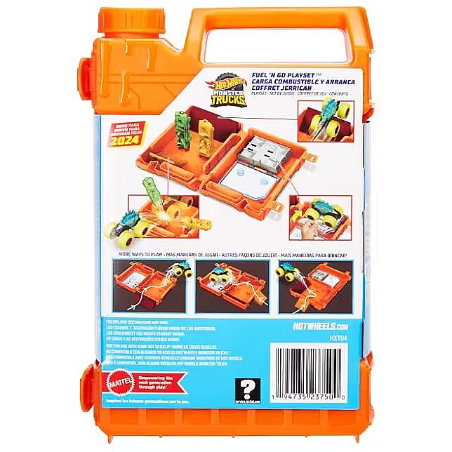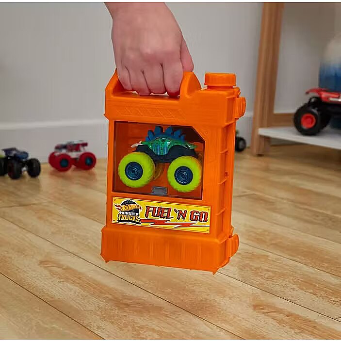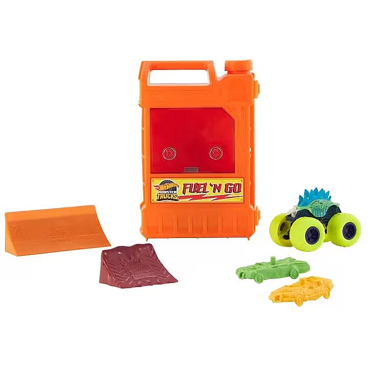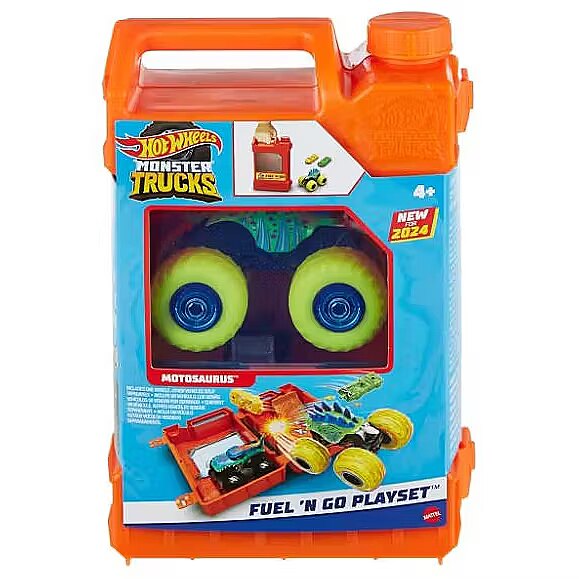 LongDesc - The Hot Wheels Monster Trucks Fuel N' Go Playset hits the gas on smashing and crashing! The set is shaped like a gas can with a window display to show off the included 1:64 scale Hot Wheels Monster Trucks Motosaurus. Open the container to reveal a mini-stunting arena with a ramp and two crushable cars. There's also a repair area where kids can drive Motosaurus onto the lift to perform any necessary repairs, then launch back into action. The fuel can doubles as a cool storage container and makes it easy to stunt on the go! Ideal for kids 4 years old and up. Colours and decorations may vary.