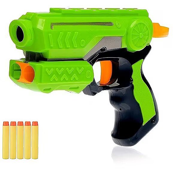description_en - Pistol firing soft foam bullets. The set includes 5 soft bullets. The dimensions of the gun without nozzle are 24x12x3 cm.