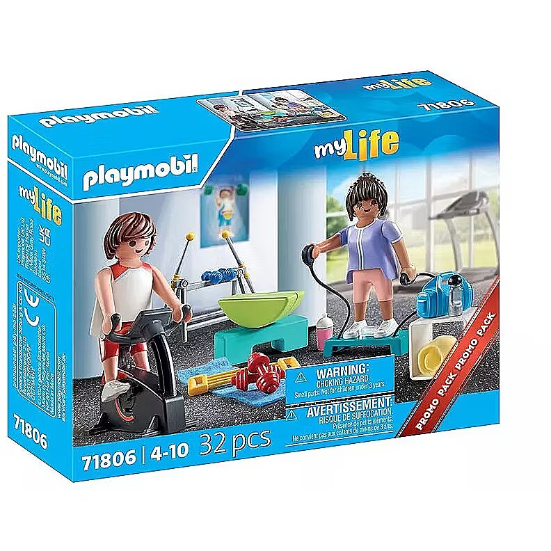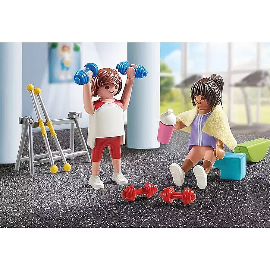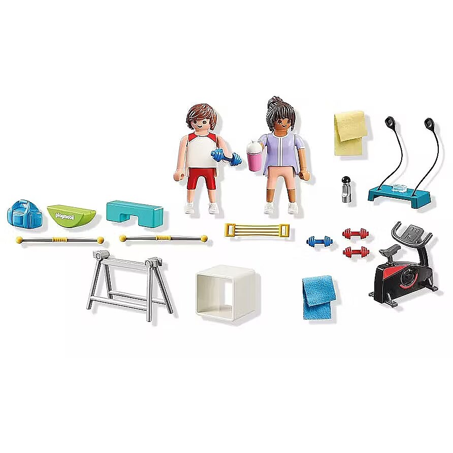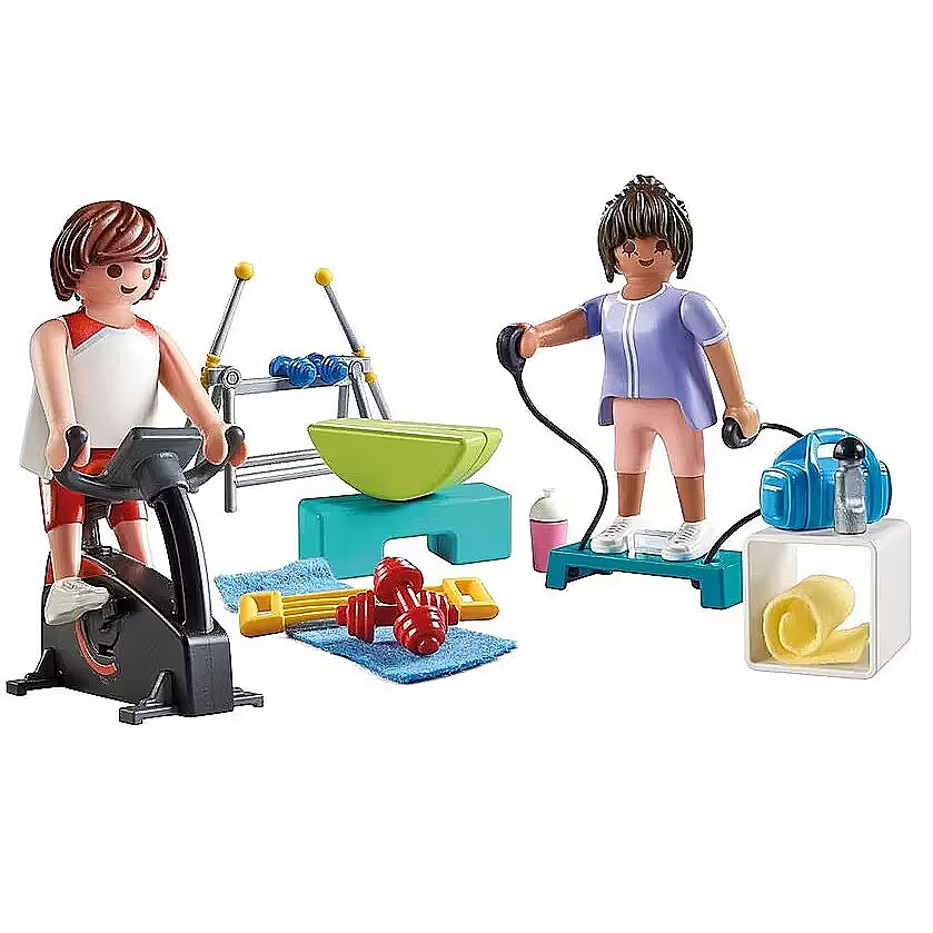 Description - And 1, and 2, and 3! Sports are on the agenda today! Even PLAYMOBIL figures want to stay fit. At the fitness training, every muscle can be trained, whether on the stepper, at the weight training station or on the exercise bike. Its time to break a sweat with the PLAYMOBIL Fitness Training set! From a stepper equipped with stretching straps and a rotating foot clamp to a fully functional exercise bike, this set offers endless ways to keep fit. Build muscle with the dumbbells or master balance and strength using the swinging bars and seesawtheres no shortage of ways to stay in shape! When its time to cool down, grab a water bottle or crank up the boombox for a lively playlist. Whether lifting, pedaling, or balancing, the PLAYMOBIL Fitness Training playset inspires kids to embrace active play and build imaginative stories full of fitness fun!