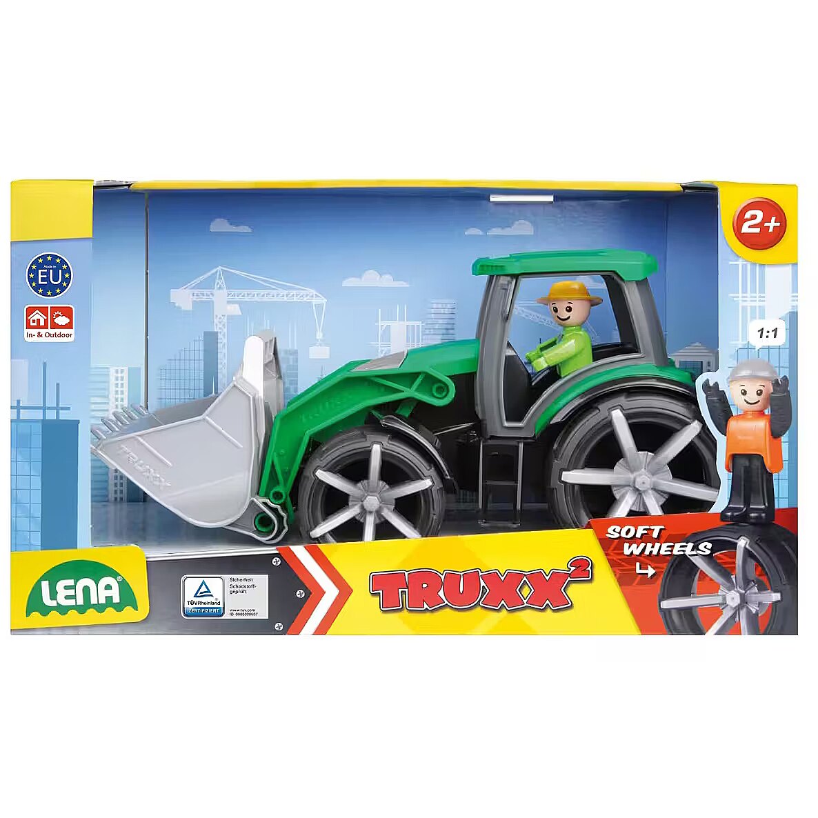 Description - Traktor LENA TRUXX 2 Nadaje się do użycia wewnątrz i na zewnątrz. Odpowiedni dla dzieci powyżej 2 roku życia. Zapakowany w kolorowe pudełko ekspozycyjne. WYPRODUKOWANY W EUROPIE. Certyfikat TÜV. Miękkie, ciche opony 4 mm ocynkowane stalowe osie Otwierana kabina kierowcy Ruchoma łopata z uchwytem Zaczep do przyczepy Figurka