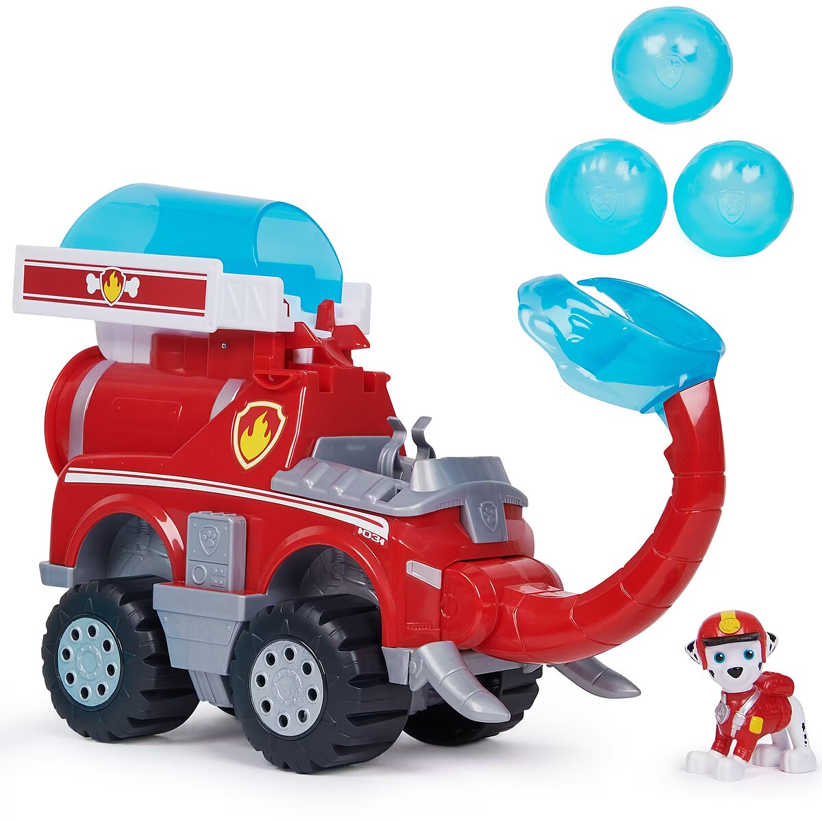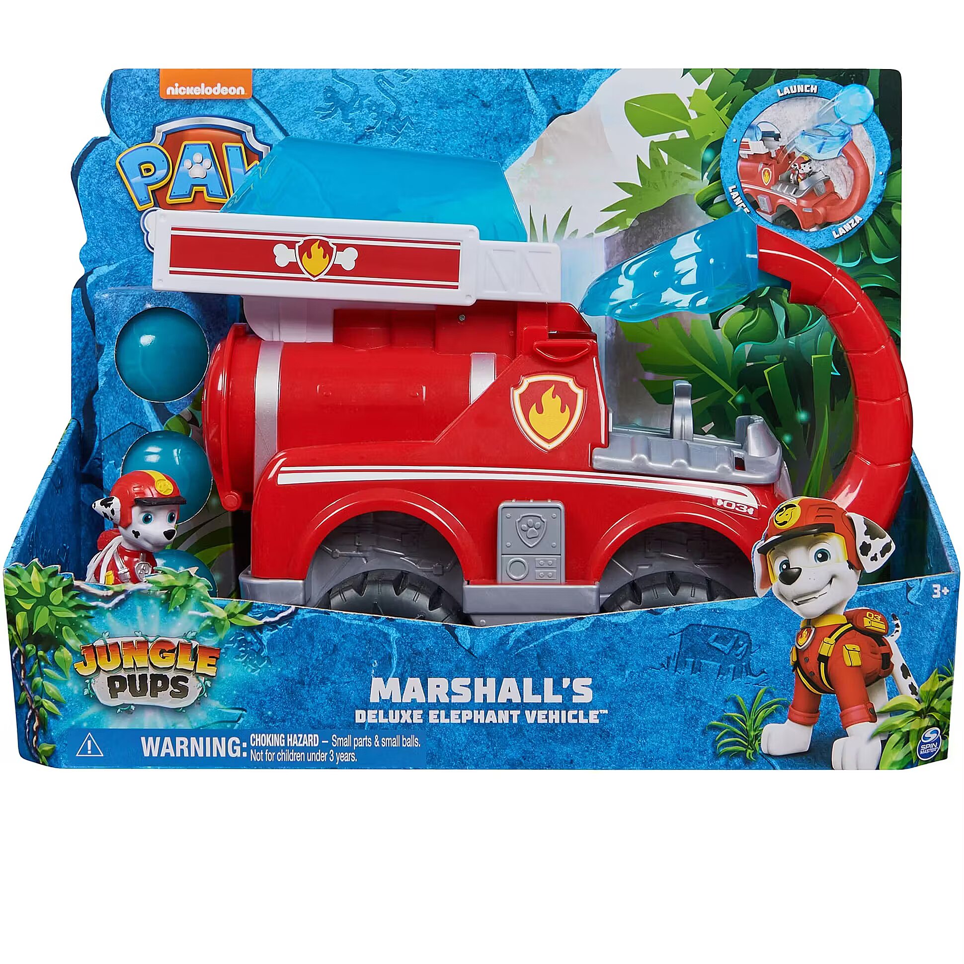 LongDesc - Team up with Marshall, in his Elephant-themed Jungle Pups vehicle, for some supercharged rescue adventures! Marshall’s elephant themed fire truck features a huge trunk, oversized wheels and two tusks, to clear away any obstacles! Open the rear compartment to get 3 projectiles and load them into the projectile feeder. Then, once you’re in position, pull back the trunk into launching position and press the rectangular button on the side, to catapult your water projectiles forward, repeating the process up to 3 times! For even more fun and exciting PAW Patrol series-inspired missions, collect all the PAW Patrol Jungle Pups toys and the PAW Patrol: The Mighty Movie toys, like the awesome Aircraft Carrier HQ and all the special edition PAW patrol toys for girls and boys, like the Mighty Pups, Aqua Pups and Big Truck Pups toy figures and playsets (each sold separately). With PAW Patrol preschool toys, a kid can explore his or her imagination, and develop their motor skills through pretend play, as they relive their favorite scenes from the shows. Enjoy endless PAWsome adventures with Marshall and his Jungle Pups Elephant Firetruck!