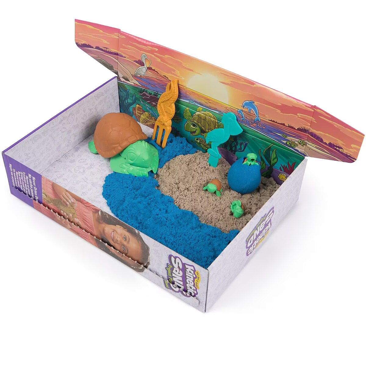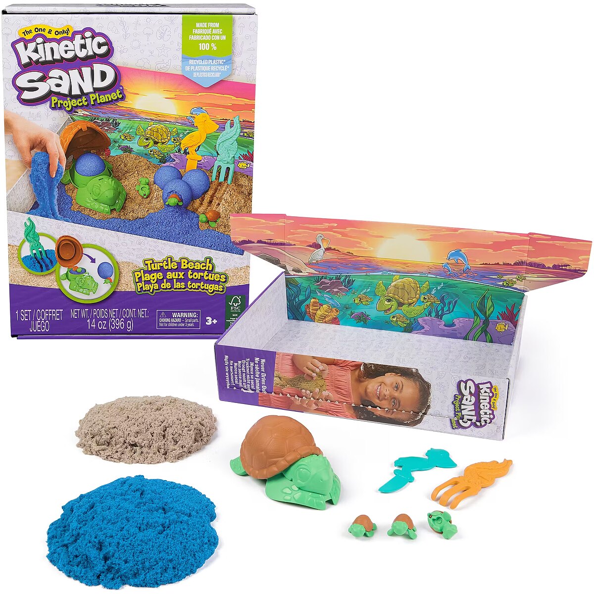 LongDesc - Experience the lifecycle of turtles with Kinetic Sand Project Planet Turtle Beach. This Kinetic Sand kit will spark imagination as kids build their own habitat and mimic returning baby turtles to the ocean. Project Planet is Kinetic Sand’s line of eco friendly sustainably minded toys, made using 100% ocean-bound recycled plastics. Discover a contained play space and 14oz blue and brown Kinetic Sand. Rake and slice with two tools and dig and mold a nest with the mother turtle. Mold eggs in her shell and hide the three baby turtles, then hatch and release them. Kids can learn about turtle lifecycles with the fact card and after play, pack everything away for convenient storage. The One and Only Kinetic Sand is made from natural sand that sticks to itself for easy cleanup. Create again and again and let it flow – it’s so satisfying. An alternative to arts and crafts modeling clay, Kinetic Sand is a welcome addition to the sensory bin or sensory table, activities time and Montessori toys. Kinetic Sand promotes fine motor skills and creativity in kids through independent tactile play. Feel the future with Kinetic Sand Project Planet Turtle Beach.Includes: 14oz Kinetic Sand, 1 Adult Turtle Mold/Tool, 1 Stork Knife, 1 Seagrass Rake, 3 Baby Turtles, 1 Eco Info Card