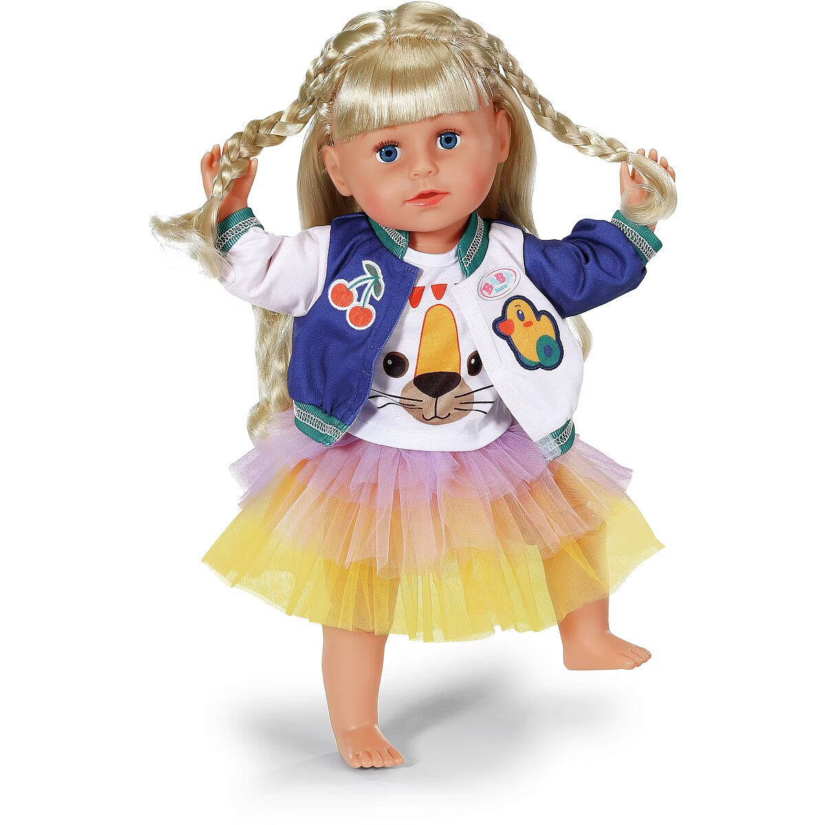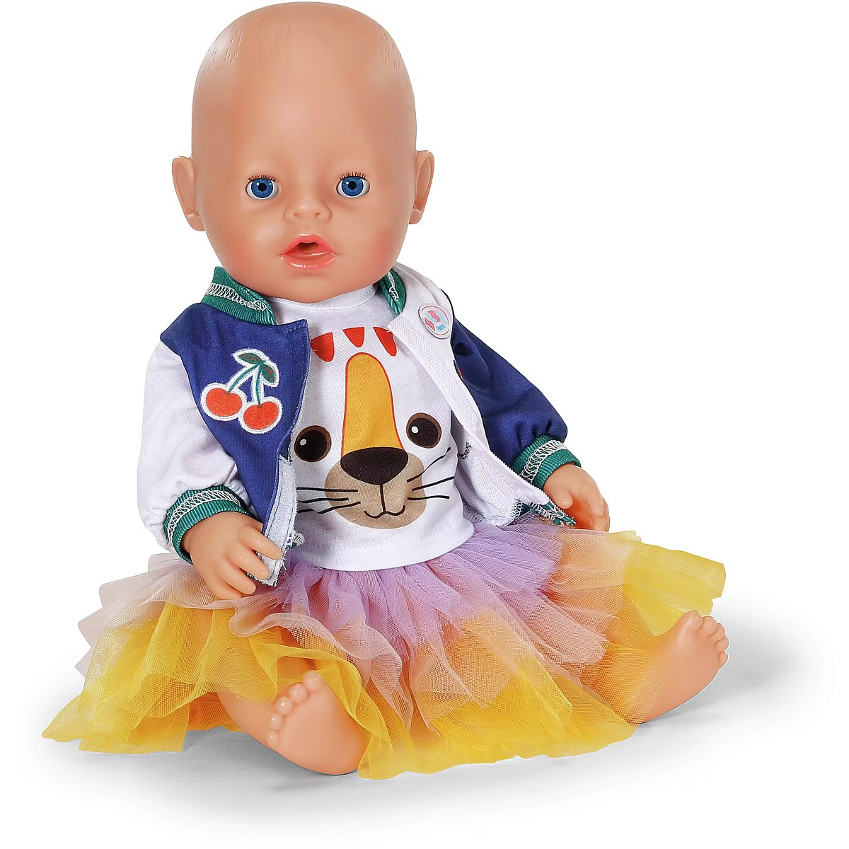 LongDesc - The tutu 3 piece outfit is super fun with a cute tiger's face on the t-shirt, a cool two-tone college jacket and a multi-coloured tutu of yellow, orange and purple. For 43cm dolls. Suitable for children aged 3+. Doll not included.