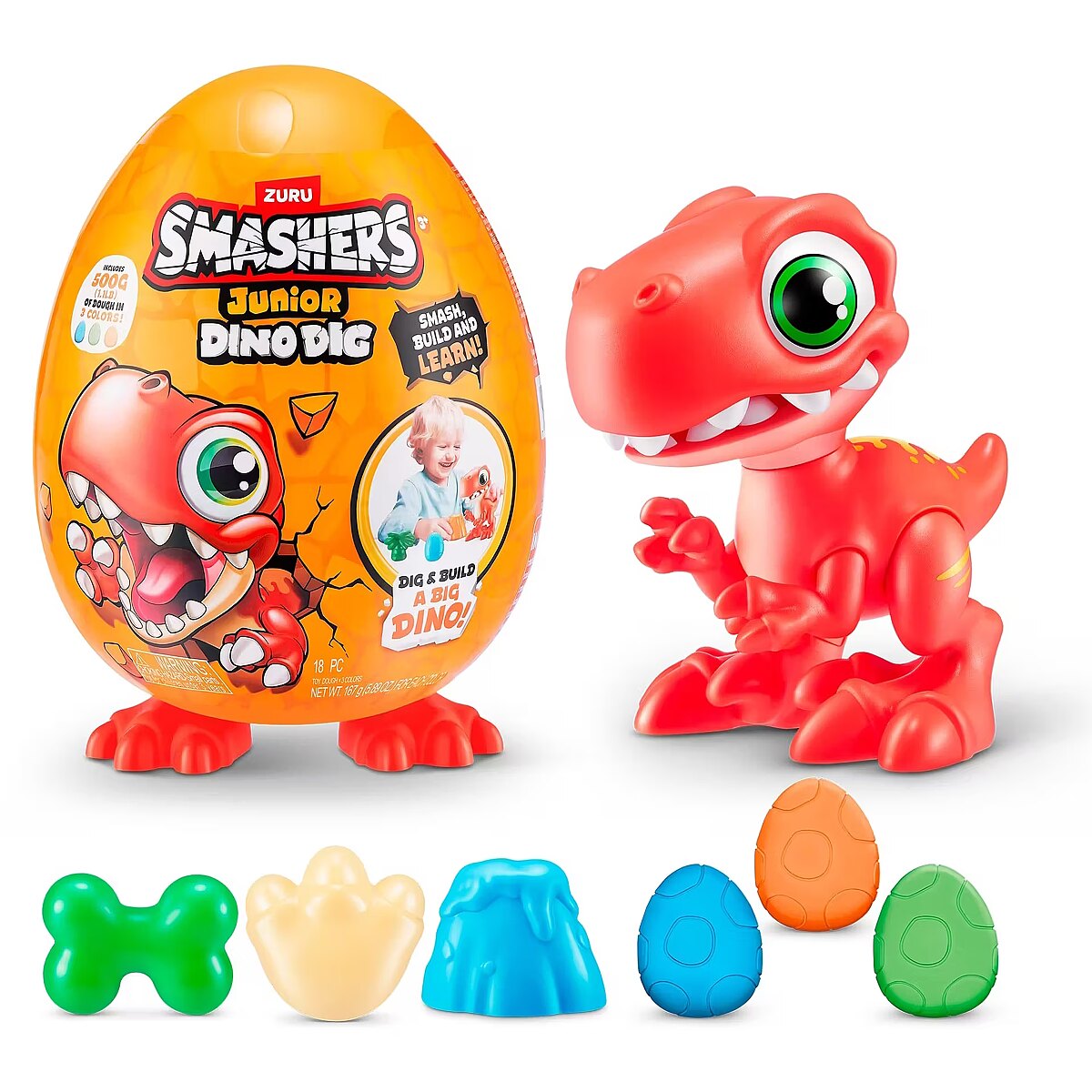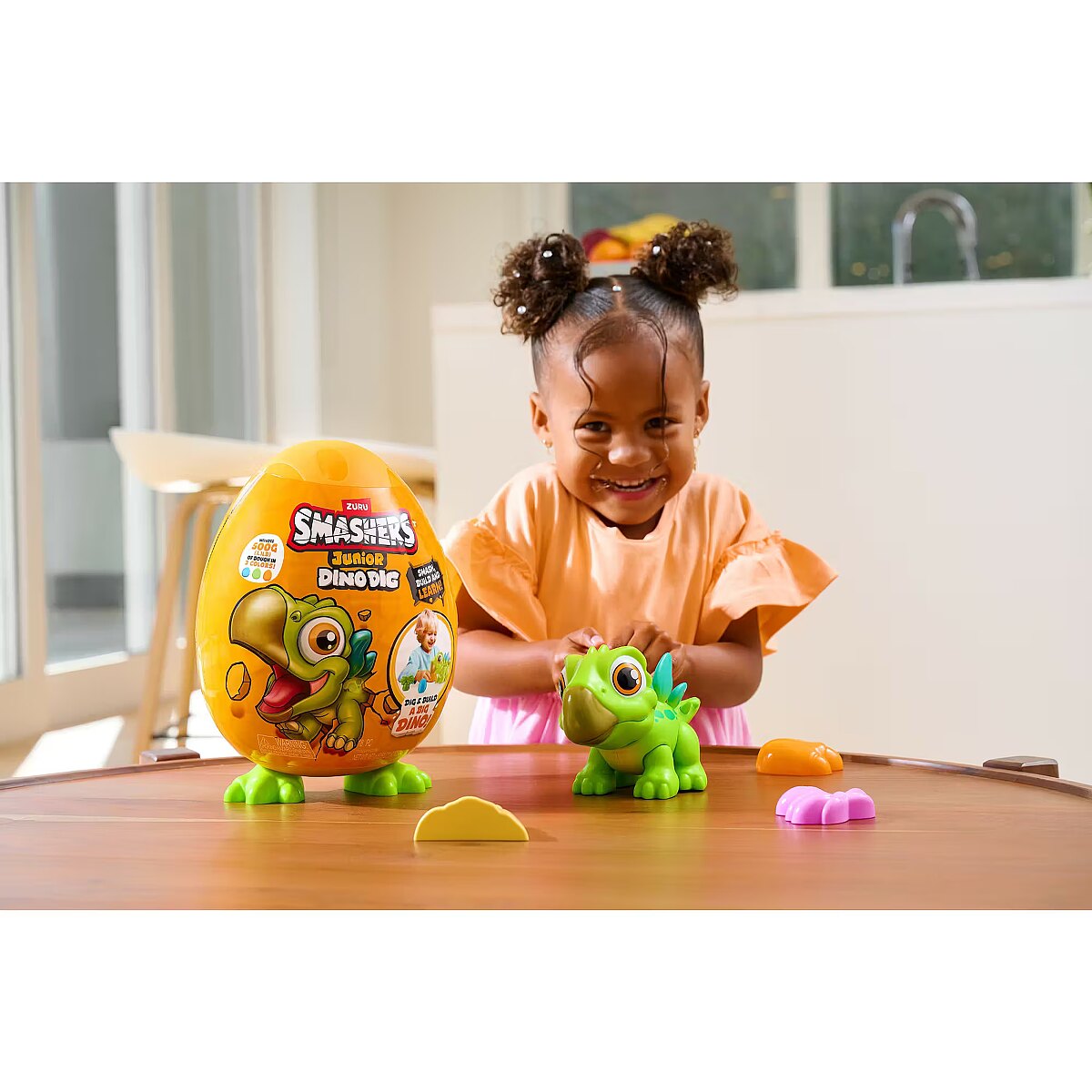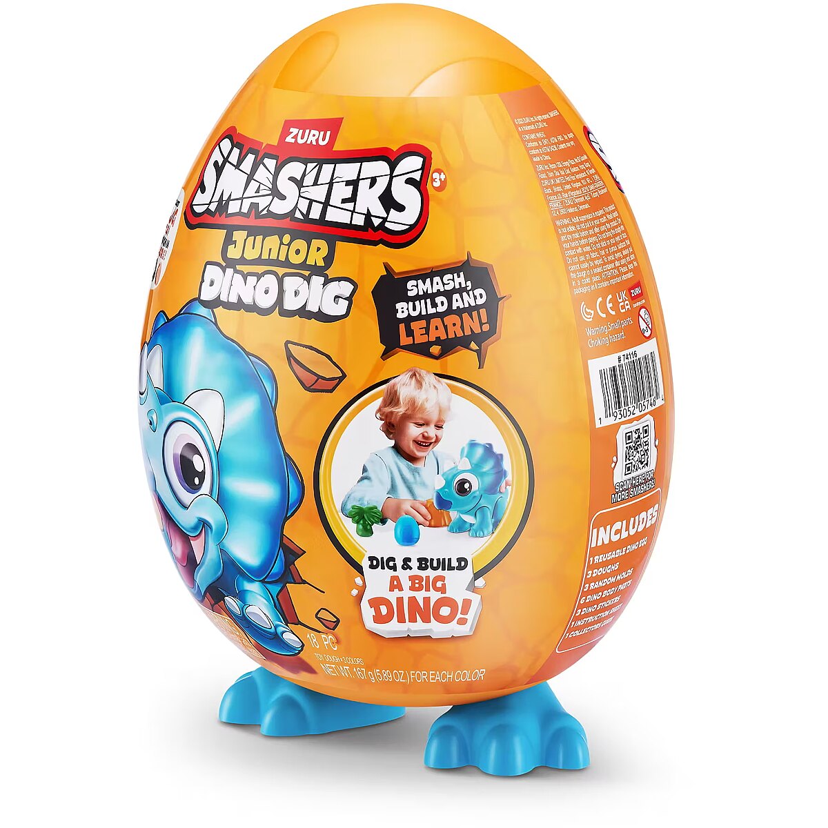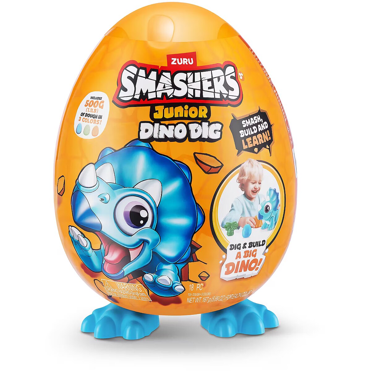 LongDesc - Smashers Junior Dino Dig Small Egg ZURUSmashers Junior Dino Dig is the BIG adventure for little explorers. Your little one will love digging through the soft dino dough and discovering hidden dinosaur pieces. Using problem solving, they’ll connect the dino pieces and create their new Dino pal. There are 18 surprises in this adorable egg including 3 molds to shape the huge 500g of dino dough! Smashers Junior is the ultimate sensory play toy and is amazing for developing young children’s fine motor skills. Start your adventure today with Smashers Junior – Smash, build and learn!