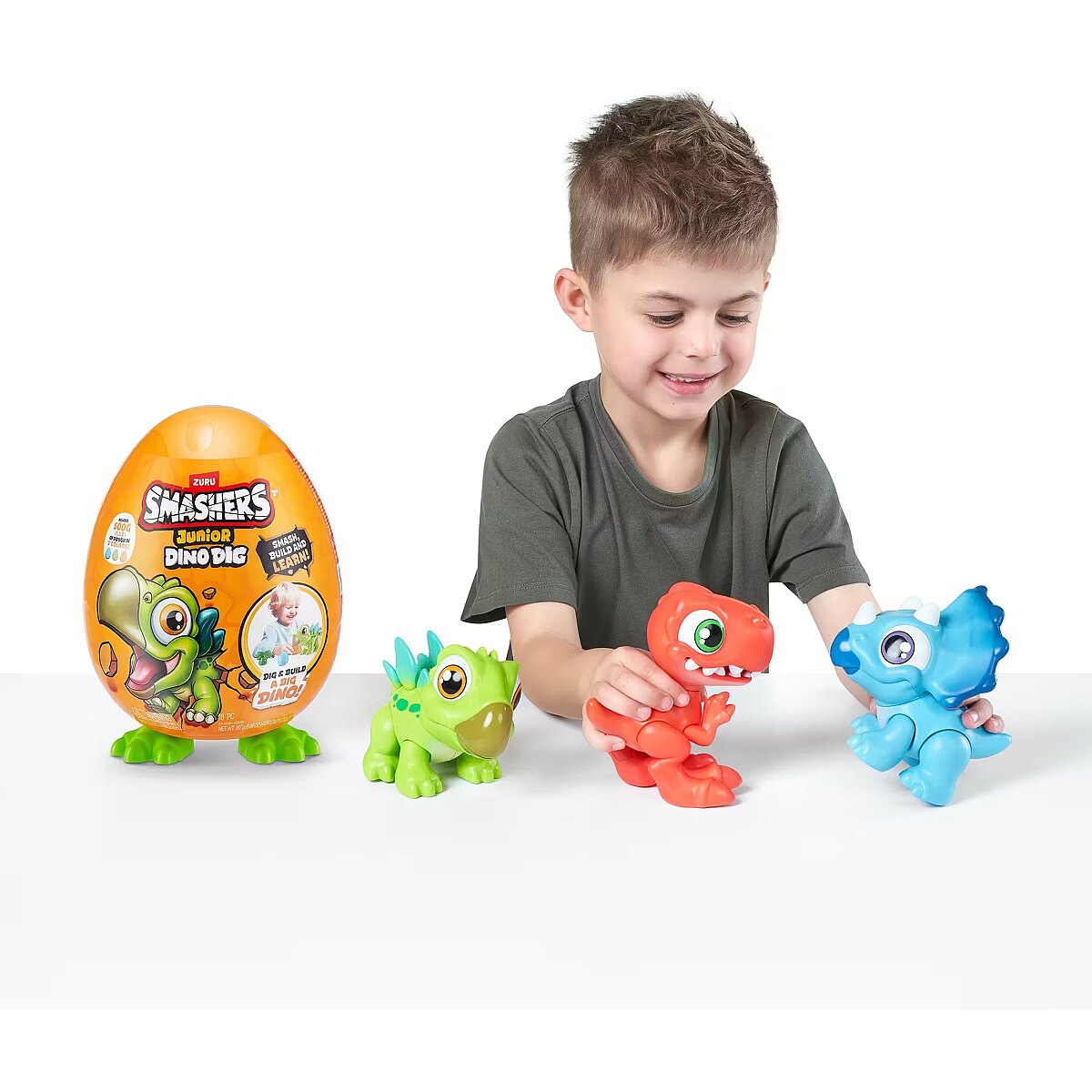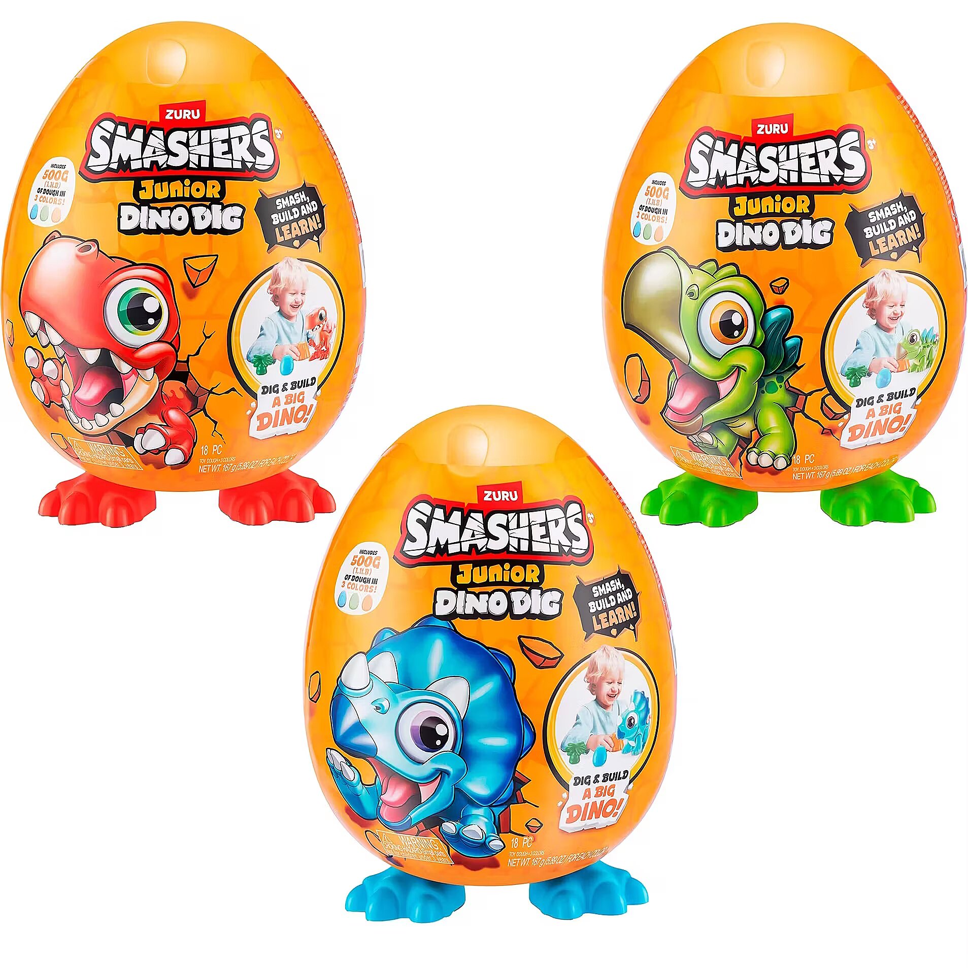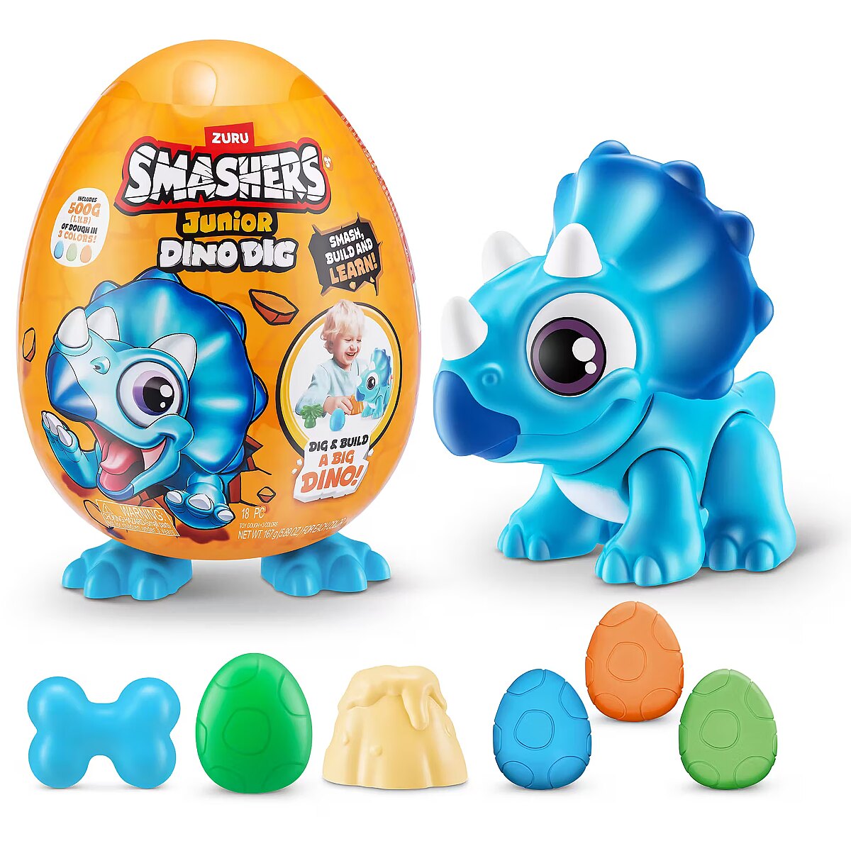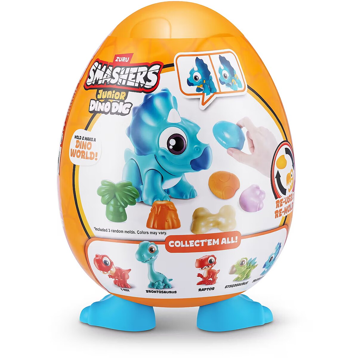 LongDesc - Smashers Junior Dino Dig Small Egg ZURUSmashers Junior Dino Dig is the BIG adventure for little explorers. Your little one will love digging through the soft dino dough and discovering hidden dinosaur pieces. Using problem solving, they’ll connect the dino pieces and create their new Dino pal. There are 18 surprises in this adorable egg including 3 molds to shape the huge 500g of dino dough! Smashers Junior is the ultimate sensory play toy and is amazing for developing young children’s fine motor skills. Start your adventure today with Smashers Junior – Smash, build and learn!