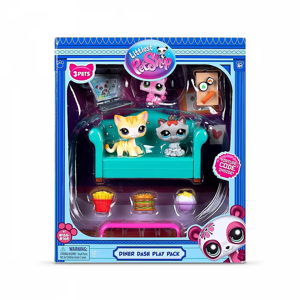 Description - Przygotuj się na przytulny podwieczorek z Littlest Pet Shop Diner Dash Play Pack!  Ten zestaw zawiera 3 urocze koty - #166 Pomarańczowy, #167 Różowy kociak i #168 Szary Kot - które są gotowe, aby zjeść z Tobą smaczny posiłek. Dzięki 6 kolorowym akcesoriom, w tym kanapie, laptopowi, burgerowi, popcornowi, sushi i frytkom, Twoje zwierzaki będą dobrze nakarmione i wygodnie spędzą razem czas. Niezależnie od tego, czy to spokojny wieczór filmowy, czy zabawne doświadczenie kulinarne, te kocurki są gotowe na wszystko!  Użyj karty kolekcjonerskiej, aby odkryć wyjątkową osobowość, poziom i rzadkość swojego zwierzaka - czy będzie najbardziej zuchwały, najbardziej elegancki, czy coś innego? Następnie użyj kodu na swojej monecie kolekcjonerskiej, aby odblokować ekscytujące cyfrowe niespodzianki, takie jak monety, klejnoty lub fajne akcesoria w wirtualnym świecie Littlest Pet Shop. W zestawie LPS Podwieczorek: 3 zwierzątka LPS  7 kolorowych akcesoriów   Karta kolekcjonerska, aby odkryć wyjątkowość Twojego zwierzaka   Wirtualny kod