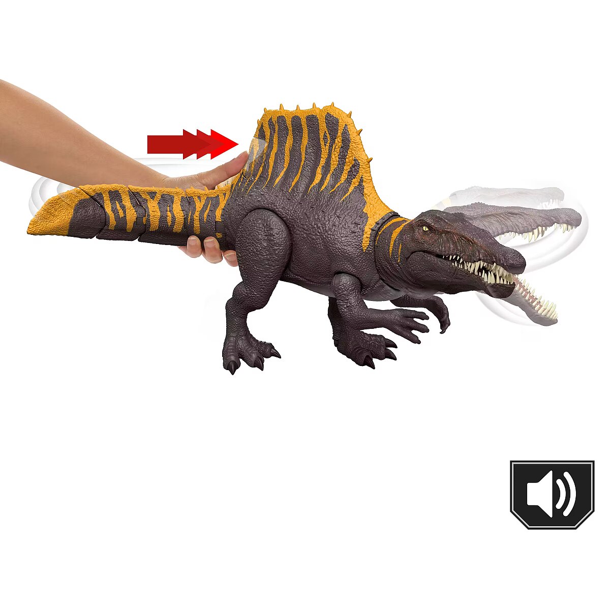 LongDesc - This Tail Thrasher Spinosaurus action figure with its authentic design and distinctive sail brings the excitement of Jurassic World Rebirth home. A button-activated dual attack provides side-to-side head action and chomp and a side-to-side tail swipe. The more times and faster the button is pressed, the greater the fierceness of the attack! Movable joints and movie-accurate design make this dinosaur figure ready for battle moves and poses. Scan the Tracking Code on the dinosaur's foot in the free Jurassic World Play App with a compatible smart device (Android or iOS, not included) to unlock a digital version of the dinosaur and play the fiercely fun game to race various vehicles on land, air and sea. Makes a great gift for dinosaur fans ages 4 years and up. Colours and decorations may vary.