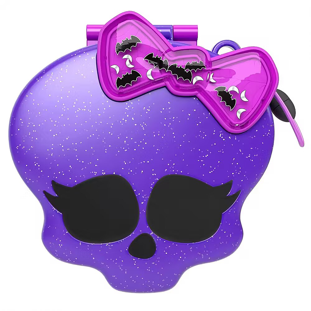 LongDesc - Fans' favourite ghouls go tiny in this Monster High x Polly Pocket collaboration compact! The iconic skullete exterior features a shaker bow filled with glitter bats and opens to reveal a spooktacular skatepark and high school. Scare up fun with three of Monster High's favourite ghols: Draculaura, Clawdeen Wolf, and Frankie Stein in micro form and 10 themed scare-cessories. Slide the bookcase to reveal a fangtastic surprise, show off some sick tricks in the skatepark, or play casket-ball with fellow ghouls! This creepy-cute compact is ideal for Monster High and Polly Pocket fans alike. Colours and decorations may vary.