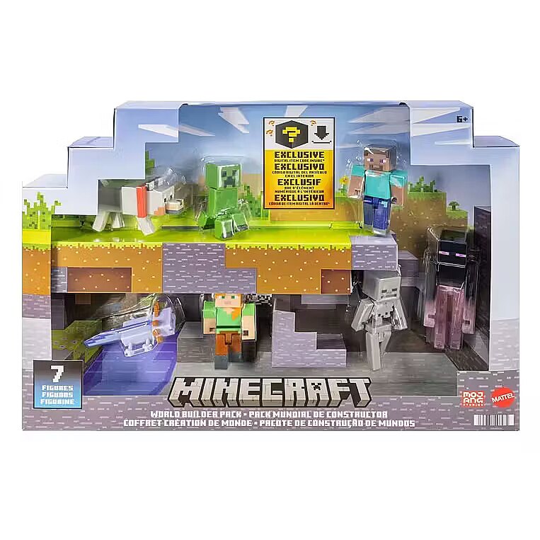 LongDesc - Fans and collectors can build their own Minecraft worlds with this epic set of seven Minecraft figures in 3.25-inch scale! Each action figure in the Minecraft World Builders Pack has been authentically created using the video game's signature pixelated design for creative learning and storytelling fun. Movable joints allow characters to strike action poses. The pack also includes one exclusive digital item code for in-game play -- parents use the code to unlock in-game content; video game is rated 10+ years old, sold separately. Makes a great gift for Minecraft fans. Colours and decorations may vary.