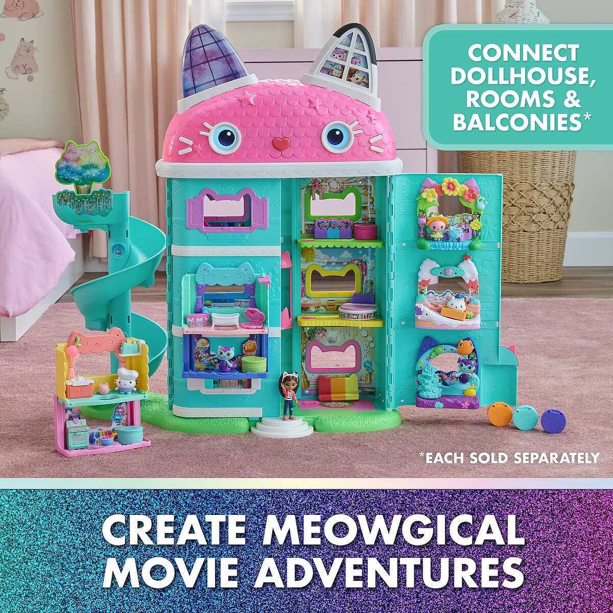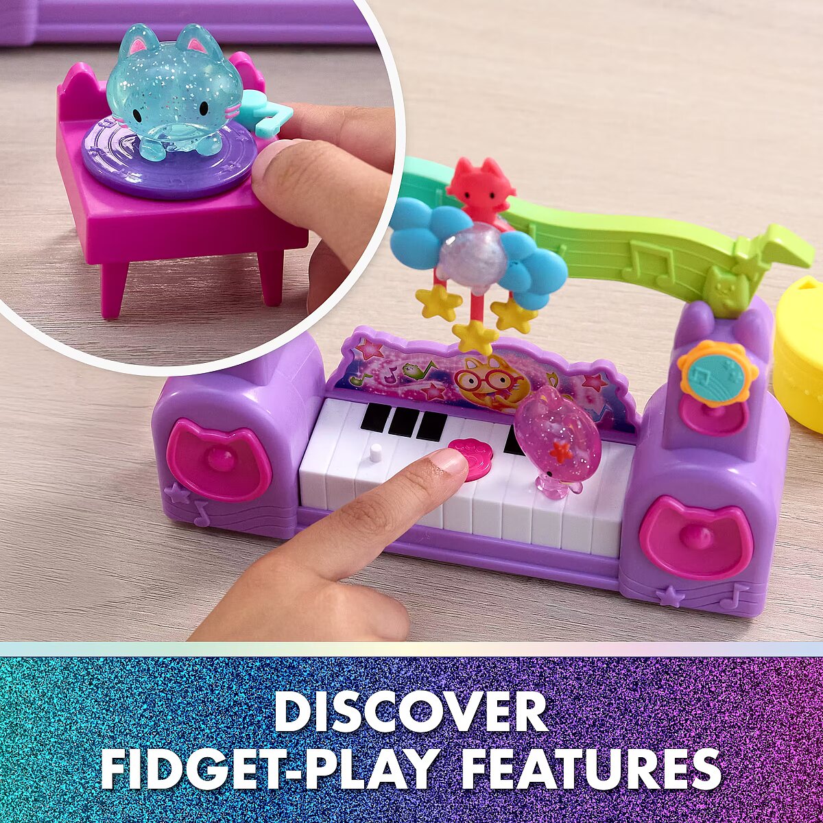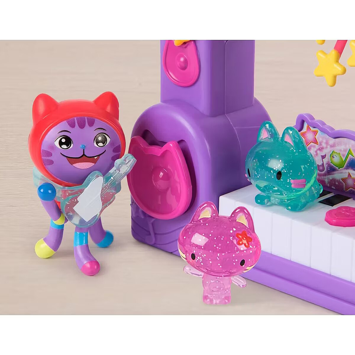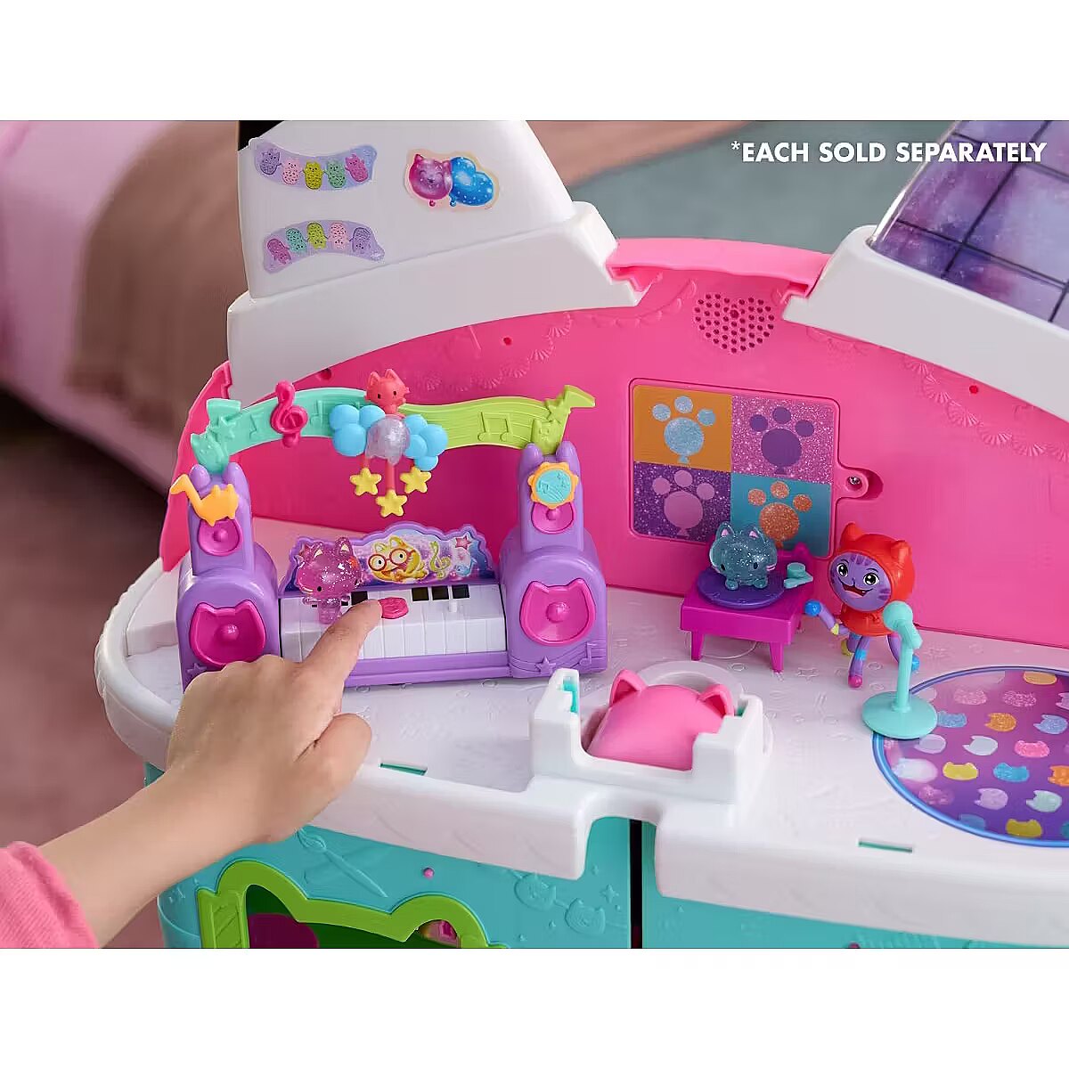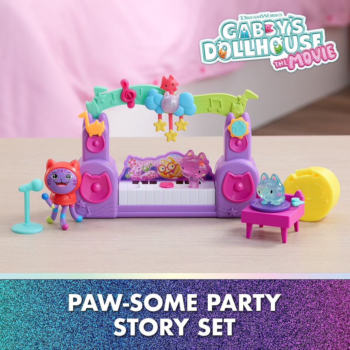 LongDesc - Enter the magical world of Gabbys Dollhouse: The Movie, with the Paw-Some Party Story Set! This set is a cat-tastic way to create the meow-mazing dance parties in the dollhouse attic, with DJ Catnip and Eraser Cat toy figures, doll house furniture and cat-terrific party-time accessories like kitty-themed speakers, a turntable, and a mic stand. (dollhouse sold separately) Make the speakers thump with Paw Bump Magic, by pushing the piano keys, then spin the turntable, and swing the disco ball for sensory & fidget play with these lovable learning toys. Unbox the Dollhouse Delivery, just like Gabby does in the show, to find a surprise accessory, then scan the QR code to unlock a surprise in the Gabby's Dollhouse app. This set is a fun-filled way to inspire pretend play and invites meow-mazing explorations, with these adorable Gabby cat toys for kids. Gabbys dollhouse toys are purrfect gifts for kids to relive cherished moments from the Gabby movie, and for creating new adventures in Gabby's dollhouse, with toddler toys for kids, like dollhouse accessories & furniture, her meow-mazing cat friends and fin-tastic mermaid toys, for endless hours of cat-terrific adventures (each sold separately)
