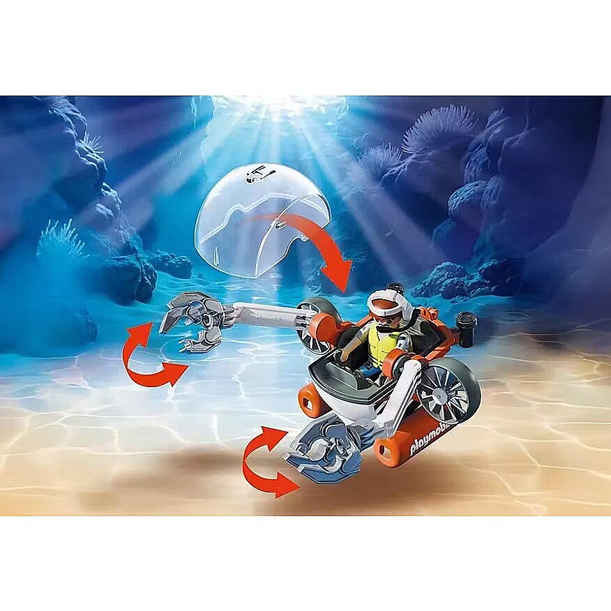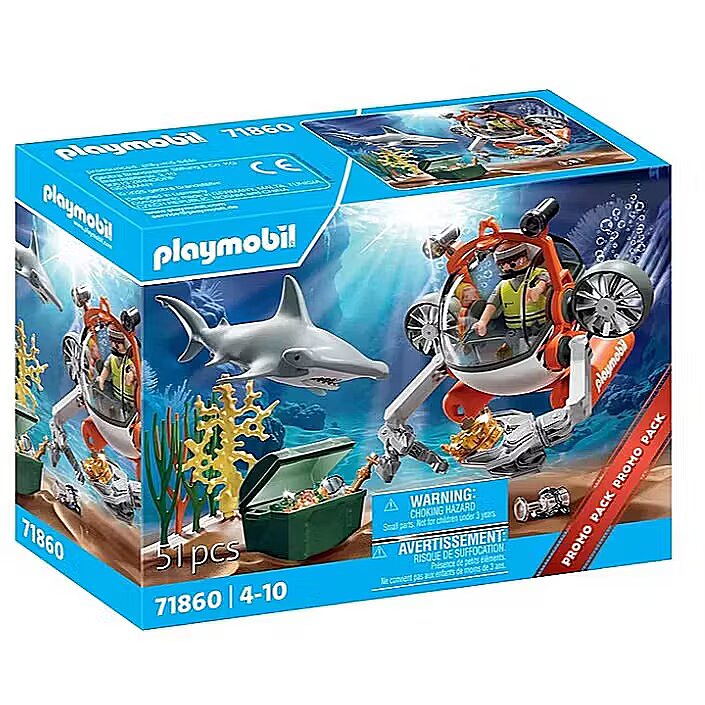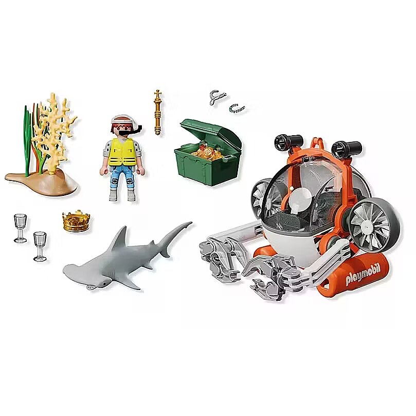 Description - Głębiny morza są ciemne i bezkresne. Kapitan łodzi podwodnej za pomocą reflektorów oświetla drogę pod wodą. Nagle błysnęło coś w oddali. To ukryta na dnie skrzynia pełna skarbów, której strzeże groźny rekin. Czy pomożesz kapitanowi łodzi podwodnej zdobyć skarb? Zanurkuj w głębinową przygodę z zestawem PLAYMOBIL Polowanie na skarb z łodzią podwodną! Wyposażona w ruchome ramiona i zdejmowaną kopułę, łódź podwodna jest gotowa, by wydobyć lśniący skarb z dna oceanu. Czy kapitanowi uda się przechytrzyć rekina młota, który strzeże drogocennej skrzyni? Dzięki sprytnej konstrukcji, łódź podwodna może unosić się na wodzie lub zanurzać - zupełnie jak prawdziwa! Pełen błyszczących klejnotów, koralowców i tajemniczych artefaktów, ten zestaw PLAYMOBIL zamienia każde nurkowanie w ekscytujące poszukiwanie złota i chwały pod falami.