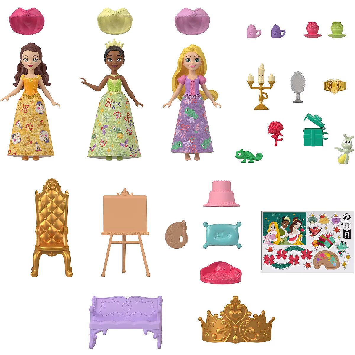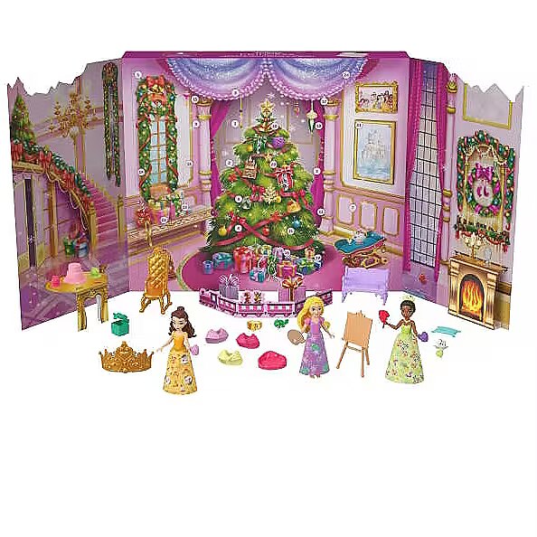 Description - Disney Princess Advent Calendar Celebrate this magical time of year with Disney Princesses and an advent calendar. Counting down the 24 days until the holidays becomes enchanting with surprises inspired by Disney movies. The gifts include three small Disney Princess dolls in festive outfits, three figures of beloved animal friends, twenty-two additional accessories, and a holiday-themed packaging. The dolls cannot stand on their own. Colors and decorative elements may vary. Countdown to the holidays with Disney Princess dolls, furniture, animal figures, and other accessories from the Advent Calendar!