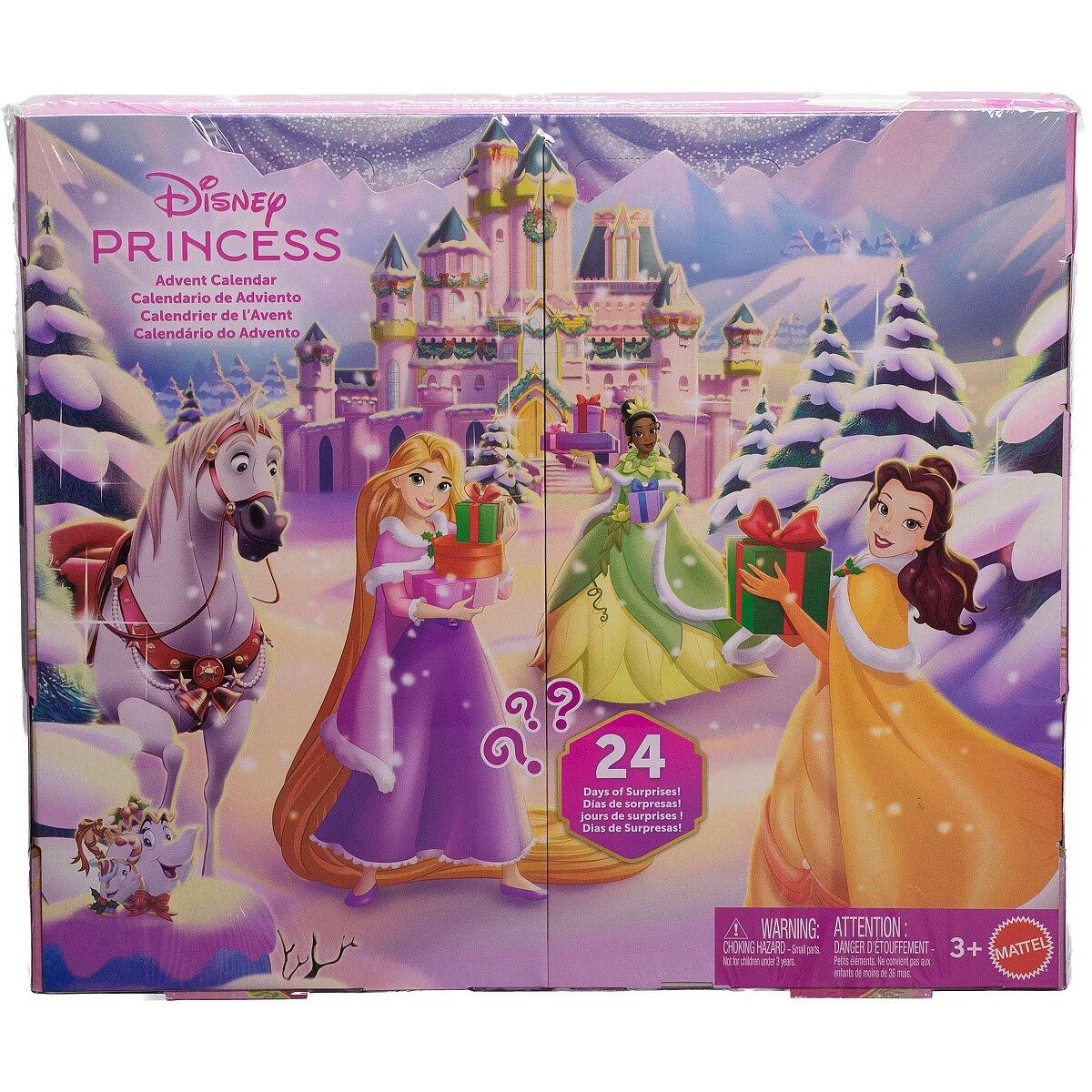 Children will joyfully get into the holiday spirit with 24 days of special gifts-opening one each day. Among the surprises are three small Disney Princess dolls (approx. 8.5 cm)-Belle, Tiana, and Rapunzel-in removable festive skirts with included winter capes.