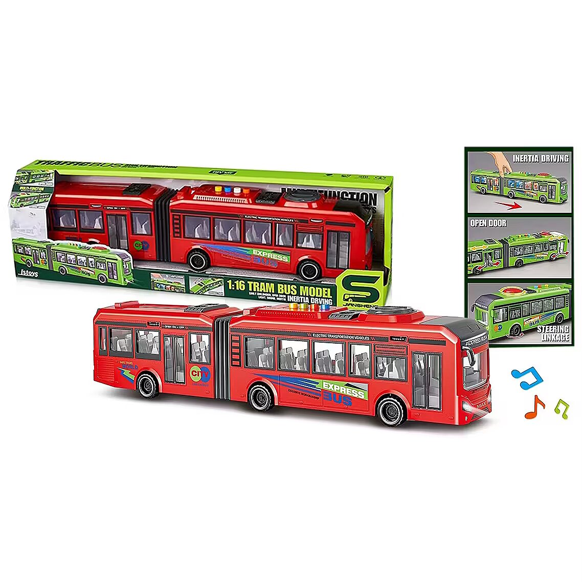 Description - Two-segment bus Friction drive The vehicle steers using a control disc on the roof. Pressing a button activates bus sounds. Melodies and interior cabin lighting. Open/close doors by turning the gear. Batteries: 3 x AG13 1.5V, included for testing. This product is shipped randomly; no specific model can be selected. Price is for 1 unit.